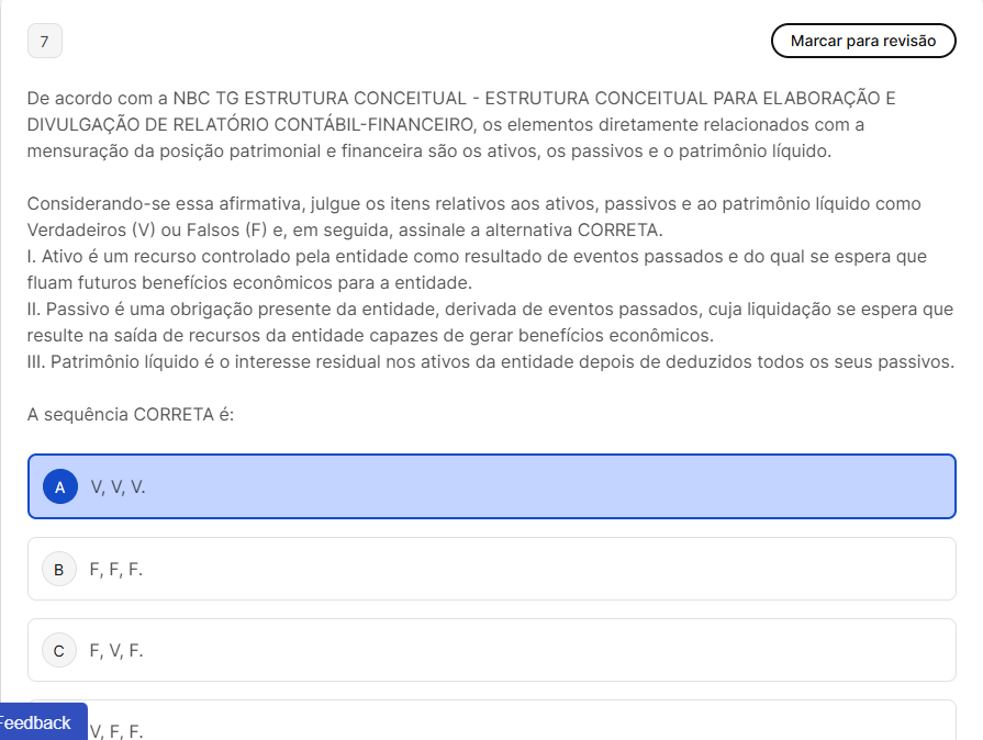 De acordo com a NBC TG ESTRUTURA CONCEITUAL - ESTRUTURA CONCEITUAL PARA ELABORAÇÃO E DIVULGAÇÃO DE RELATÓRIO CONTÁBIL-FINANCEIRO, os elementos diretamente relacionados com a mensuração da posição patrimonial e financeira são os ativos, os passivos e patrimônio líquido. Considerando-se essa afirmativa, julgue os itens relativos aos ativos, passivos e ao patrimônio líquido como Verdadeiros (V) ou Falsos (F) e, em seguida, assinale a alternativa CORRETA. I. Ativo é um recurso controlado pela entidade como resultado de eventos passados e do qual se espera que fluam futuros benefícios econômicos para a entidade. II. Passivo é uma obrigação presente da entidade, derivada de eventos passados, cuja liquidação se espera que resulte na saída de recursos da entidade capazes de gerar benefícios econômicos. III. Patrimônio líquido é interesse residual nos ativos da entidade depois de deduzidos todos os seus passivos. A V, V, V. B F, F, F. C F, V, F.