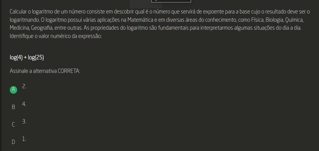 Calcular logaritmo de um número consiste em descobrir qual é número que servirá de expoente para a base cujo resultado deve ser 0 logaritmando. 0 logaritmo possui várias aplicações na Matemática e em diversas áreas do conhecimento, como Física, Biologia, Química, Medicina, Geografia, entre outras. As propriedades do logaritmo são fundamentais para interpretarmos algumas situações do dia a dia. Identifique valor numérico da expressão: log(4) + log(25) Assinale a alternativa CORRETA: A 2 B 4 C 3 D 1