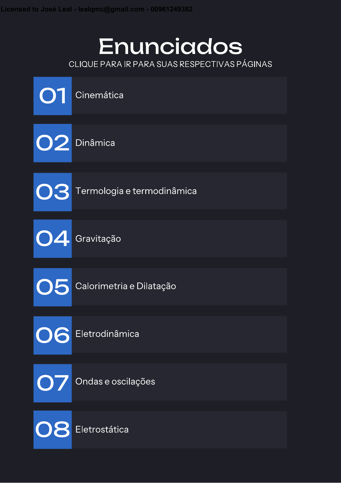 Enunciados Cinemática01 Dinâmica02 Termologia e termodinâmica03 Gravitação04 Calorimetria e Dilatação05 Eletrodinâmica06 Ondas e oscilações07 Eletrostática08 CLIQUE PARA IR PARA SUAS RESPECTIVAS PÁGINASCLIQUE PARA IR PARA SUAS RESPECTIVAS PÁGINAS Licensed to José Leal - lealqmc@gmail.com - 00961249382 Enunciados Óptica09 Energia e potência10 Hidrostática11 Magnetismo12 Estática13 Física moderna14 CLIQUE PARA IR PARA SUAS RESPECTIVAS PÁGINASCLIQUE PARA IR PARA SUAS RESPECTIVAS PÁGINAS Licensed to José Leal - lealqmc@gmail.com - 00961249382 Olá, tudo certo? Caso você encontre algum erro, por favor envie um e-mail para contato@fisicabase se possível com o assunto "Erro em questões de matemática do ENEM" para que a gente possa corrigir! Bons estudos! Obrigado! Licensed to José Leal - lealqmc@gmail.com - 00961249382 Cinemática Licensed to José Leal - lealqmc@gmail.com - 00961249382 ENEM - FÍSICA CINEMÁTICA Questão 1 (2009) No mundial de 2007, o americano Bernard Lagat, usando pela primeira vez uma sapatilha 34% mais leve do que a média, conquistou o ouro na corrida de 1.500 metros com um tempo de 3,58 minutos. No ano anterior, em 2006, ele havia ganhado medalha de ouro com um tempo de 3,65 minutos nos mesmos 1.500 metros. Revista Veja, São Paulo, ago. 2008 (adaptado). Sendo assim, a velocidade média do atleta aumentou em aproximadamente (A) 1,05%. (B) 2,00%. (C) 4,11%. (D) 4,19%. (E) 7,00%. Questão 2 (2009) O Brasil pode se transformar no primeiro país das Américas a entrar no seleto grupo das nações que dispõem de trens-bala. O Ministério dos Transportes prevê o lançamento do edital de licitação internacional para a construção da ferrovia de alta velocidade Rio-São Paulo. A viagem ligará os 403 quilômetros entre a Central do Brasil, no Rio, e a Estação da Luz, no centro da capital paulista, em uma hora e 25 minutos. Disponível em: http://oglobo.globo.com. Acesso em: 14 jul. 2009. Devido à alta velocidade, um dos problemas a ser enfrentado na escolha do trajeto que será percorrido pelo trem é o dimensionamento das curvas. Considerando-se que uma aceleração lateral confortável para os passageiros e segura para o trem seja de 0,1 g, em que g é a aceleração da gravidade (considerada igual a 10 m/s2), e que a velocidade do trem se mantenha constante em todo o percurso, seria correto prever que as curvas existentes no trajeto deveriam ter raio de curvatura mínimo de, aproximadamente, (A) 80 m. (B) 430 m. (C) 800 m. (D) 1.600 m. (E) 6.400 m. Questão 3 (2011) Para medir o tempo de reação de uma pessoa, pode-se realizar a seguinte experiência: • I. Mantenha uma régua (com cerca de 30 cm) suspensa verticalmente, segurando-a pela extremidade superior, de modo que o zero da régua esteja situado na extremidade inferior. • II. A pessoa deve colocar os dedos de sua mão, em forma de pinça, próximos do zero da régua, sem tocá-la. • III. Sem aviso prévio, a pessoa que estiver segurando a régua deve soltá-la. A outra pessoa deve procurar segurá-la o mais rapidamente possível e observar a posição onde conseguiu segurar a régua, isto é, a distância que ela percorre durante a queda. O quadro seguinte mostra a posição em que três pessoas conseguiram segurar a régua e os respectivos tempos de reação. Distância percorrida pela régua durante a queda(metro) Tempo de reação (segundo) 0,30 0,24 0,15 0,17 0,10 0,14 Licensed to José Leal - lealqmc@gmail.com - 00961249382 Disponível em: http://br.geocities.com. Acesso em: 1 fev. 2009. A distância percorrida pela régua aumenta mais rapidamente que o tempo de reação porque a: (A) energia mecânica da régua aumenta, o que a faz cair mais rápido. (B) resistência do ar aumenta, o que faz a régua cair com menor velocidade. (C) aceleração de queda da régua varia, o que provoca um movimento acelerado. (D) força peso da régua tem valor constante, o que gera um movimento acelerado. (E) velocidade da régua é constante, o que provoca uma passagem linear de tempo. Questão 4 (2012) Uma empresa de transportes precisa efetuar a entrega de uma encomenda o mais breve possível. Para tanto, a equipe de logística analisa o trajeto desde a empresa até o local da entrega. Ela verifica que o trajeto apresenta dois trechos de distâncias diferentes e velocidades máximas permitidas diferentes. No primeiro trecho, a velocidade máxima permitida é de 80 km/h e a distância a ser percorrida é de 80 km. No segundo trecho, cujo comprimento vale 60 km, a velocidade máxima permitida é 120 km/h. Supondo que as condições de trânsito sejam favoráveis para que o veículo da empresa ande continuamente na velocidade máxima permitida, qual será o tempo necessário, em horas, para a realização da entrega? (A) 0,7 (B) 1,4 (C) 1,5 (D) 2,0 (E) 3,0 Licensed to José Leal - lealqmc@gmail.com - 00961249382 Questão 5 (2012) Para melhorar a mobilidade urbana na rede metroviária é necessário minimizar o tempo entre estações. Para isso a administração do metrô de uma grande cidade adotou o seguinte procedimento entre duas estações: a locomotiva parte do repouso com aceleração constante por um terço do tempo de percurso, mantém a velocidade constante por outro terço e reduz sua velocidade com desaceleração constante no trecho final, até parar. Qual é o gráfico de posição (eixo vertical) em função do tempo (eixo horizontal) que representa o movimento desse trem? (A) (B) (C) (D) (E) Questão 6 (2013) Em um dia sem vento, ao saltar de um avião, um paraquedista cai verticalmente até atingir a velocidade limite. No instante em que o paraquedas é aberto (instante TA), ocorre a diminuição de sua velocidade de queda. Algum tempo após a abertura do paraquedas, ele passa a ter velocidade de queda constante, que possibilita sua aterrissagem em segurança. Que gráfico representa a força resultante sobre o paraquedista, durante o seu movimento de queda? Licensed to José