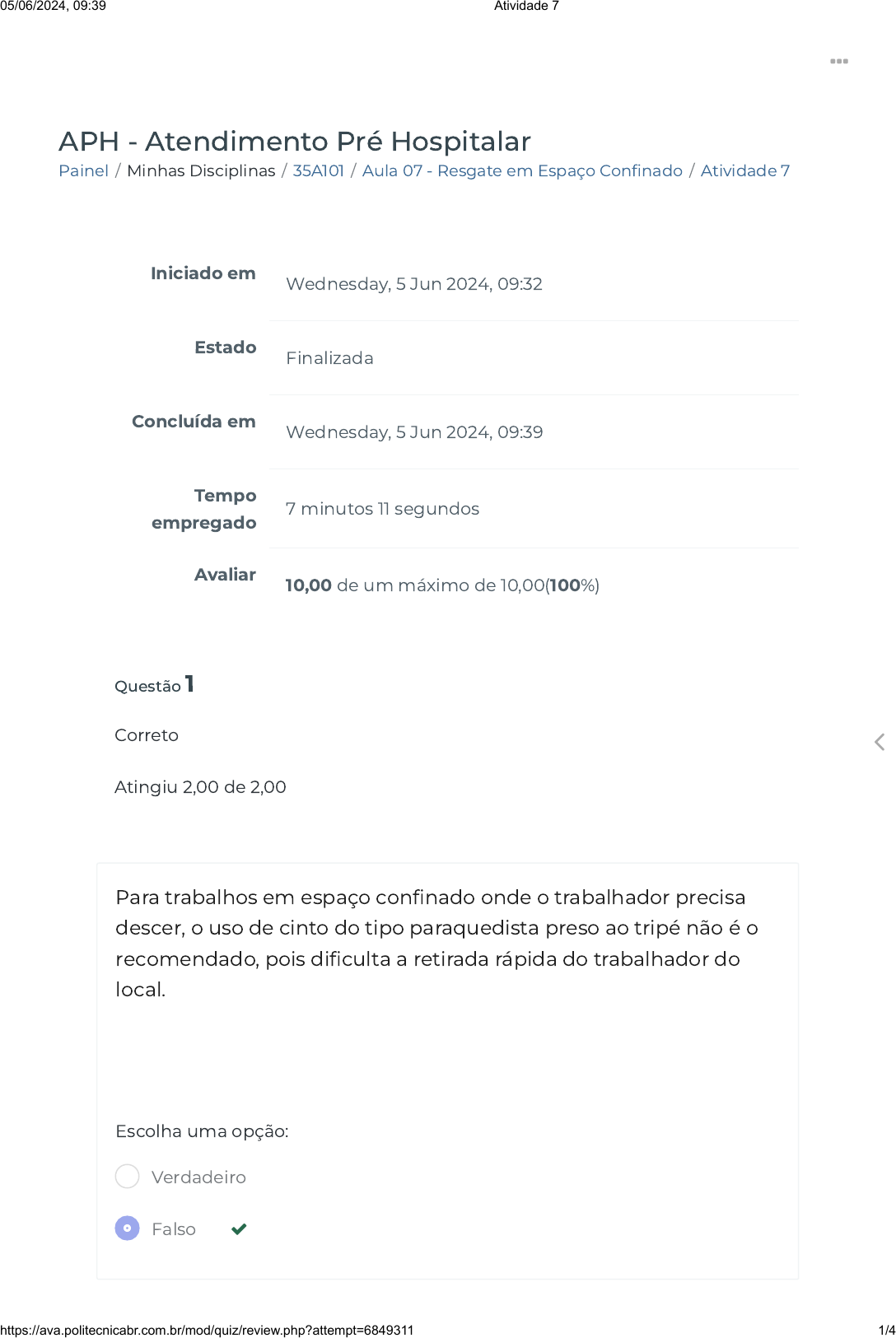Painel / Minhas Disciplinas / 35A101 / Aula 07 - Resgate em Espaço Con�nado / Atividade 7 APH - Atendimento Pré Hospitalar Iniciado em Wednesday, 5 Jun 2024, 09:32 Estado Finalizada Concluída em Wednesday, 5 Jun 2024, 09:39 Tempo empregado 7 minutos 11 segundos Avaliar 10,00 de um máximo de 10,00(100%) Questão 1 Correto Atingiu 2,00 de 2,00 Para trabalhos em espaço con�nado onde o trabalhador precisa descer, o uso de cinto do tipo paraquedista preso ao tripé não é o recomendado, pois di�culta a retirada rápida do trabalhador do local. Escolha uma opção: Verdadeiro Falso 05/06/2024, 09:39 Atividade 7 https://ava.politecnicabr.com.br/mod/quiz/review.php?attempt=6849311 1/4 https://ava.politecnicabr.com.br/my/ https://ava.politecnicabr.com.br/my/ https://ava.politecnicabr.com.br/course/view.php?id=1023 https://ava.politecnicabr.com.br/course/view.php?id=1023#section-8 https://ava.politecnicabr.com.br/mod/quiz/view.php?id=26352 https://ava.politecnicabr.com.br/ Questão 2 Correto Atingiu 2,00 de 2,00 Existem três classes de condições no ambiente de espaços con�nados: Concentrações inadequadas de oxigênio, Presença de gases e/ou vapores tóxicos e Presença de gases e/ou vapores in�amáveis. Escolha uma opção: Questão 3 Correto Atingiu 2,00 de 2,00 Espaço con�nado é um projeto que tem: aberturas limitadas para entrada e saída, ventilação natural desfavorável que poderia conter ou produzir contaminantes perigosos no ar, e que não está previsto para ocupação humana contínua. Escolha uma opção: Verdadeiro Falso Verdadeiro Falso 05/06/2024, 09:39 Atividade 7 https://ava.politecnicabr.com.br/mod/quiz/review.php?attempt=6849311 2/4 https://ava.politecnicabr.com.br/ Questão 4 Correto Atingiu 2,00 de 2,00 Qual Norma Regulamentadora do Ministério do Trabalho trata do tema relacionado ao trabalho em espaço con�nado? Escolha uma opção: Questão 5 Correto Atingiu 2,00 de 2,00 No uso de cilindro de abandono no trabalho em espaço con�nado, qual a autonomia de uso do referido equipamento? Escolha uma opção: a. NR - 10 b. NR - 35 c. NR - 33 d. NR - 30 a. 10 a 20 minutos de autonomia b. 30 a 40 minutos de autonomia c. 20 a 30 minutos de autonomia d. 25 a 35 minutos de autonomia 05/06/2024, 09:39 Atividade 7 https://ava.politecnicabr.com.br/mod/quiz/review.php?attempt=6849311 3/4 https://ava.politecnicabr.com.br/ © 2022 - Escola Politécnica Brasileira Entre em Contato https://www.politecnicabr.com.br 0800 084 2627 0800 084 2627 Links Úteis Dicas da nossa Diretora Acadêmica Planner de Estudos Declaração de Matrícula Orientações do AVA Abertura de Ticket Fale com o Tutor Cronograma de Estudos Manual de Estágio Manual de Competência Siga-nos nas redes sociais 05/06/2024, 09:39 Atividade 7 https://ava.politecnicabr.com.br/mod/quiz/review.php?attempt=6849311 4/4 https://ava.politecnicabr.com.br/mod/quiz/0 https://ava.politecnicabr.com.br/mod/quiz/0 https://www.politecnicabr.com.br/ https://soundcloud.com/user-501638417/sets/escola-politecnica-brasileira https://soundcloud.com/user-501638417/sets/escola-politecnica-brasileira https://storage.googleapis.com/sirius-pubstore/semestre_plannerdeestudo%20poli.pdf https://storage.googleapis.com/sirius-pubstore/semestre_plannerdeestudo%20poli.pdf https://storage.googleapis.com/sirius-pubstore/declaracao_matricula.pdf https://storage.googleapis.com/sirius-pubstore/declaracao_matricula.pdf https://storage.googleapis.com/sirius-pubstore/orientacoes_ava.pdf https://storage.googleapis.com/sirius-pubstore/orientacoes_ava.pdf https://storage.googleapis.com/sirius-pubstore/abertura_ticket.pdf https://storage.googleapis.com/sirius-pubstore/abertura_ticket.pdf https://storage.googleapis.com/sirius-pubstore/fale_com_tutor.pdf https://storage.googleapis.com/sirius-pubstore/fale_com_tutor.pdf https://storage.googleapis.com/sirius-pubstore/cronograma_estudos.pdf https://storage.googleapis.com/sirius-pubstore/cronograma_estudos.pdf https://storage.googleapis.com/sirius-pubstore/manual_estagio.pdf https://storage.googleapis.com/sirius-pubstore/manual_estagio.pdf https://storage.googleapis.com/sirius-pubstore/manual_competencia.pdf https://storage.googleapis.com/sirius-pubstore/manual_competencia.pdf https://www.facebook.com/politecnicabr https://www.instagram.com/politecnicabr_oficial https://ava.politecnicabr.com.br/