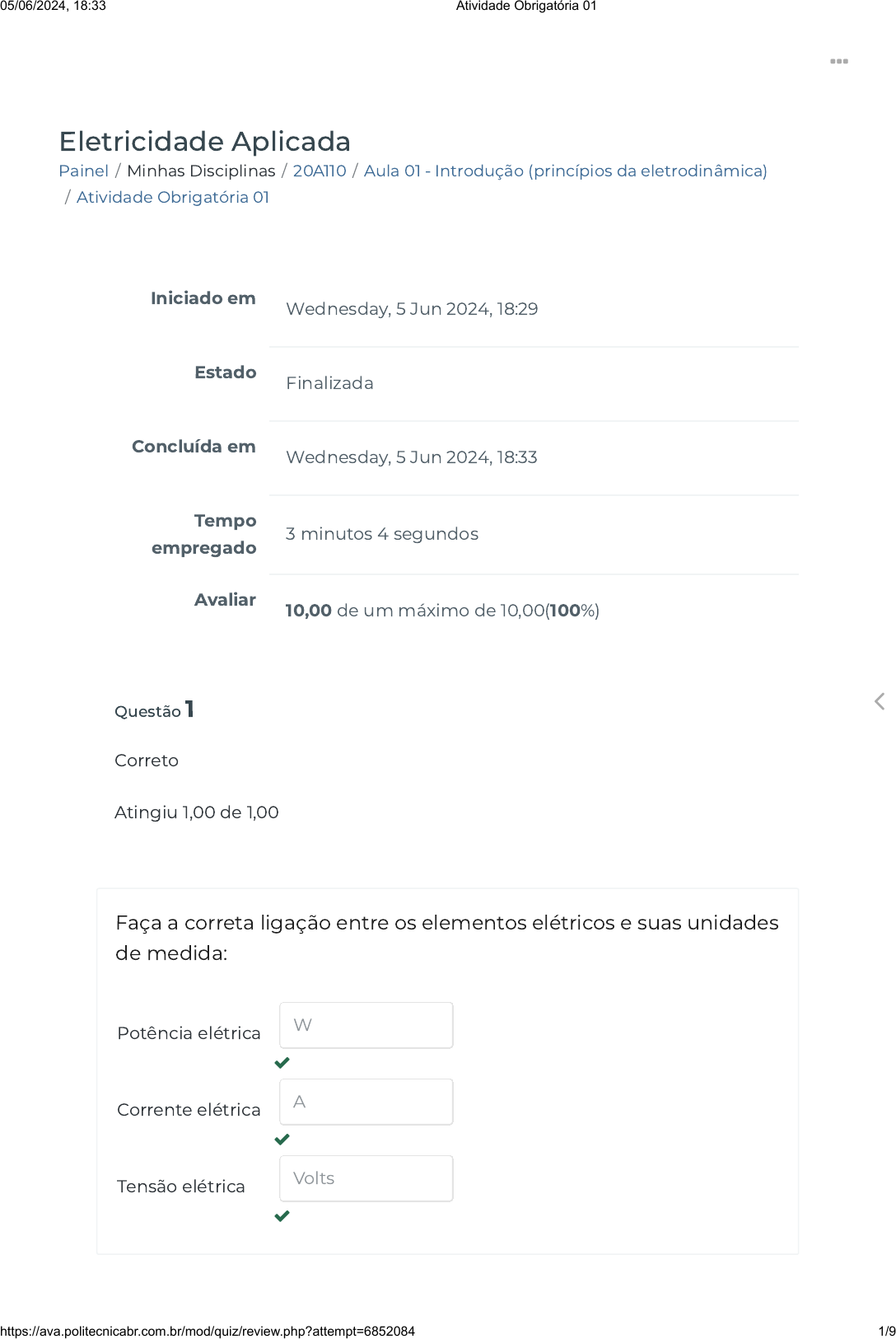 Painel / Minhas Disciplinas / 20A110 / Aula 01 - Introdução (princípios da eletrodinâmica) / Atividade Obrigatória 01 Eletricidade Aplicada Iniciado em Wednesday, 5 Jun 2024, 18:29 Estado Finalizada Concluída em Wednesday, 5 Jun 2024, 18:33 Tempo empregado 3 minutos 4 segundos Avaliar 10,00 de um máximo de 10,00(100%) Questão 1 Correto Atingiu 1,00 de 1,00 Faça a correta ligação entre os elementos elétricos e suas unidades de medida: Potência elétrica Corrente elétrica Tensão elétrica W A Volts 05/06/2024, 18:33 Atividade Obrigatória 01 https://ava.politecnicabr.com.br/mod/quiz/review.php?attempt=6852084 1/9 https://ava.politecnicabr.com.br/my/ https://ava.politecnicabr.com.br/my/ https://ava.politecnicabr.com.br/course/view.php?id=945 https://ava.politecnicabr.com.br/course/view.php?id=945#section-2 https://ava.politecnicabr.com.br/mod/quiz/view.php?id=31382 https://ava.politecnicabr.com.br/ Questão 2 Correto Atingiu 1,00 de 1,00 O que é tensão elétrica? Escolha uma opção: a. É um dispositivo elétrico que possui dois terminais condutores. Podendo ser gerador ou receptor. b. É a diferença de potencial elétrico entre dois pontos (ddp). c. É o �uxo ordenado de cargas elétricas, que se movem de forma orientada em um condutor elétrico. d. como ponto de referência para um potencial elétrico de zero volt. e. Nenhuma das alternativas aqui apresentadas. 05/06/2024, 18:33 Atividade Obrigatória 01 https://ava.politecnicabr.com.br/mod/quiz/review.php?attempt=6852084 2/9 https://ava.politecnicabr.com.br/ Questão 3 Correto Atingiu 1,00 de 1,00 O que é corrente elétrica? Escolha uma opção: como ponto de referência para um potencial elétrico de zero volt. É um dispositivo elétrico que possui dois terminais condutores. Podendo ser gerador ou receptor. É o �uxo ordenado de cargas elétricas, que se movem de forma orientada em um condutor elétrico. É a diferença de potencial elétrico entre dois pontos (ddp). Nenhuma das alternativas aqui apresentadas. 05/06/2024, 18:33 Atividade Obrigatória 01 https://ava.politecnicabr.com.br/mod/quiz/review.php?attempt=6852084 3/9 https://ava.politecnicabr.com.br/ Questão 4 Correto Atingiu 1,00 de 1,00 Pela seção transversal de um �o condutor passou uma de 2mA durante 45s. Qual a quantidade de carga elétrica que atravessa essa seção nesse intervalo de tempo? Escolha uma opção: Questão 5 Correto Atingiu 1,00 de 1,00 Colocando pilhas idênticas em série, ao contrário do que se é imaginado, conservamos o valor de tensão desta, e não somamos as tensões das mesmas. Escolha uma opção: Nenhuma das alternativas aqui apresentadas. 0,09V 0,09C 0,09A 0,09W Verdadeiro Falso 05/06/2024, 18:33 Atividade Obrigatória 01 https://ava.politecnicabr.com.br/mod/quiz/review.php?attempt=6852084 4/9 https://ava.politecnicabr.com.br/ Questão 6 Correto Atingiu 1,00 de 1,00 Podemos entender corrente elétrica como sendo a variação de carga elétrica dividida pela variação de tempo? Escolha uma opção: Questão 7 Correto Atingiu 1,00 de 1,00 Considerando uma carga com potencial Va=10V e outra carga Vb=15V . Calcule a ddp entre Va e Vb estas cargas. Escolha uma opção: Verdadeiro Falso a. 25V b. -25V c. Nenhuma das alternativas aqui apresentadas. d. 5V e. -5V 05/06/2024, 18:33 Atividade Obrigatória 01 https://ava.politecnicabr.com.br/mod/quiz/review.php?attempt=6852084 5/9 https://ava.politecnicabr.com.br/ Questão 8 Correto Atingiu 1,00 de 1,00 Qual é a intensidade da corrente elétrica em um �o condutor, sabendo que durante 12s a variação da carga através da sua seção transversal é linear e igual a 3,0mC? Escolha uma opção: 0,00025A 0,003A 0,03A Nenhuma das alternativas aqui apresentadas. 3A 05/06/2024, 18:33 Atividade Obrigatória 01 https://ava.politecnicabr.com.br/mod/quiz/review.php?attempt=6852084 6/9 https://ava.politecnicabr.com.br/ Questão 9 Correto Atingiu 1,00 de 1,00 O que é chamado "Terra"? Escolha uma opção: É o �uxo ordenado de cargas elétricas, que se movem de forma orientada em um condutor elétrico. É a diferença de potencial elétrico entre dois pontos (ddp). como ponto de referência para um potencial elétrico de zero volt. É um dispositivo elétrico que possui dois terminais condutores. Podendo ser gerador ou receptor. 05/06/2024, 18:33 Atividade Obrigatória 01 https://ava.politecnicabr.com.br/mod/quiz/review.php?attempt=6852084 7/9 https://ava.politecnicabr.com.br/ Questão 10 Correto Atingiu 1,00 de 1,00 O que é um bipolo? Escolha uma opção: É um dispositivo elétrico que possui dois terminais condutores. Podendo ser gerador ou receptor. como ponto de referência para um potencial elétrico de zero volt. É o �uxo ordenado de cargas elétricas, que se movem de forma orientada em um condutor elétrico. Nenhuma das alternativas aqui apresentadas. É a diferença de potencial elétrico entre dois pontos (ddp). Entre em Contato https://www.politecnicabr.com.br 0800 084 2627 0800 084 2627 Links Úteis Dicas da nossa Diretora Acadêmica Planner de Estudos Declaração de Matrícula Orientações do AVA Abertura de Ticket Fale com o Tutor Cronograma de Estudos Manual de Estágio Manual de Competência 05/06/2024, 18:33 Atividade Obrigatória 01 https://ava.politecnicabr.com.br/mod/quiz/review.php?attempt=6852084 8/9 https://www.politecnicabr.com.br/ https://soundcloud.com/user-501638417/sets/escola-politecnica-brasileira https://soundcloud.com/user-501638417/sets/escola-politecnica-brasileira https://storage.googleapis.com/sirius-pubstore/semestre_plannerdeestudo%20poli.pdf https://storage.googleapis.com/sirius-pubstore/semestre_plannerdeestudo%20poli.pdf https://storage.googleapis.com/sirius-pubstore/declaracao_matricula.pdf https://storage.googleapis.com/sirius-pubstore/declaracao_matricula.pdf https://storage.googleapis.com/sirius-pubstore/orientacoes_ava.pdf https://storage.googleapis.com/sirius-pubstore/orientacoes_ava.pdf https://storage.googleapis.com/sirius-pubstor