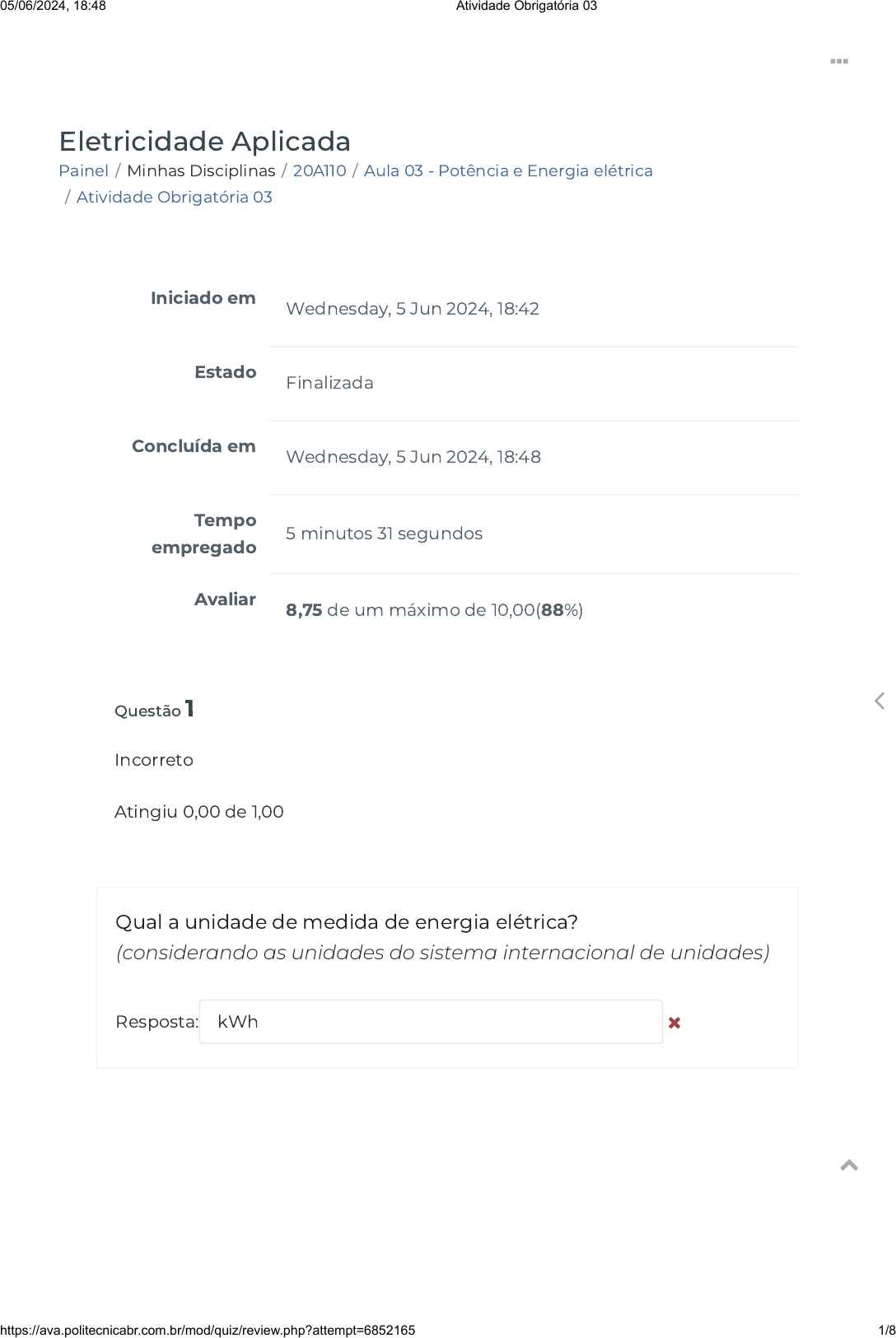 Painel / Minhas Disciplinas / 20A110 / Aula 03 - Potência e Energia elétrica / Atividade Obrigatória 03 Eletricidade Aplicada Iniciado em Wednesday, 5 Jun 2024, 18:42 Estado Finalizada Concluída em Wednesday, 5 Jun 2024, 18:48 Tempo empregado 5 minutos 31 segundos Avaliar 8,75 de um máximo de 10,00(88%) Questão 1 Incorreto Atingiu 0,00 de 1,00 Qual a unidade de medida de energia elétrica? (considerando as unidades do sistema internacional de unidades) Resposta: kWh 05/06/2024, 18:48 Atividade Obrigatória 03 https://ava.politecnicabr.com.br/mod/quiz/review.php?attempt=6852165 1/8 https://ava.politecnicabr.com.br/my/ https://ava.politecnicabr.com.br/my/ https://ava.politecnicabr.com.br/course/view.php?id=945 https://ava.politecnicabr.com.br/course/view.php?id=945#section-4 https://ava.politecnicabr.com.br/mod/quiz/view.php?id=31389 https://ava.politecnicabr.com.br/ Questão 2 Correto Atingiu 1,00 de 1,00 Potência elétrica é a quantidade de energia elétrica desenvolvida em um intervalo de tempo Escolha uma opção: Questão 3 Correto Atingiu 1,00 de 1,00 Considere um resistor de 3,5Ω sobe uma corrente de 1,2A, a potência dissipada deste resistor é de . Verdadeiro Falso 4,20W 5,04W 3,20W 2,91W 05/06/2024, 18:48 Atividade Obrigatória 03 https://ava.politecnicabr.com.br/mod/quiz/review.php?attempt=6852165 2/8 https://ava.politecnicabr.com.br/ Questão 4 Correto Atingiu 1,00 de 1,00 Qual a unidade de medida de potência elétrica em circuitos CC? Escolha uma opção: Questão 5 Correto Atingiu 1,00 de 1,00 A expressão matemática para a potência elétrica é: Escolha uma opção: V Ω A W P = V ∗ I Verdadeiro Falso 05/06/2024, 18:48 Atividade Obrigatória 03 https://ava.politecnicabr.com.br/mod/quiz/review.php?attempt=6852165 3/8 https://ava.politecnicabr.com.br/ Questão 6 Correto Atingiu 1,00 de 1,00 (PUC- MG) Ao aplicarmos uma diferença de potencial 9,0 V em um resistor de 3,0Ώ, podemos dizer que a potência dissipada é: Resposta: 27 Questão 7 Correto Atingiu 1,00 de 1,00 Um resistor, submetido à diferença de potencial de 8,0 V, é percorrido por uma corrente elétrica de intensidade i = 0,4 A. Resposta: 3,2 W W Watt W 05/06/2024, 18:48 Atividade Obrigatória 03 https://ava.politecnicabr.com.br/mod/quiz/review.php?attempt=6852165 4/8 https://ava.politecnicabr.com.br/ Questão 8 Parcialmente correto Atingiu 0,75 de 1,00 A potência elétrica é uma grandeza e, como tal, pode ser medida. A unidade de medida da potência elétrica é o , simbolizado pela letra . Um watt (1W) corresponde à potência desenvolvida no tempo de um segundo em uma carga, alimentada por uma tensão de 1 , na qual circula uma corrente de 1 . Ámpres Ámpres Ámpres Ámpres Volts VoltsVoltsVolts VVVV WattWattWatt WWW A AAA 05/06/2024, 18:48 Atividade Obrigatória 03 https://ava.politecnicabr.com.br/mod/quiz/review.php?attempt=6852165 5/8 https://ava.politecnicabr.com.br/ Questão 9 Correto Atingiu 1,00 de 1,00 (IFSP) Ao entrar em uma loja de materiais de construção, um eletricista vê o seguinte anúncio: ECONOMIZE: Lâmpadas �uorescentes de 15 W têm a mesma luminosidade (iluminação) que lâmpadas incandescentes de 60 W de potência. De acordo com o anúncio, com o intuito de economizar energia elétrica, o eletricista troca uma lâmpada incandescente por uma �uorescente e conclui que, em 1 hora, a economia de energia elétrica, em kWh, será de. Escolha uma opção: 0,025 0,04 0,045 0,03 0,015 05/06/2024, 18:48 Atividade Obrigatória 03 https://ava.politecnicabr.com.br/mod/quiz/review.php?attempt=6852165 6/8 https://ava.politecnicabr.com.br/ Questão 10 Correto Atingiu 1,00 de 1,00 (UERGS – PR) Um chuveiro elétrico está instalado numa casa onde a rede elétrica é de 110 V. Um eletricista considera aconselhável alterar a instalação elétrica para 220 V e utilizar um chuveiro de mesma potência que o utilizado anteriormente, pois, com isso, o novo chuveiro: Escolha uma opção: será percorrido por uma corrente elétrica menor será percorrido por uma corrente elétrica maior consumirá mais energia elétrica. consumirá menos energia elétrica. dissipará maior quantidade de calor. Entre em Contato https://www.politecnicabr.com.br 0800 084 2627 0800 084 2627 Links Úteis Dicas da nossa Diretora Acadêmica Planner de Estudos Declaração de Matrícula Orientações do AVA Abertura de Ticket Fale com o Tutor Cronograma de Estudos Manual de Estágio Manual de Competência 05/06/2024, 18:48 Atividade Obrigatória 03 https://ava.politecnicabr.com.br/mod/quiz/review.php?attempt=6852165 7/8 https://www.politecnicabr.com.br/ https://soundcloud.com/user-501638417/sets/escola-politecnica-brasileira https://soundcloud.com/user-501638417/sets/escola-politecnica-brasileira https://storage.googleapis.com/sirius-pubstore/semestre_plannerdeestudo%20poli.pdf https://storage.googleapis.com/sirius-pubstore/semestre_plannerdeestudo%20poli.pdf https://storage.googleapis.com/sirius-pubstore/declaracao_matricula.pdf https://storage.googleapis.com/sirius-pubstore/declaracao_matricula.pdf https://storage.googleapis.com/sirius-pubstore/orientacoes_ava.pdf https://storage.googleapis.com/sirius-pubstore/orientacoes_ava.pdf https://storage.googleapis.com/sirius-pubstore/abertura_ticket.pdf https://storage.googleapis.com/sirius-pubstore/abertura_ticket.pdf https://storage.googleapis.com/sirius-pubstore/fale_com_tutor.pdf https://storage.googleapis.com/sirius-pubstore/fale_com_tutor.pdf https://storage.googleapis.com/sirius-pubstore/cronograma_estudos.pdf https://storage.googleapis.com/sirius-pubstore/cronograma_estudos.pdf https://storage.googleapis.com/sirius-pubstore/manual_estagio.pdf https://storage.googleapis.com/sirius-pubstore/manual_estagio.pdf https://storage.googleapis.com/sirius-pubstore/manual_competencia.pdf https://storage.googleapis.com/sirius-pubstore/manual_competencia.pdf https://ava.politecnicabr.com.br/ © 2022 - Escola Politécnica Brasileira Siga-nos nas redes sociais 05/06/2024, 18:48