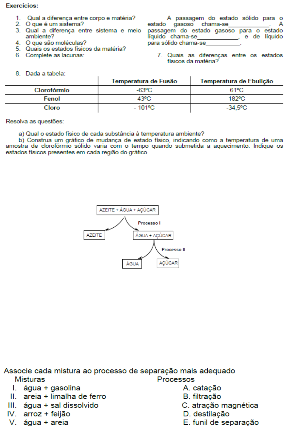 9. Abaixo, esta esquematizado o fluxograma relativo a separação dos componentes de uma mistura constituída por azeite, agua e açúcar totalmente dissolvido. Examinando o fluxograma apresentado. Identifica os processos que ocorrem em 1 e 2? 10. Em um, acampamento um estudante deixou cair na areia todo o sal de cozinha disponível. Entretanto, tendo conhecimento sobre separação de misturas, conseguiu recuperar praticamente todo o sal. Que operações esse estudante pode ter realizado? 11. A análise de um material mostrou temperatura constante durante a fusão e elevação da temperatura durante a ebulição. Esse material e uma substancia pura ou uma mistura? Porque? 12. FIM