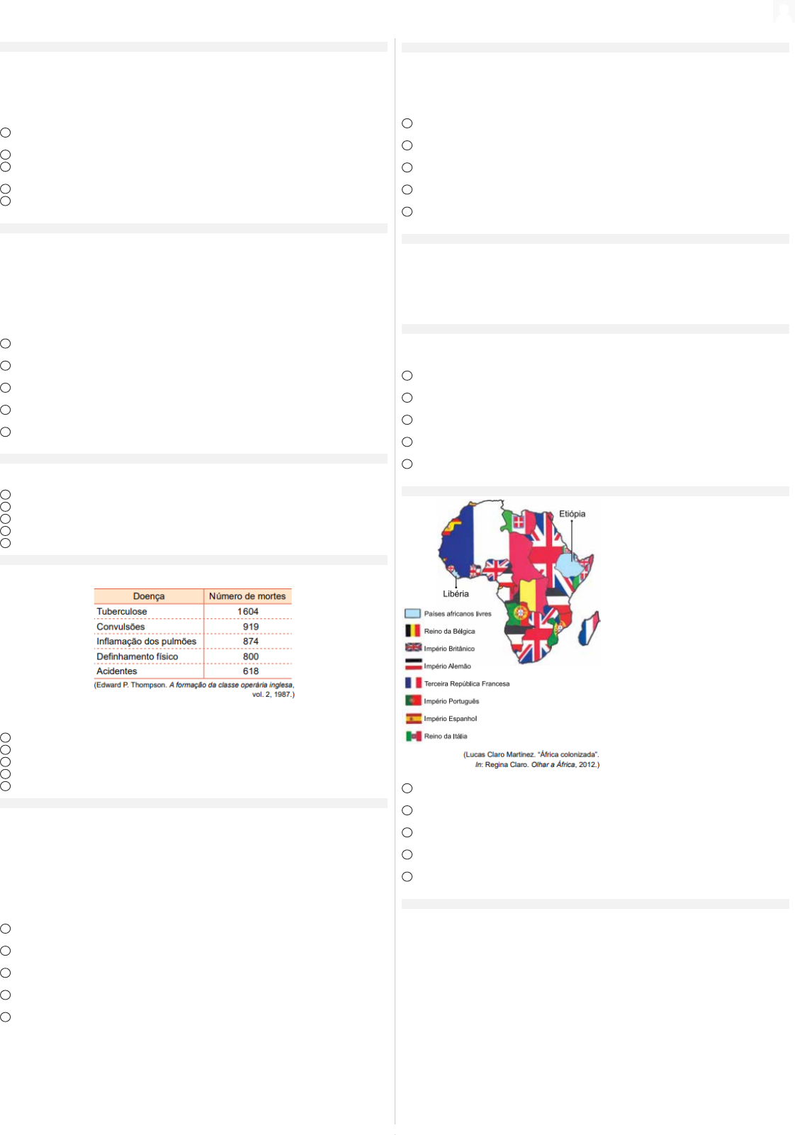 1o SIMULADO - REVISÃO UEA 2022 - Prof André Barroso 24/10/2022 FAMECA a b c d e FGV-SP a b c d e FMJ a b c d e Albert Einstein a b c d e UNESP a b c d e Albert Einstein a b c d e FAMERP a b c d e UNESP a b c d e Questão 1 O feudalismo medieval nasceu no seio de uma época infinitamente perturbada. Em certa medida, nasceu dessas mesmas perturbações. Ora, entre as causas que contribuíram para criar ou manter um ambiente tão tumultuoso, algumas existiam completamente estranhas à evolução interna das sociedades europeias. (Marc Bloch. A sociedade feudal, 1987.) Entre as causas mencionadas no texto, é correto citar o avanço das tropas macedônias sobre o Império Romano, que impôs o domínio estrangeiro sobre a Península Itálica. as invasões germânicas, que contribuíram para a fragmentação do Império Romano. os ataques cartagineses, que provocaram um longo ciclo de guerras entre europeus e norte- africanos. os conflitos sociais no interior do Reino Franco, que provocaram colapso político e econômico. a adoção do paganismo pelos imperadores romanos, o que provocou a revolta das populações cristãs. Questão 2 O anfiteatro era, para os romanos, parte de sua normalidade cotidiana, um lugar no qual reafirmavam seus valores e sua concepção do “normal”. Nos anfiteatros eram expostos, para serem supliciados, bárbaros vencidos, inimigos que se haviam insurgido contra a ordem romana. Nos anfiteatros se supliciavam, também, bandidos e marginais, como por vezes os cristãos, que eram jogados às feras e dados como espetáculo, para o prazer de seus algozes ou daqueles que defendiam os valores normais da sociedade. (Norberto Luiz Guarinello, A normalidade da violência em Roma In http:// www2.uol.com.br/historiaviva/artigos/ a_normalidade_da_violencia_em_roma.html) Sobre as relações entre os cristãos e o Estado Romano, é correto afirmar que a violência durante a República Romana vitimou os cristãos porque estes aceitaram a presença dos povos bárbaros dentro das fronteiras romanas a prática do cristianismo foi tolerada em Roma desde os primórdios dessa religião, e as ocorrências violentas podem ser consideradas exceções. o cristianismo sofreu violenta perseguição no Império Romano pela sua recusa em aceitar a divinização dos imperadores. a ação cristã foi consentida pelo poder romano, e a violência contra a nova religião restringiu-se aos seus principais líderes. a intensa violência praticada contra os seguidores do cristianismo ocorreu por um curto período, apenas durante os primeiros anos da Monarquia Romana. Questão 3 Durante a maior parte de sua história, o antigo Egito organizou- se politicamente em uma estrutura de poder centralizado. Entre as características do sistema adotado, pode-se destacar a divisão político-administrativa do território em Alto e Baixo Egito. a participação dos chefes dos nomos na estrutura governamental. a concentração do poder nas mãos do faraó, ser de origem divina. a divisão do império em províncias conhecidas como satrapias. a autonomia dos nomarcas frente ao poder do faraó e dos sacerdotes. Questão 4 Observe a tabela com as cinco principais causas de morte registradas em Sheffield (Inglaterra), entre 1837 e 1842. O total de mortes atestadas nesse local e nesse período foi de 11944. É possível afirmar que parte importante dessas mortes associa-se às frequentes epidemias de doenças de origem viral nos bairros operários ingleses. às doenças disseminadas pelo forte ingresso de imigrantes na Europa do século XVIII. à precariedade alimentar e habitacional nas zonas rurais europeias no século XIX. às condições de pobreza e superpopulação nas áreas de concentração industrial. à inadaptação dos operários ao estilo de vida das áreas rurais da Inglaterra. Questão 5 Na Europa, as forças reacionárias que compunham a Santa Aliança não viam com bons olhos a emancipação política das colônias ibéricas na América. […] Todavia, o novo Império do Brasil podia contar com a aliança da poderosa Inglaterra, representada por George Canning, primeiro-ministro do rei Jorge IV. […] Canning acabaria por convencer o governo português a aceitar a soberania do Brasil, em 1825. Uma atitude coerente com o apoio que o governo britânico dera aos EUA, no ano anterior, por ocasião do lançamento da Doutrina Monroe, que afirmava o princípio da não intervenção europeia na América. (Ilmar Rohloff de Mattos e Luis Affonso Seigneur de Albuquerque. Independência ou morte: a emancipação política do Brasil, 1991.) O texto relaciona a restauração das monarquias absolutistas no continente europeu, a industrialização dos Estados Unidos e a constituição da Federação dos Estados Independentes da América Latina. a influência da Igreja católica nos assuntos políticos europeus, o controle britânico dos mares depois do Ato de Navegação e o avanço imperialista dos Estados Unidos sobre o Brasil. a disposição europeia de recolonização da América, o Bloqueio Continental determinado pela França e os acordos de livre-comércio do Brasil com os países hispano- -americanos. a penetração dos industrializados britânicos nos mercados europeus, a tolerância portuguesa em relação ao emancipacionismo brasileiro e a independência política dos Estados Unidos. a reorganização da Europa continental depois do período de domínio napoleônico, os processos de independência na América e a ampliação do controle comercial mundial pela Inglaterra. Questão 6 Crise do sistema colonial é, portanto, aqui entendida como o conjunto de tendências políticas e econômicas que forcejavam no sentido de distender ou mesmo desatar os laços de subordinação que vinculavam as colônias ultramarinas às metrópoles europeias. (Fernando A. Novais. Portugal e Brasil na crise do Antigo Sistema Colonial (1777-1808), 1981.) A crise mencionada no texto pode ser associada, entre outros fatores, ao