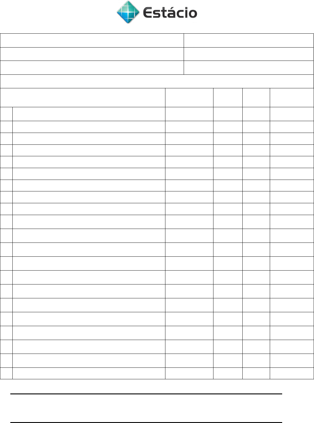 ANEXO 2 – FICHA DE ACOMPANHAMENTO DE ATIVIDADES Nome do(a) Estagiário(a): Michele Margarida de Souza Curso: Pedagogia IES: Centro Universitário Estácio de Ribeirão Preto Polo: Polo Floresta – Belo Horizonte - MG Nome da disciplina de Estágio: Estágio em Educação básica Código da disciplina de Estágio:EEL0035 Estágio na área/segmento: Escola de educação infantil Empresa concedente do estágio: Centro de entretenimento mais -Ltd ATIVIDADES REALIZADAS DATA HORA INÍCIO HORA FINAL Visto do Supervisor 1 Acompanhar e auxiliar durante atividades na área externa 07/05/2024 15:00 18:00 2 Recepção de pais e responsáveis para reunião escolar 08/05/2024 15:00 18:00 3 Apoio na execução de atividades de socialização 09/05/2024 15:00 18:00 4 Participação nas atividades de exploração e descoberta 10/05/2024 15:00 18:00 5 Suporte e auxilio na aula de música 13/05/2024 15:00 18:00 6 Participação de atividades para educação ambiental 14/05/2024 15:00 18:00 7 Auxilio para elaboração do plano de aula semanal 16/05/2024 15:00 18:00 8 Auxilio para organização das salas de aula e materiais 17/05/2024 15:00 18:00 9 Participação nas atividades de horta e jardinagem 20/05/2024 15:00 18:00 10 Auxilio durante atividades com argila 21/05/2024 15:00 18:00 11 15 Horas para elaboração de relatório e preenchimento de documentação -- -- -- 12 13 14 15 16 17 18 19 20 Total de horas 45horas ASSINATURA E CARIMBO DO SUPERVISOR(A) DA ORGANIZAÇÃO CONCEDENTE ASSINATURA DO ALUNO image1.jpeg image2.png