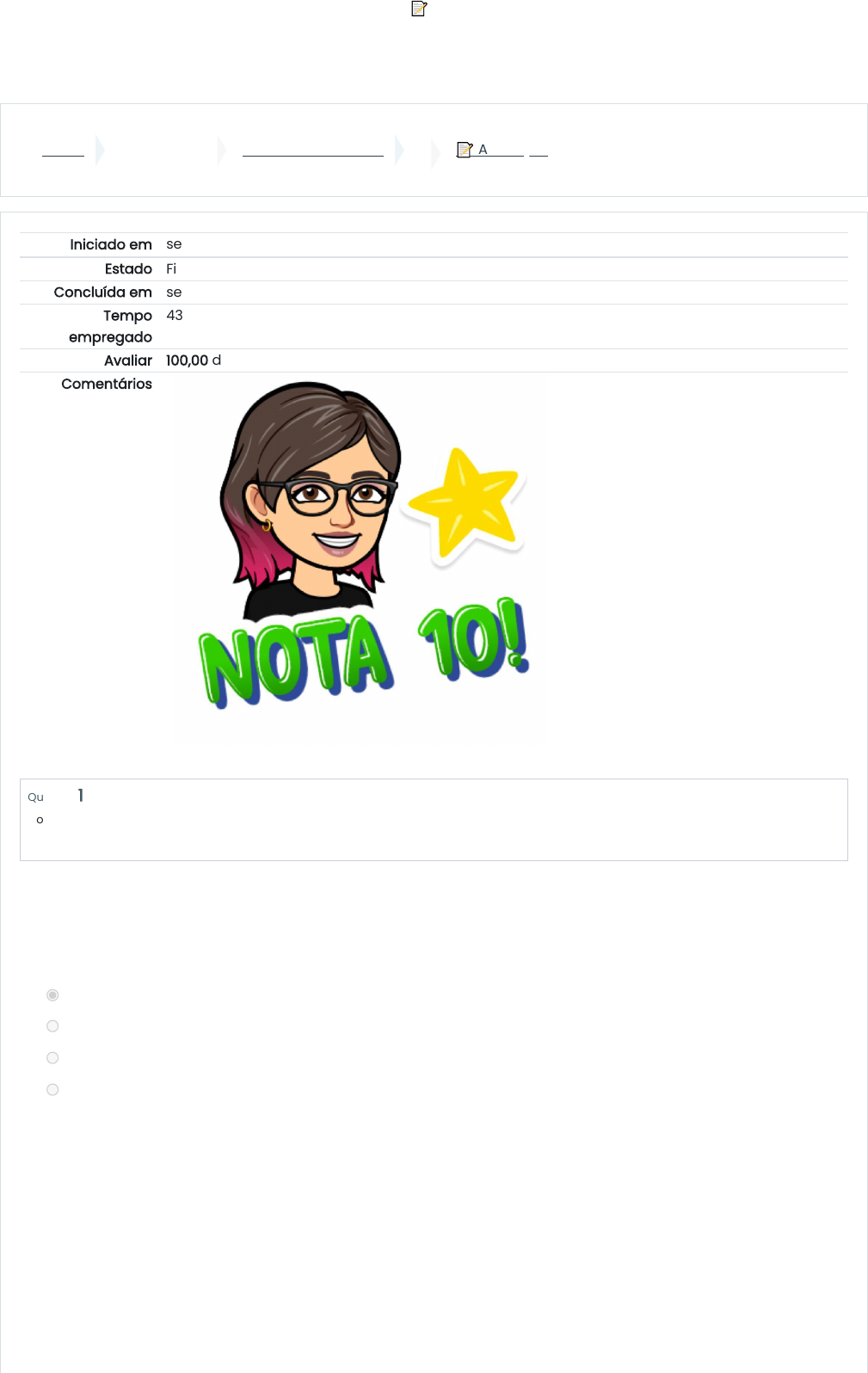 20/05/2024, 18:46 📝 Avaliação: Revisão da tentativa https://ava.ufms.br/mod/quiz/review.php?attempt=958993&cmid=823167 1/5 Painel Meus cursos 10152002-T01-2024-1 📝 Avaliação Iniciado em segunda, 20 mai 2024, 16:59 Estado Finalizada Concluída em segunda, 20 mai 2024, 17:42 Tempo empregado 43 minutos 5 segundos Avaliar 100,00 de um máximo de 100,00 Comentários Questão 1 Correto Atingiu 10,00 de 10,00 As memórias podem mudar ao longo do tempo, sendo “moldadas” e atualizadas frente a novos acontecimentos. A etapa de processamento da memória que permite a sua atualização é: Escolha uma opção: a. Reconsolidação b. Aquisição c. Esquecimento d. Consolidação https://ava.ufms.br/my/ https://ava.ufms.br/course/view.php?id=58260 https://ava.ufms.br/mod/quiz/view.php?id=823167 20/05/2024, 18:46 📝 Avaliação: Revisão da tentativa https://ava.ufms.br/mod/quiz/review.php?attempt=958993&cmid=823167 2/5 Questão 2 Correto Atingiu 10,00 de 10,00 Questão 3 Correto Atingiu 10,00 de 10,00 Questão 4 Correto Atingiu 10,00 de 10,00 Algumas medidas simples podem otimizar o aprendizado em um contexto de ensino. Entre as opções abaixo, qual não apresenta evidências em neurociências como estratégia para potencializar o aprendizado? Escolha uma opção: a. Oferecer feedback e punições frente a erros b. Permitir pausas estruturadas para retomar a atenção c. Contextualizar a conteúdo a ser assimilado d. Manter duração e qualidade de sono adequados A principal função do sistema nervoso é a comunicação biológica e coordenação funcional dos diversos sistemas orgânicos do corpo. O nome da célula do sistema nervoso que é especializada na comunicação de sinais é: Escolha uma opção: a. Astrócito b. Oligodendrócito c. Neurônio d. Célula da glia e. Micróglia As emoções modulam a formação das memórias de forma linear. Ou seja, quanto maior o componente emocional, sempre maior será o aprendizado e o desempenho. Escolha uma opção: Verdadeiro Falso 20/05/2024, 18:46 📝 Avaliação: Revisão da tentativa https://ava.ufms.br/mod/quiz/review.php?attempt=958993&cmid=823167 3/5 Questão 5 Correto Atingiu 10,00 de 10,00 Questão 6 Correto Atingiu 10,00 de 10,00 Questão 7 Correto Atingiu 10,00 de 10,00 Embora os neurônios tenham papel de destaque nas neurociências, as células da glia desempenham um papel fundamental no tecido nervoso. Relacione corretamente os principais tipos de células da glia com funções específicas desempenhadas por elas: Permitem o isolamento elétrico de neurônios ao formar bainha de mielina em seus axônios. Reveste vasos sanguíneos e estabelece a barreira hematoencefálica, que controla o acesso de substâncias até o sistema nervoso. Organizam a defesa do sistema nervoso, mediando respostas imunes e inflamatórias contra agentes infecciosos, lesões e substâncias estranhas. Oligodendrócito Astrócito Micróglia Os neurônios apresentam morfologia muito característica: o é onde se localiza o seu núcleo, material genético e toda a maquinaria metabólica necessária para a sua sobrevivência. Também é dessa região neuronal que partem os , prolongamentos que se expandem como galhos, com a função de estabelecer contato com outros neurônios e receber estímulos. Informações recebidas são transmitidas adiante pelo , um prolongamento longo, que permite a conexão desse neurônio com vários outros, mais distantes. Os pontos de interação entre neurônios distintos estabelecem , que permitem a transferência de informações entre um neurônio e outro. corpo celular dendritos axônio sinapses O transtorno do espectro do autismo (TEA) acompanha prejuízos em algumas funções cognitivas e emocionais. Dentre as alternativas abaixo, assinale as opções que os incluem: Obs.: Cada alternativa errada que for marcada anula a pontuação que seria recebida por uma alternativa correta. Escolha uma ou mais: a. Padrão de comportamentos repetitivos ou restritivos b. Prejuízo atencional c. Comunicação e interação sociais d. Impulsividade e hiperatividade 20/05/2024, 18:46 📝 Avaliação: Revisão da tentativa https://ava.ufms.br/mod/quiz/review.php?attempt=958993&cmid=823167 4/5 Questão 8 Correto Atingiu 10,00 de 10,00 Questão 9 Correto Atingiu 10,00 de 10,00 Questão 10 Correto Atingiu 10,00 de 10,00 A deficiência intelectual é sempre presente em casos de transtorno do espectro do autismo (TEA), com prejuízo claro no aprendizado. Escolha uma opção: Verdadeiro Falso A memória é processada em várias etapas distintas. A apresentação de uma informação relevante representa a sua . Nesse momento, a memória é frágil, porque a informação apresentada simplesmente ativou a rede neuronal que a representará. Ela precisa passar pelo processo de , etapa na qual acontecem as modificações sinápticas e processos de que levarão ao fortalecimento da comunicação neuronal. Só então a memória torna- se estável, passível de ser mantida ao longo do tempo. Por meio da , a memória é acessada e “lembrada”. Nesse momento, a memória é reativada e requer uma nova etapa de estabilização, a , que volta a armazenar a memória e permite a de seu conteúdo. aquisição consolidação plasticidade evocação reconsolidação atualização Alguns critérios são essenciais para aplicar a prática de evocação da forma mais eficiente: é preciso considerar de questões ou exercícios que geram a evocação, sendo que abordagens mais amplas, que exijam respostas dissertativas e argumentação trazem melhores resultados, já que é uma tendência que o “esforço” para evocar as informações seja proporcional à capacidade de manter essas memórias de forma duradoura; adotar entre os exercícios de lembrança também melhora o processo de aprendizagem; ao mesmo tempo, é essencial, porque a memória é reforçada a cada nova evocação; por fim, ter sobre o desempenho é importante para permitir que a memória s