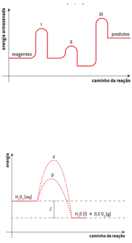 UNIVERSIDADE FEDERAL DO ESTADO DO RIO DE JANEIRO (UNIRIO) INSTITUTO DE BIOCIÊNCIAS – DEP. DE CIÊNCIAS NATURAIS TUTORIA EM QUÍMICA 1 - 2019/1 PROFª.: CLAUDIA JORGE DO NASCIMENTO TUTORA: MARINA BARBOSA MOREIRA Cinética Química 1) Suponha que a reação de oxidação do brometo, mostrada a seguir, ocorra em uma única etapa com uma velocidade v. Determine, em função de v, a velocidade desta reação em uma situação em que a concentração de ácido seja dobrada e a do oxigênio reduzida pela metade. 4 HBr(g)+ O2(g) → 2 Br2(g)+ 2 H2O(g) 2) O gráfico a seguir representa o mecanismo de uma reação. a) Em quantas etapas ocorre essa reação? Explique. b) Qual é a etapa mais rápida? E a mais lenta? Exlique. c) A reação é exotérmica ou endotérmica? 3) A partir da figura a seguir, responda: a) A transformação é endotérmica ou exotérmica? Justifique. b) Por qual caminho, A ou B, a reação ocorre mais rápido? Justifique. c) Qual caminho troca mais energia quando a reação ocorre? Justifique. d) Qual caminho gera maior quantidade de produtos? Justifique. e) O que é Z no gráfico? 4) A tabela seguinte mostra a variação da concentração de ácido clorídrico para a reação Fe + 2 HCl → FeCl2 + H2 t (min) [HCl] (mol/L) 0 0,2 5 0,115 8 0,1 Partindo dos dados apresentados na tabela, calcule a velocidade de consumo do Fe na reação para o intervalo de tempo total da reação. 5) A formação do dióxido de carbono (CO2) pode ser representada pela equação: C(s) + O2(g) → CO2(g) Se a velocidade de formação do CO2 for de 4 mols/minuto, qual será a velocidade de consumo de oxigênio, em mols/minuto? 6) Durante a decomposição da água oxigenada, ocorre a formação de água e oxigênio, de acordo com a equação: 2 H2O2(aq) → 2 H2O(l) + O2(g) Se a velocidade de liberação de oxigênio é 1 × 10−4 mol.L-1.s−1, qual a velocidade de consumo da água oxigenada, em mol.L-1s−1? 7) Considere a seguinte reação: 2 I− + HOOH + 2 H3O+ → I2 + 4 H2O O mecanismo da reação consiste em três etapas descritas a seguir: etapa I: HOOH + I−→ HOI + OH− (lenta) etapa II: HOI + I− → I2 + OH− (rápida) etapa III: 2 OH− + 2 H3O+ → 4 H2O (rápida) a) Qual a etapa determinante da velocidade da reação? b) Apresente a expressão da lei de velocidade para a reação global. 8) São mostradas a seguir três equações e suas respectivas Leis de Velocidade : I. 2 NO + 2 H2 → N2 + 2 H2O V1 = k [NO]2 [H2]2 II. SO2 + 2 H2 → S + 2 H2O V2 = k [SO2][H2] III. NO + O3 → O2 + NO2 V3 = k [NO][O3] Qual(is) das reações é(são) processos complexos? Pode-se afirmar que alguma delas corresponde a um processo elementar? Explique suas respostas. 9) Determine a equação da velocidade para a reação abaixo, supondo-a um processo elementar: 3 Cu + 8 HNO3 → 3 Cu(NO3)2 + 4 H2O + 2 NO 10) A cinética da reação abaixo foi estudada em solução aquosa, seguindo o número de mols de Hg2Cl2 que precipita por litro de solução por minuto. Os dados obtidos estão na tabela. 2 HgCl2 + C2O4 2− → 2 Cl− + 2 CO2(g) + Hg2Cl2(s) HgCl2 (mol.L-1) C2O4 2− (mol.L-1) velocidade (mol. L-1.min-1) 0,100 0,15 1,8 x 10-5 0,100 0,30 7,2 x 10-5 0,500 0,30 3,6 x 10-4 a) Determinar a equação da velocidade para a reação. b) Calcular o valor da constante de velocidade da reação. c) Qual será a velocidade da reação quando [HgCl2]= 0,010 mol/L e [C2O4 2−] = 0,010 mol/L?