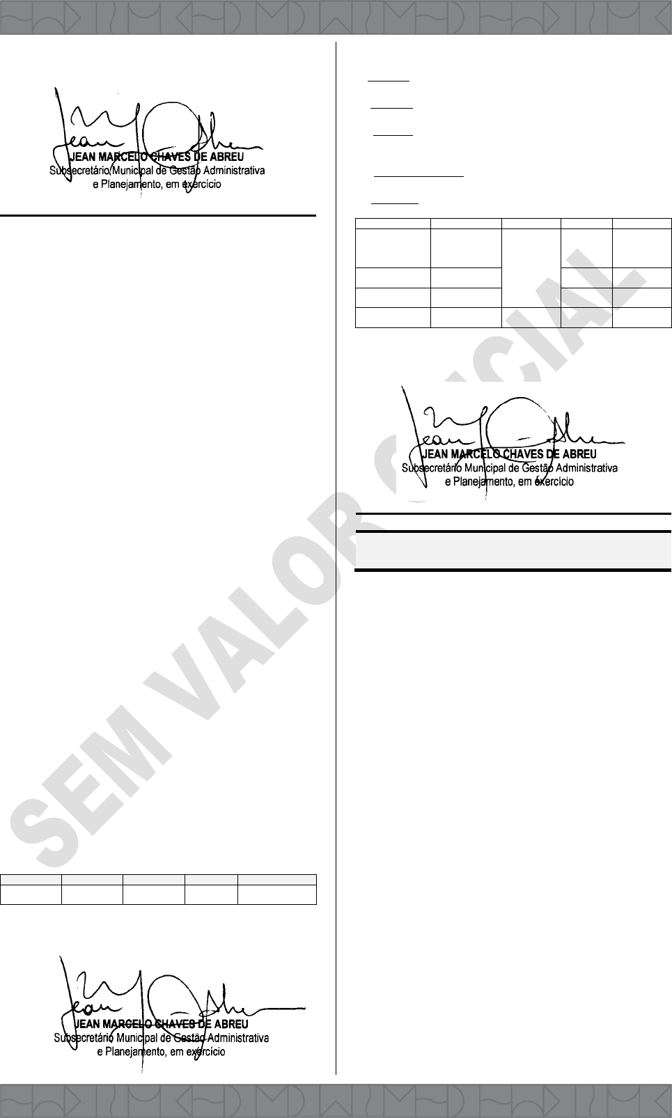 Manaus, segunda-feira, 11 de setembro de 2023 DOM | Edição 5666 | Página 17 CIENTIFIQUE-SE, PUBLIQUE-SE, CUMPRA-SE. Manaus, 11 de setembro de 2023. PORTARIA Nº 584/2023-DIVQVT/SEMSA O SUBSECRETÁRIO MUNICIPAL DE GESTÃO ADMINISTRATIVA E PLANEJAMENTO, em exercício, usando das atribuições que lhe são conferidas pelo artigo 128, inciso II, da Lei Orgânica do Município de Manaus, e CONSIDERANDO os artigos 13 das Leis nº 1.222 e 1.223, respectivamente, datadas de 26 de março de 2008, que tratam da indenização pelo exercício de cargo em atividades insalubres ou perigosas, aplicáveis aos Servidores Públicos da Saúde e aos Especialistas em Saúde – Médicos; CONSIDERANDO o Decreto nº 1.442, de 30 de janeiro de 2012, que regulamenta a indenização pelo exercício de cargo em atividades insalubres ou perigosas, combinado com o Decreto nº 1.977, publicado no Diário Oficial do Município – DOM de 16 de outubro de 2012, que inseriu alterações no artigo 3º, inciso III; CONSIDERANDO a Portaria nº 183/2012-NTRAB/SEMSA, republicada no Diário Oficial do Município – DOM nº 2934, de 23 de maio de 2012, que concedeu pagamento de indenização pelo exercício do cargo em atividades insalubres ou perigosas a vários servidores; CONSIDERANDO a Portaria nº 186/2021-NTRAB/SEMSA, publicada no Diário Oficial do Município – DOM nº 5086, de 30 de abril de 2021, que delega competência à Subsecretária de Gestão Administrativa e Planejamento – SUBGAP; CONSIDERANDO o Decreto nº 5.484, de 23 de janeiro de 2023, publicado no DOM nº 5511, que dispõe sobre a Programação Financeira, o Cronograma Mensal do Desembolso e as Metas Bimestrais de Arrecadação do Poder Executivo Municipal para exercício de 2023; CONSIDERANDO o Laudo Conclusivo da Comissão Permanente de Periculosidade e Insalubridade – CPPI, o Despacho da DSGP/SEMAD e da SUBORP/SEMEF, constantes no processo informado a seguir. RESOLVE: CONCEDER à servidora a seguir identificada, a fim de regularização referente ao período informado, o pagamento de indenização pelo exercício do cargo em atividades insalubres ou perigosas, aplicando o percentual de 5%, conforme o risco detectado pela Comissão Permanente de Periculosidade e Insalubridade – CPPI/SEMAD. PROCESSO Nº NOME CARGO MATRÍCULA PERÍODO 2021.01637.01412 .0.004539 FRANCE CUNHA FARIAS AS-TÉCNICO EM ENFERMAGEM 110.889-1A 4/2018 A 10/2022 CIENTIFIQUE-SE, PUBLIQUE-SE, CUMPRA-SE. Manaus, 11 de setembro de 2023. EXTRATO I - ESPÉCIE: Termo de Rescisão de Contrato por tempo determinado para atender necessidade temporária de excepcional interesse público. II - PARTES: O Município de Manaus, por intermédio da Secretaria Municipal de Saúde, e os prestadores de serviços relacionados a seguir. III - OBJETO: Rescisão de Contrato, a pedido, conforme solicitação nos autos dos Processos protocolados via SIGED sob os números informados. IV - FUNDAMENTAÇÃO: Nos termos do artigo 13, inciso II, da Lei nº 1.425, de 26 de março de 2010. V - VIGÊNCIA: a contar das datas informadas abaixo. PROCESSO Nº NOME CARGO MATRÍCULA A CONTAR DE 2023.01637.01412.0.00 7140 CASSIANO ALENCAR DE VASCONCELOS DIAS JIMENEZ MÉDICO CLÍNICO GERAL/RDA 136.026-4A 8/8/2023 2023.01637.01412.0.00 6752 ARLEA MONIQUE CRUZ REIS 118.625-6D 1/8/2023 2023.01637.01412.0.00 7720 JEFFERSON MIRANDA CARDOSO 088.494-4B 28/8/2023 2023.01637.01412.0.00 7586 WILDYS FEITOSA AZEVEDO ENFERMEIRO/ RDA 109.066-6B 1/9/2023 PUBLIQUE-SE. Manaus, 11 de setembro de 2023. SECRETARIA MUNICIPAL DE EDUCAÇÃO PROCESSO SELETIVO SIMPLIFICADO EDITAL Nº 009/2023 – SEMED A PREFEITURA DE MANAUS, por meio da Secretaria Municipal de Educação - SEMED, no uso de suas atribuições legais, conforme consta no Processo n.º 2023.18000.19116.0.012636, datado de 23 de maio de 2023, torna pública a realização de Processo Seletivo Simplificado, para Contratação de Professor Substituto para os ensinos de Educação Infantil, 1º ao 5º ano e Língua Portuguesa, por tempo determinado, para atender às necessidades desta Secretaria, nas especialidades constantes no Anexo I deste Edital, sujeitos ao Regime Jurídico de Direito Administrativo instituído pela Lei n.º 1.425, de 26 de março de 2010, alterada pela Lei n.º 1.718, de 14 de março de 2013, observadas o Art. 37, inciso IX, da Constituição Federal de 1988, bem como as normas contidas no presente edital. 1.DAS DISPOSIÇÕES PRELIMINARES 1.1 O Processo Seletivo Simplificado - PSS, regido por este edital, tem por finalidade selecionar Professor Substituto e formar cadastro de reserva para as especialidades de Educação Infantil, 1º ao 5º ano e Língua Portuguesa, por meio de análise curricular, para provimento de vagas constantes no Anexo I, distribuídas por Divisão Distrital Zonal. 1.2 A coordenação, o andamento e a avaliação das inscrições do PSS ficarão a cargo da Secretaria Municipal de Educação de Manaus - SEMED, sob a responsabilidade da Comissão formada por servidores da SEMED, constituída pela Portaria n. º 1478/2023-SEMED/GS, de 14 de junho de 2023, publicada no Diário Oficial do Município de Manaus Edição 5611, de 22 de junho de 2023. 2.DAS FUNÇÕES 2.1 O Processo Seletivo Simplificado, regido por este edital, oferta a função de Professor Substituto de Educação Infantil, 1º ao 5º ano e Língua Portuguesa, para provimento de vagas constantes no Anexo I. Manaus, segunda-feira, 11 de setembro de 2023 DOM | Edição 5666 | Página 18 ÁREA ESPECÍFICA DA EDUCAÇÃO PROFESSOR SUBSTITUTO Especialidade: Educação Infantil Carga horária Oito horas diárias, perfazendo um total de 40 (quarenta) horas semanais, que deverão ser cumpridas de segunda-feira a sexta-feira, nos turnos matutino e vespertino, nos horários das 07h às 11h e das 13h às 17h. Requisitos Básicos Diploma, devidamente registrado, de conclusão de curso de Graduação de Nível Superior em Normal Superior ou Licenciatura Plena em Pedagogia, ambos com habi