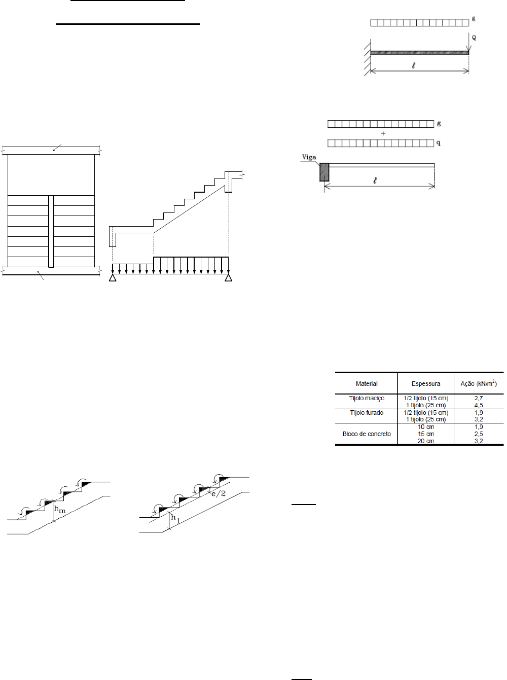 CONCRETO ARMADO II Escadas de Concreto Armado ► Considerações iniciais O tipo mais usual de escada em concreto armado tem como elemento resistente uma laje armada em uma só direção, onde os degraus não têm função estrutural. O modelo estrutural corresponde a uma laje armada em uma só direção, simplesmente apoiada, solicitada por cargas verticais, correspondendo a um modelo de viga isostática. Sendo assim, pode-se calcular reações e solicitações utilizando o vão projetado. viga viga p 1 p 2 ► Ações As ações serão consideradas verticais por m 2 de projeção horizontal. ● Peso próprio O peso próprio é calculado com a espessura média hm e com o peso específico do concreto igual a 25 kN/m 3 . Se a laje for de espessura constante e o enchimento dos degraus for de alvenaria, o peso próprio será calculado somando-se o peso da laje, calculado em função da espessura h1, ao peso do enchimento, calculado em função da espessura média e/2. Para a o cálculo do peso do enchimento do degrau de concreto, deve-se considerar um valor de peso específico da ordem de 24 kN/m 3 . Laje com degraus em concreto Laje com degraus em alvenaria ● Revestimento Para a força uniformemente distribuída de revestimento inferior e superior, forro e piso, respectivamente, costumam ser adotados valores no intervalo de 0,8 kN/m 2 a 1,2 kN/m 2 . Para o caso de materiais que aumentem consideravelmente o valor da ação, tal como o mármore, aconselha-se utilizar um valor maior, baseado no valor do peso específico do material e na sua geometria. ● Ação variável (Ação de uso) Os valores mínimos para as ações de uso, especificados pela NBR 6120 (1980), são os seguintes: � Escadas com acesso público: 3,0 kN/m 2 ; � Escadas sem acesso público: 2,5 kN/m 2 . ● Quando uma escada for constituída de degraus isolados em balanço, estes também devem ser calculados para suportar uma força concentrada de 2,5 kN, aplicada na posição mais desfavorável. Além da verificação utilizando-se ações permanentes (g) e variáveis (q), deve-se verificar esquema de carregamento seguir: ● Para a o cálculo da reação da viga, que suporta o degrau, não deve ser considerado esse carregamento e sim a composição original dada por: ● Gradil, mureta ou parede Quando a ação de gradil, mureta ou parede não está aplicada diretamente sobre uma viga de apoio, ela deve ser considerada no cálculo da laje. Em vez de se considerar a carga linear, faz-se uso de uma simplificação, que consiste em transformar a carga linear em carga uniformemente distribuída na área da laje. ���� Gradil O peso do gradil varia no intervalo de 0,3 kN/m a 0,5 kN/m. ���� Mureta ou parede O valor desta ação depende do material empregado, ou seja, tijolo maciço, tijolo cerâmico furado ou bloco de concreto. ► Dimensões Recomenda-se, para a obtenção de uma escada confortável, que seja verificada a relação a seguir: “s + 2.e” com 60 cm ≤ s + 2.e ≤ 64 cm Onde: s � Representa o valor do "passo“, comprimento do degrau. e � Representa o valor do "espelho", ou seja, a altura do degrau. Alguns códigos de obra especificam valores extremos, dado por: s ≥ 25 cm e ≤ 19 cm. ● Considerando-se s + 2 e = 62 cm, valor médio entre 60 cm e 64 cm, temos: � Escadas interiores apertadas: s = 25 cm; e = 18,5 cm � Escadas interiores folgadas: s = 28 cm; e = 17,0 cm � Escadas externas: s = 32 cm; e = 15,0 cm � Escadas de marinheiro: s = 0; e = 31,0 cm Seja: hl � Altura livre da escada, mínimo de 2,10 m. lv � Desnível a vencer com a escada. lh � Desenvolvimento horizontal da escada. n � número de degraus. Temos: ● De forma geral, a espessura da laje pode ser fixada, em função do comprimento do vão, pela seguinte tabela: Vão Espessura l ≤ 3m 10 cm 3m < l ≤ 4m 12 cm 4m < l ≤ 5m 14 cm ► Cálculo das escadas As escadas são calculadas de acordo com os mesmos critérios recomendados por norma, ou seja, em se tratando de lajes, deverão obedecer as mesmas recomendações de cálculo, ancoragem e armaduras mínimas que as lajes devem ter. ● Nas escadas, sendo lajes armadas em uma só direção, deve-se ter uma armadura de distribuição, na direção transversal à armadura principal, atendendo a seguinte condição: ● Deve-se lembrar que o cálculo dos esforços da escada são feitos com relação a sua projeção horizontal. ● Na seção de inflexão do trecho com degraus para o patamar, deve-se ter um cuidado especial com o detalhamento da armadura. Sempre que houver tendência à retificação de barra tracionada, em regiões em que a resistência a esses deslocamentos seja proporcionada por cobrimento insuficiente de concreto, a permanência da barra em sua posição deve ser garantida por detalhamento especial. No caso das escadas, deve-se substituir cada barra da armadura principal por outras duas prolongadas além do seu cruzamento e devidamente ancoradas. ► Escadas com vãos perpendiculares entre si Quando os lances das escadas são perpendiculares entre si e os apoios estão definidos em determinadas direções, considera-se como lance principal aquele que tem os dois apoios externos, viga ou parede, nas suas extremidades. O lance secundário será aquele que tem apoio externo, viga ou parede, somente em uma das extremidades. Na outra extremidade, o lance secundário fica apoiado no lance principal. c c /3 lance principal la n c e s e c u n d á ri o ● Reação do lance secundário Admite-se que a reação do lance secundário sobre o lance principal se distribui ao longo da largura “c” do lance principal, segundo uma variação triangular. Supõe-se que a reação esteja aplicada a “c/3”. A carga do trecho comum aos dois lances é considerada apenas no lance principal. ● Detalhamento Com relação ao detalhamento, no trecho em que as armaduras se cruzam, sempre se deve colocar por baixo a armadura do lance principal. ≥ mcm 