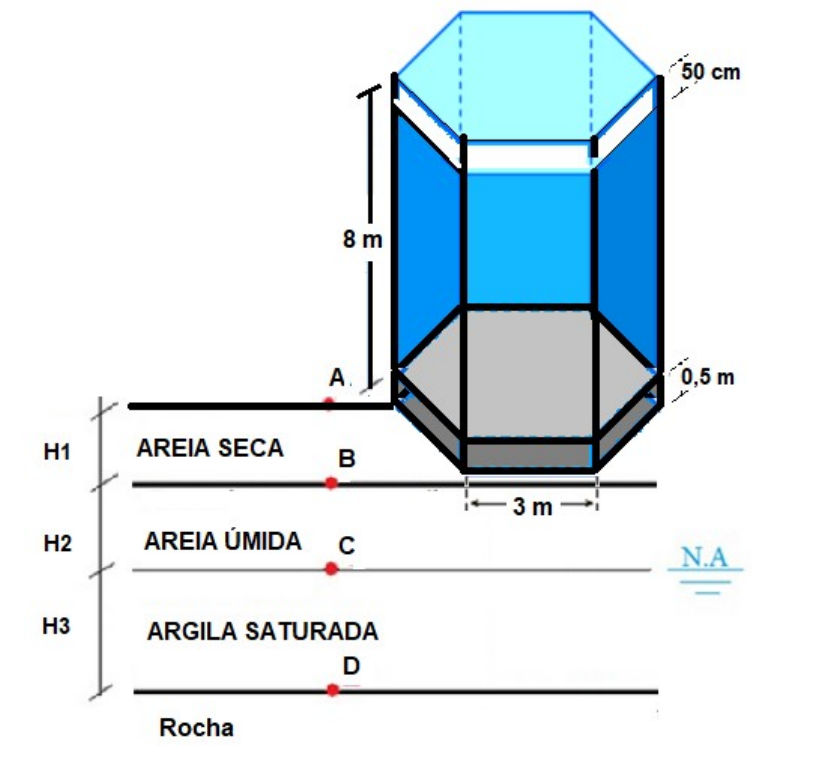 CONSIDERAR A ACELERAÇÃO DA GRAVIDADE DE 9,81 m s-2 01. A crescente demanda hídrica associada a longos períodos de estiagem obrigam as populações das regiões áridas e semi-áridas buscarem estratégias de sobrevivência à seca. Pensando nisso foi que a Engenheira Taila Bonfim criou o arrojado e robusto reservatório hexagonal de aço inoxidável para fins potáveis. O tanque será mantido preenchido com água a 21°C e massa específica de 0,998 g cm-3. Será mantido totalmente preenchido com uma borda livre de 50 cm. O reservatório será mantido na superfície do solo sobre uma base hexagonal, altura 0,5 m, do mesmo material do tanque, maçico e com a mesma área da base. Preocupada com uma possível sobrecarga no terreno, a Engenheira resolveu entrar em contato com o colega Eng. Márcio Silva para realização dos cálculos de tensões advindas das cargas sobrejacentes à rocha. O reservatório terá formato de prisma hexagonal regular, sua dimensão serão: cada aresta da base mede 3 metros, tem altura de 8 metros, espessura das paredes de 3 cm, massa específica do material 7,9 g cm-3. A camada A – B de altura H1 é constituída de areia seca, sobre essa camada está posta a base hexagonal de apoio do tanque, sobre a base fica o tanque preenchido com borda livre. Logo abaixo da camada A-B, encontra-se uma camada de areia úmida (B-C), apoiada sobre uma camada de argila saturada (C-D). Por fim, encontra-se uma rocha de permeabilidade nula e espessura desconhecida. Para determinação da massa específica real das partículas empregou-se o método do balão volumétrico, de modo que aliado à análise do comportamento do solo obteve-se a seguinte tabela: CAMADA Limites de profundidade (m) SATURAÇÃO Índice de Vazios Massa Específica das Partículas Superior Inferior (%) (dg cm-3) A-B (H1) 0,0 -2,0 0,00 0,49 26,00 B-C (H2) -2,0 -4,0 48,00 0,49 26,00 C-D (H3) -4,0 -6,5 100,00 ? 28,00 Os teores de umidade das camadas de argilas podem ser vistos no gráfico a seguir: Calcule: (a) a tensão exercida na base do carregamento em contato com o solo – tanque, água e base do tanque (1,0 ponto) RESPOSTA: (b) a tensão vertical total, na área do carregamento, sabendo que a mesma é dada pela soma dos produtos entre os pesos específicos e profundidades de cada camada, adicionando-se o resultado à tensão exercida pelo carregamento (1,3 ponto). RESPOSTA: (c) a pressão neutra ou poropressão (0,2 ponto). RESPOSTA: (d) a tensão efetiva no contato entre a argila e a rocha (1,0 ponto). RESPOSTA: (e) Esboce em papel milimetrado a poropressão, tensão vertical e tensão efetiva, em cada camada ilustrada (1,0 ponto). FORMULÁRIO 4 image1.png image2.emf 0,00; 0,00,00; -2,0?; -4,00,41; -6,00,43; -6,5-7,0-6,0-5,0-4,0-3,0-2,0-1,00,00,000,100,200,300,400,50Profundidade (m)Teor de umidade image3.png