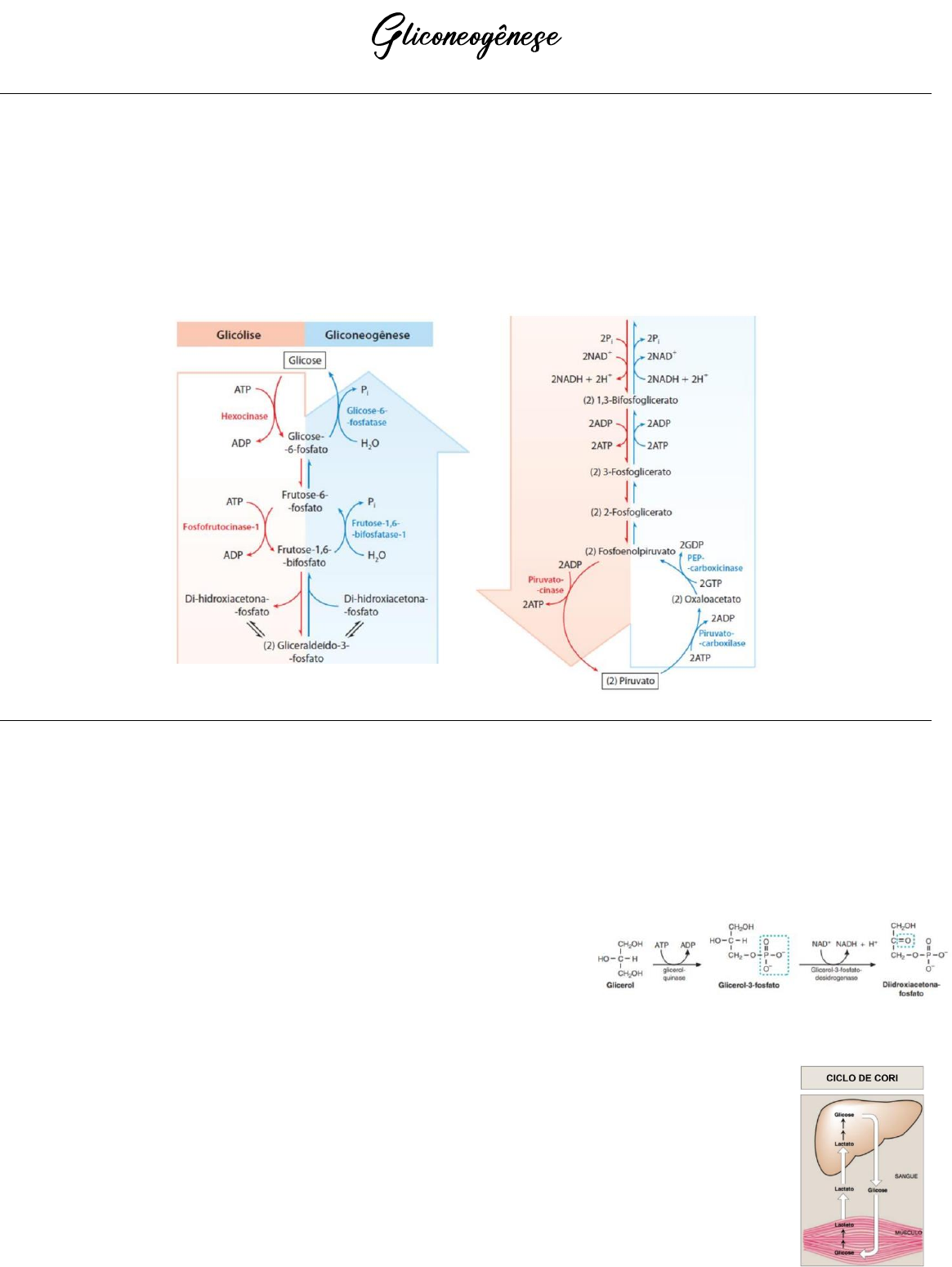VISÃO GERAL • Alguns tecidos, como o encéfalo, eritrócitos, medula renal, cristalino e a córnea, testículos e músculos em exercício necessitam de suprimento continuo de glicose como combustível metabólico • O glicogênio hepático consegue satisfazer essa necessidade por menos de 24hrs na ausência de ingestão de carboidratos. • Durante um jejum prolongado, as reservas hepáticas de glicogênio são depletadas e a glicose é produzida a partir de precursores não glicídicos, a gliconeogênese o Requer tanto enzimas mitocôndrias quanto citosólicas • Durante o jejum de uma noite o 90% da gliconeogênese ocorre no fígado e 10% nos rins • No jejum prolongado o Os rins se tornam mais importante e produzem 40% da produção de glicose SUBSTRATOS • Precursores gliconeogênicos o São moléculas que podem ser utilizadas na produção liquida de glicose o Glicerol, lactato e α-cetoácidos, obtidos do metabolismo de aminoácidos glicogenicos, são os mais importantes • Precursores não glicogênicos o Leucina e lisina GLICEROL • O glicerol é liberado durante a hidrolise dos Triglicerídeos no tecido adiposo e levado ao fígado pelo sangue • O glicerol é fosforilado pela GLICEROL-CINASE, resultando em glicerol-3-fosfato • O glicerol-3-fosfato é oxidado pela glicerol-3-fosfato-desidrogenase, produzindo di-hidroxiacetona-fosfato o Di-hidroxiacetona-fosfato: Intermediário da glicose e da gliconeogênese • Esse processo consome um ATP e um NAD+ • O adipócito não tem a enzima que fosforila LACTATO • Produzido na glicólise anaeróbia • É liberado no sangue pelo musculo esquelético em exercício e pelas células que não possuem mitocôndrias, como os eritrócitos • No ciclo de Cori: o O lactato é captado pelo fígado e oxidado: produz piruvato o O piruvato produzido é reconvertido em glicose e liberado de volta a circulação AMINOÁCIDOS • Os aminoácidos produzidos pela hidrolise de proteínas são as principais fontes de glicose durante um jejum • Seu metabolismo produz α-cetoácidos, como o piruvato, que é convertido em glicose, ou como α-cetoglutarato, que pode entrar no ciclo do acido cítrico e formar oxalacetato, um precursor direto do fosfoenolpiruvato REAÇÕES • A acetil-CoA e os compostos que produzem ela (acetoacetato e AA como lisina e leucina) não podem levar à síntese liquida da glicose. Isso se deve à natureza irreversível da reação do complexo piruvato-desidrogense, que converte o piruvato em acetil-CoA. Esses compostos originam, em vez da glicose, os corpos cetônicos e são denominados cetogênicos • Sete reações glicolíticas são reversíveis, sendo utilizadas na síntese a partir de lactato ou piruvato • Três reações são irreversíveis e devem ser contornadas pela utilização de quatro reações alternativas, que favorecem energeticamente a síntese de glicose CARBOXILAÇÃO DO PIRUVATO • O primeiro “bloqueio na via” que deve ser contornado, na síntese de glicose a partir do piruvato, é a conversão irreversível de fosfoenolpiruvato em piruvato o É catalisada pela piruvato-cinase (PK) na glicólise o Na gliconeogênese, o piruvato é carboxilado pela piruvato-carboxilase PC, produzindo oxalacetato o O oxalacetato é convertido em fosfoenolpiruvato(PEP) pela ação da PEP-carboxicinase (PEPCK) • Biotina o A piruvato-carboxilase requer para a sua ação a coenzima biotina, que se liga covalentemente à proteína enzimática pelo grupo amino de um resíduo de lisina o A hidrolise de ATP forma a biotina-dióxido de carbono, que carboxila o piruvato e forma oxalacetato • A reação ocorre na mitocôndria das células hepáticas e renais • Fornecer PEP (fosfoenolpiruvato), substrato importante para a gliconeogênese • Fornecer oxalacetato para repor intermediários do ciclo do ácido cítrico REGULAÇÃO ALOSTÉRICA • A piruvato-carboxilase é ativada alostericamente pela acetil-CoA • Níveis elevado de acetil-CoA na mitocôndria sinalizam um estado metabólico que é necessária uma síntese aumentada de oxalacetato o Ex.: no jejum, há necessidade de oxalacetato para a produção de glicose pelos rins e fígados • Diminuição dos níveis de acetil-CoA desativa a PC TRANSPORTE DE OXALACETATO PARA O CITOSOL • Para a gliconeogênese continuar, o oxalacetato deve ser convertido em fosfoenolpiruvato pela PEPCK • Para a produção de PEP no citosol, é necessário transportar o oxalacetato para fora da mitocôndria o Não existe um transportador de oxalacetato na membrana mitocondrial interna o Ele deve ser primeiro reduzido a malato pela malato-desidrogenase • O malato é transportado para o citosol e reoxidado a oxalacetato pela malato-desidrogenase, enquanto a NAD+ é reduzida a NADH • O NADH produzido é utilizado na redução do 1,3-bifosfoglicerato a gliceraldeído-3-fosfato pela gliceraldeído-3-fosdato- desidrogenase, passo comum a glicólise e a gliconeogênese DESCARBOXILAÇÃO DO OXALACETATO NO CITOSOL • O oxalacetato é descarboxilado e fosforilado no citosol pela PEPCK (fosfoenolpiruvato-carboxicinase), produzindo PEP • Utiliza energia da hidrolise de GTP • O PEP utiliza reações inversas da glicólise até chegar a frutose-1-6-bifosfato (intermediário da via glicolítica) DESFOSFORILAÇÃO DA FRUTOSE-1,6-BIFOSFATO • Hidrólise da frutose-1,6-bifosfato pela frutose-1,6-bifosfatase, encontrada no fígado e nos rins o Contorna a reação irreversível da fosfofrutoquinase-1 (PFK-1) da via glicolítica e fornece uma via energicamente favorável para a formação de frutose-6-fosfato • Forma a frutose-6-fosfato • Importante sitio regulatório da gliconeogênese REGULAÇÃO PELA FRUTOSE-1,6-BIFOSFATO o A frutose-1,6-bifosfatase é inibida pela frutose-2,6-bifosfato, um efetor alostérico, cuja concentração é influenciada pela reação insulina/glucagon o Aumento de glucagon: frutose-2,6-bifosfato deixa de ser produzido pela PFK DESFOSFORILAÇÃO DA GLIC