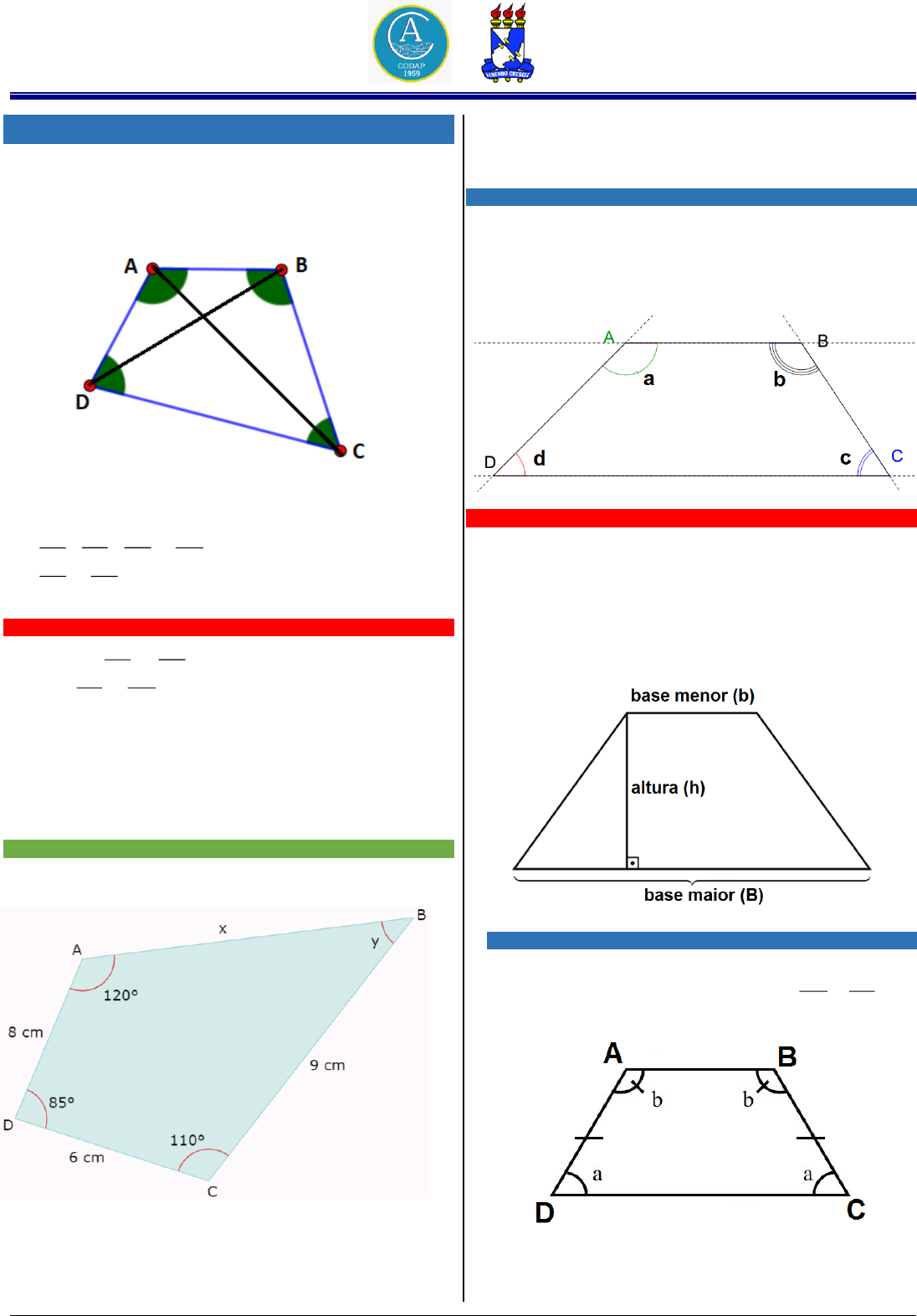 Página 1 QUADRILÁTEROS (PARTE 1) Prof. MSc. RÍGEL RABELO QUADRILÁTEROS ➢ Considere quatro pontos A, B, C e D, distintos e tais que três deles não sejam colineares. A figura plana formada ligando os pontos A, B, C e D através de segmentos de reta é chamada de quadrilátero. ➢ Na figura acima temos o quadrilátero ABCD, em que: • A, B, C e D são os vértices; • AB , BC , CD e DA são os lados; • AC e BD são as diagonais. OBSERVAÇÕES 1) Os lados AB e CD são lados opostos, assim como os lados BC e DA . 2) Os ângulos dos vértices A e C são ângulos opostos, assim como os ângulos dos vértices B e D. 3) A soma dos ângulos de todo quadrilátero é sempre igual a 360º. EXERCÍCIOS DE AULA 01) O perímetro do quadrilátero a seguir é 35 cm. As medidas de x e y são respectivamente iguais a a) 8 cm e 60º. b) 10 cm e 45º. c) 10 cm e 60º. d) 12 cm e 45º. e) 12 cm e 60º. ➢ Agora vamos estudar as características dos chamados quadriláteros notáveis: trapézio, paralelogramo, losan- go, retângulo e quadrado. 1. Trapézio ➢ O trapézio é um quadrilátero que se caracteriza por pos- suir um par de lados paralelos. Na figura a seguir temos o trapézio ABCD em que AB//CD. Os lados paralelos AB e CD são chamados de bases (base maior e base menor). OBSERVAÇÃO Os ângulos a, b, c e d são tais que a d 180º+ = e b c 180º+ = . ➢ A distância entre os lados AB e CD é a altura (h) do tra- pézio. As bases maior e menor são normalmente simboli- zadas por B e b, respectivamente. 1.1. Trapézio isósceles ➢ Um trapézio isósceles possui os lados não paralelos com a mesma medida (congruentes). Ou seja, AD BC= . ➢ Os ângulos adjacentes a cada base são iguais. Página 2 QUADRILÁTEROS (PARTE 1) Prof. MSc. RÍGEL RABELO ➢ As diagonais de um trapézio isósceles têm a mesma medida (congruentes). Ou seja, AC BD= . ➢ Uma propriedade bastante importante dos trapézios isós- celes é o fato de, ao traçar as alturas passando pelos vértices A e B, os segmentos CE e DF tem a mesma me- dida. EXERCÍCIOS DE AULA 02) No trapézio ABCD da figura a seguir, as medidas dos ângu- los B̂ e D̂ são respectivamente iguais a 40º e 100º. As medidas dos ângulos  e Ĉ são, respectivamente, a) 80º e 140º. b) 90º e 130º. c) 100º e 120º. d) 120º e 100º. e) 140º e 80º. 03) A figura a seguir representa um trapézio isósceles. As medidas dos ângulos agudos e obtusos desse trapézio são iguais, respectivamente a a) 28º e 152º. b) 38º e 142º. c) 48º e 132º. d) 58º e 122º. e) 68º e 112º. 04) Em um trapézio isósceles, a diagonal BD forma com a base maior BC um ângulo de 42º e, com o lado CD , um ângulo de 73º. Os ângulos agudos internos desse trapézio medem a) 42º. b) 54º. c) 65º. d) 73º. e) 88º. 1.2. Trapézio retângulo ➢ Um trapézio retângulo possui dois ângulos retos (iguais a 90º). Os dois demais ângulos continuam somando 180º. 1.3. Trapézio escaleno ➢ Um trapézio escaleno possui os lados não paralelos com medidas diferentes. Ou seja, AD BC . ➢ Além disso, os ângulos adjacentes à cada base também são diferentes. Ou seja, a b e c d . As diagonais também possuem medidas diferentes ( AC BD ). 1.4. Base média de um trapézio ➢ Considere M o ponto médio do segmento AD e N o ponto médio do segmento BC, o segmento MN será a base média do trapézio de tal forma que MN é paralelo às bases AD e BC. Página 3 QUADRILÁTEROS (PARTE 1) Prof. MSc. RÍGEL RABELO ➢ A medida de MN é a média das duas bases. Ou seja, AD BC MN 2 + = . EXERCÍCIO DE AULA 05) Em um trapézio a medida da base maior é B e a medida da base menor é b. Sabendo que B – b = 7 cm e que a base média tem medida de 12,5 cm, a base maior desse trapé- zio mede a) 18 cm. b) 17,5 cm. c) 17 cm. d) 16,5 cm. e) 16 cm. EXERCÍCIOS PROPOSTOS 01) Calcule, nos quadriláteros a seguir, o valor de x. a) b) c) d) 02) Considere o quadrilátero ADVI. A soma das medidas dos dois maiores ângulos desse quadri- látero é igual a a) 240º. b) 230º. c) 220º. d) 210º. e) 200º. 03) Os ângulos internos de um quadrilátero medem 2a, a + 60º, 3a + 60º e a + 30º. O valor da soma do menor com o maior ângulo desse quadrilátero é igual a a) 250º. b) 210º. c) 180º. d) 170º. e) 150º. 04) Considere o quadrilátero a seguir. A medida de x é, em graus, igual a a) 305. b) 293. c) 287. d) 282. e) 270. Página 4 QUADRILÁTEROS (PARTE 1) Prof. MSc. RÍGEL RABELO 05) O perímetro do quadrilátero da figura a seguir é 96 cm A medida do lado AD é a) 39 cm. b) 37 cm. c) 35 cm. d) 33 cm. e) 31 cm. 06) João herdou um terreno na forma de um quadrilátero ABCD, cujo perímetro é igual a 38 m, representado a se- guir. Ele precisa fechar com tela o lado do terreno oposto ao lado CD . O custo do metro linear da tela que será usada é de R$ 35,00. O valor que João precisará para fazer a cerca é a) R$ 235,00. b) R$ 255,00. c) R$ 275,00. d) R$ 295,00. e) R$ 315,00. 07) Calcule as medidas dos ângulos dos trapézios isósceles a seguir. a) b) c) d) 08) As medidas das duas diagonais de um trapézio isósceles EFGH, em centímetros, são representadas por (3x – 8) e (2x + 5). O valor de x, em centímetros, é igual a a) 15. b) 14. c) 13. d) 12. e) 11. 09) Em um trapézio isósceles, a altura forma com um dos lados não paralelos um ângulo de 35º. A medida dos ângulos ob- tusos desse trapézio é igual a a) 155º. b) 145º. c) 135º. d) 125º. e) 115º. 10) Em um trapézio, as bases medem 17 cm e 26 cm. A medi- da da base média desse trapézio é a) 23 cm. b) 21,5 cm. c) 20 cm. d) 19,5 cm. e) 18 cm. 11) No trapézio da figura seguinte, M é o ponto médio do lado AB , e N é o ponto médio do lado CD . A medida da base BC desse trapézio é igual a a) 52 cm. b) 48 cm. c) 45 cm. d) 41 cm. e) 36 cm. Página 5 QUADRILÁTEROS (PARTE 1) Prof. MSc. RÍGEL RABELO 12) No trapézio a seguir, os segmentos com marcas iguais são congruentes e as medidas são dadas em centímetros. A