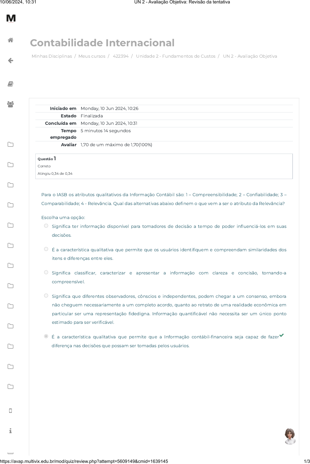Minhas Disciplinas / Meus cursos / 422394 / Unidade 2 - Fundamentos de Custos / UN 2 - Avaliação Objetiva Contabilidade Internacional Iniciado em Monday, 10 Jun 2024, 10:26 Estado Finalizada Concluída em Monday, 10 Jun 2024, 10:31 Tempo empregado 5 minutos 14 segundos Avaliar 1,70 de um máximo de 1,70(100%) Questão 1 Correto Atingiu 0,34 de 0,34 Para o IASB os atributos qualitativos da Informação Contábil são: 1 – Compreensibilidade; 2 – Con�abilidade; 3 – Comparabilidade; 4 - Relevância. Qual das alternativas abaixo de�nem o que vem a ser o atributo da Relevância? Escolha uma opção: Signi�ca ter informação disponível para tomadores de decisão a tempo de poder in�uenciá-los em suas decisões. É a característica qualitativa que permite que os usuários identi�quem e compreendam similaridades dos itens e diferenças entre eles. Signi�ca classi�car, caracterizar e apresentar a informação com clareza e concisão, tornando-a compreensível. Signi�ca que diferentes observadores, cônscios e independentes, podem chegar a um consenso, embora não cheguem necessariamente a um completo acordo, quanto ao retrato de uma realidade econômica em particular ser uma representação �dedigna. Informação quanti�cável não necessita ser um único ponto estimado para ser veri�cável. É a característica qualitativa que permite que a Informação contábil-�nanceira seja capaz de fazer diferença nas decisões que possam ser tomadas pelos usuários. 10/06/2024, 10:31 UN 2 - Avaliação Objetiva: Revisão da tentativa https://avap.multivix.edu.br/mod/quiz/review.php?attempt=5609149&cmid=1639145 1/3 https://avap.multivix.edu.br/my/ https://avap.multivix.edu.br/course/view.php?id=26403 https://avap.multivix.edu.br/course/view.php?id=26403§ion=3 https://avap.multivix.edu.br/mod/quiz/view.php?id=1639145 https://avap.multivix.edu.br/my/ https://avap.multivix.edu.br/course/view.php?id=26403 https://avap.multivix.edu.br/user/index.php?id=26403 https://avap.multivix.edu.br/course/view.php?id=26403§ion=1 https://avap.multivix.edu.br/course/view.php?id=26403§ion=2 https://avap.multivix.edu.br/course/view.php?id=26403§ion=3 https://avap.multivix.edu.br/course/view.php?id=26403§ion=4 https://avap.multivix.edu.br/course/view.php?id=26403§ion=5 https://avap.multivix.edu.br/course/view.php?id=26403§ion=6 https://avap.multivix.edu.br/course/view.php?id=26403§ion=7 https://avap.multivix.edu.br/course/view.php?id=26403§ion=8 https://avap.multivix.edu.br/course/view.php?id=26403§ion=9 https://avap.multivix.edu.br/course/view.php?id=26403§ion=10 https://avap.multivix.edu.br/course/view.php?id=26403§ion=11 https://avap.multivix.edu.br/course/view.php?id=26403§ion=12 https://avap.multivix.edu.br/course/view.php?id=26403§ion=13 https://avap.multivix.edu.br/hooks/portal/ https://avap.multivix.edu.br/mod/page/view.php?id=1252%2F%22%20target%3D%22_blank https://avap.multivix.edu.br/calendar/view.php/ https://avap.multivix.edu.br/ https://avap.multivix.edu.br/ https://avap.multivix.edu.br/ https://avap.multivix.edu.br/ Questão 2 Correto Atingiu 0,34 de 0,34 Questão 3 Correto Atingiu 0,34 de 0,34 O IASC emitia as conhecidas NIC’s (International Accounting Standards – IAS) - Normas Internacionais de Contabilidade. Porém, em meados de abril do ano 2001, houve uma estruturação, onde surgiu a Junta de Normas Internacionais de Contabilidade (International Accounting Standards Board – IASB). Como passaram a se chamar as Normas emitidas pelo IASB? Escolha uma opção: IOSCO - International of Securities Comiission IFRS - International Financial Reporting Standards IFAC - International Federation of Accoutants OECD - Organization for Economic Cooperation and Development FASB - Financial Accouting Standards Bord Agindo como meio importante para conceituações, esse documento traz a de�nição de itens como: usuários e suas necessidades de informação; objetivo das demonstrações contábeis; pressupostos básicos (regime de competência e continuidade); características qualitativas das demonstrações contábeis; elementos das demonstrações contábeis; reconhecimento dos elementos das demonstrações contábeis; avaliação dos elementos das demonstrações contábeis e conceitos de capital e manutenção do capital. Qual documento é esse? Escolha uma opção: Estrutura Conceitual para a Preparação e Apresentação das Demonstrações Contábeis. NBTG - 04 Código de Pronunciamento Contábil Internacional NBTG - 01 Código de Pronunciamento Contábil 01 10/06/2024, 10:31 UN 2 - Avaliação Objetiva: Revisão da tentativa https://avap.multivix.edu.br/mod/quiz/review.php?attempt=5609149&cmid=1639145 2/3 https://avap.multivix.edu.br/my/ https://avap.multivix.edu.br/course/view.php?id=26403 https://avap.multivix.edu.br/user/index.php?id=26403 https://avap.multivix.edu.br/course/view.php?id=26403§ion=1 https://avap.multivix.edu.br/course/view.php?id=26403§ion=2 https://avap.multivix.edu.br/course/view.php?id=26403§ion=3 https://avap.multivix.edu.br/course/view.php?id=26403§ion=4 https://avap.multivix.edu.br/course/view.php?id=26403§ion=5 https://avap.multivix.edu.br/course/view.php?id=26403§ion=6 https://avap.multivix.edu.br/course/view.php?id=26403§ion=7 https://avap.multivix.edu.br/course/view.php?id=26403§ion=8 https://avap.multivix.edu.br/course/view.php?id=26403§ion=9 https://avap.multivix.edu.br/course/view.php?id=26403§ion=10 https://avap.multivix.edu.br/course/view.php?id=26403§ion=11 https://avap.multivix.edu.br/course/view.php?id=26403§ion=12 https://avap.multivix.edu.br/course/view.php?id=26403§ion=13 https://avap.multivix.edu.br/hooks/portal/ https://avap.multivix.edu.br/mod/page/view.php?id=1252%2F%22%20target%3D%22_blank https://avap.multivix.edu.br/calendar/view.php/ https://avap.multivix.edu.br/ https://avap.multivix.edu.br/ https://avap.multivix.edu.br/ https://avap.multivix.edu.br/ Questão 4 Correto Atingiu 0,34 de 0,34 Questão