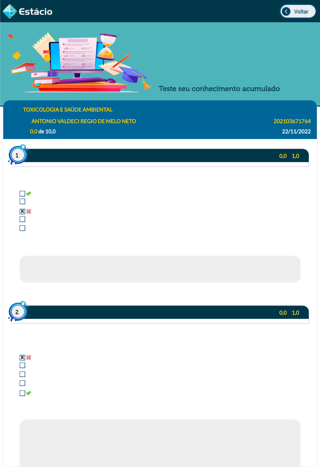Meus Simulados Teste seu conhecimento acumulado Disc.: TOXICOLOGIA E SAÚDE AMBIENTAL Aluno(a): ANTONIO VALDECI REGIO DE MELO NETO 202103671764 Acertos: 0,0 de 10,0 22/11/2022 Acerto: 0,0 / 1,0 São os que, devido ao choque, ao impacto ou à exposição ao calor, podem explodir. Estes reagentes devem ser armazenados em local isolado das restantes áreas. Referimo-nos aos: Reagentes explosivos Reagentes corrosivos Reagentes tóxicos Reagentes oxidantes Reagentes in�amáveis Respondido em 22/11/2022 22:41:15 Explicação: A resposta correta é: Reagentes explosivos Acerto: 0,0 / 1,0 Aerodispersoides são partículas sólidas ou líquidas dispersas no ar que podem ser nocivas à saúde. A este respeito, é correto a�rmar que micropartículas sólidas produzidas por condensação de vapores de substâncias sólidas à temperatura ambiente são denominados(as): Fumaças Neblinas Poeiras Névoas Fumos metálicos Respondido em 22/11/2022 22:41:16 Explicação: Os gases são substâncias químicas que se apresentam em estado gasoso sob condições normais de temperatura e pressão (25 °C e 760 mmHg). Essas substâncias não têm forma e podem ocupar qualquer espaço disponível (Ex.: monóxido de carbono, cloro, dióxido de enxofre, gás sulfídrico). O tamanho das partículas dos aerodispersoides varia Questão1a Questão2a 10/06/2024, 11:46 Estácio: Alunos https://simulado.estacio.br/alunos/ 1/5 https://simulado.estacio.br/alunos/inicio.asp https://simulado.estacio.br/alunos/inicio.asp javascript:voltar(); javascript:voltar(); de acordo com a substância. No geral, as poeiras são formadas por partículas de mais de 0,5 µm (mícrons ou micrômeros) de diâmetro, e os fumos metálicos, por partículas menores do que 0,5 µm (1 µm= 0,000001 m). Acerto: 0,0 / 1,0 Em relação à presença de resíduos de praguicidas nos alimentos, julgue os itens a seguir I. Os praguicidas são substâncias pouco seletivas, portanto apresentam um amplo espectro de ação biocida, oferecendo à população um risco toxicológico residual quando presente nos alimentos. II. A contaminação dos alimentos por praguicidas é do tipo direta e controlável. III. Os principais praguicidas utilizados atualmente são os piretróides e organoclorados. IV. Inseticidas carbamatos e organofosforados são amplamente utilizados pois ostentam um longo efeito residual, portanto, necessitam de poucas aplicações para o controle de pragas, representando economia aos trabalhadores rurais. Estão corretos apenas os itens: III e IV. I e II. Somente III. Somente I I e III. Respondido em 22/11/2022 22:41:18 Explicação: Os praguicidas são usualmente empregados, seja no controle de insetos, no tratamento de ervas daninhas, para eliminar a presença de fungos na produção e armazenamento de grãos, entre outros. Apesar de indesejáveis, são imprescindíveis para controlar as pragas e tornar a produção de alimentos viável. Nesse cenário, os mais utilizados são os inseticidas que apresentam baixo efeito residual: carbamatos, organofosforados e piretróides. Já os inseticidas organoclorados, devido sua longa permanência no meio ambiente, e por consequência nos alimentos, foram substituídos por aqueles de baixa persistência ambiental. Os inseticidas organofosforados e os carbamatos (nitrogenados) são instáveis quimicamente e por isso se degradam facilmente no meio ambiente, apresentando, portanto baixo efeito residual. Acerto: 0,0 / 1,0 A Toxicologia alimentar estuda os agentes tóxicos propagados pelos alimentos, determinando a presença, concentração e a origem do xenobiótico no produto alimentício, fatores que in�uenciam o seu aparecimento, bem como os efeitos nocivos na saúde do consumidor. Com base nos fundamentos da Toxicologia de Alimentos, assinale a alternativa correta: Faz parte da área de atuação da Toxicologia de Alimentos a prevenção e o tratamento da intoxicação alimentar. As substâncias nutrientes são os principais constituintes dos alimentos e responsáveis pelas intoxicações humanas. Os contaminantes dos alimentos estão naturalmente presentes nos alimentos processados. Os inibidores de tripsina e quimiotripsina são exemplos de substâncias antinutricionais, pois atrapalham a absorção e utilização dos nutrientes provenientes da dieta. Compostos que alteram a absorção de algum nutriente são denominados não nutrientes, como por exemplo, a tiaminase encontrada em algumas espécies de peixe. Respondido em 22/11/2022 22:41:19 Questão3a Questão4a 10/06/2024, 11:46 Estácio: Alunos https://simulado.estacio.br/alunos/ 2/5 Explicação: O tratamento das intoxicações alimentares é premissa da Toxicologia Clínica. Paralelamente, a Toxicologia de alimentos estuda todos os aspectos envolvidos na exposição dos seres humanos aos xenobióticos presentes nos alimentos, atuando especialmente na prevenção dessas intoxicações. O alimento é composto por nutrientes, não nutrientes e os antinutritivos. Os primeiros compreendem as substâncias encontradas nos alimentos, que são úteis para o metabolismo e indispensáveis para o crescimento, desenvolvimento e manutenção das funções vitais dos organismos vivos. Os não nutrientes são os principais constituintes dos alimentos, sendo, primordialmente, a principal fonte de agentes tóxicos de origem natural. As substâncias antinutricionais atuam diminuindo a biodisponibilidade dos nutrientes, seja alterando a absorção, favorecendo a eliminação ou ainda degradando os nutricionais. Acerto: 0,0 / 1,0 A administração de múltiplas doses de carvão ativado é um procedimento útil em casos de ingestão de: Substâncias que promovem aumento do peristaltismo intestinal. Substâncias cáusticas, para impedir a progressão das lesões em virtude de sua ação demulcente Substâncias que apresentam recirculação êntero-hepática. Metanol e etanol Substâncias hidrossolúveis. Respondido em 22/11/2022 22:41:21 Explicação: O uso de car