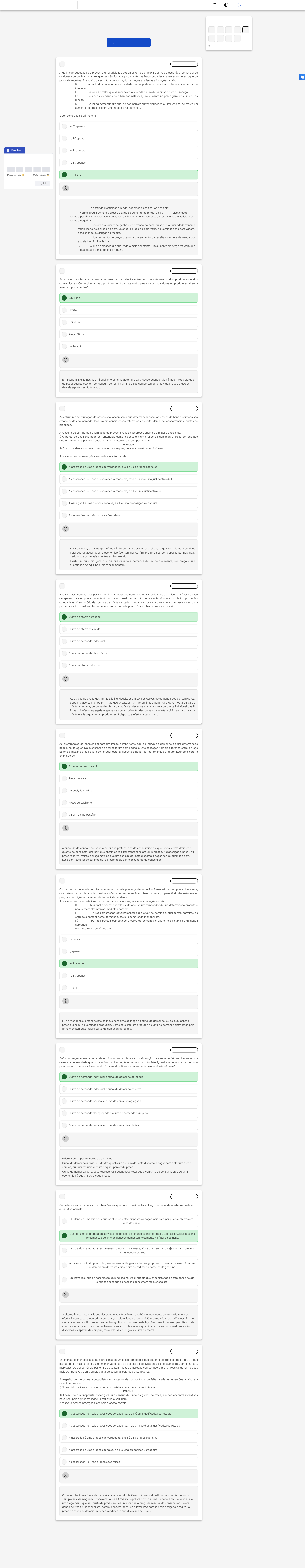 Você acertou 0 de 9 questões Verifique o seu desempenho e continue treinando! Você pode refazer o exercício quantas vezes quiser. Verificar Desempenho A B C D E A B C D E A B C D E A B C D E A B C D E A B C D E A B C D E A B C D E A B C D E 1 Marcar para revisão A definição adequada de preços é uma atividade extremamente complexa dentro da estratégia comercial de qualquer companhia, uma vez que, se não for adequadamente realizada pode levar a excesso de estoque ou perda de receitas. A respeito da estrutura de formação de preços analise as afirmações abaixo. I� A partir do conceito de elasticidade-renda, podemos classificar os bens como normais e inferiores. II� Receita é o valor que se recebe com a venda de um determinado bem ou serviço. III� Quando a demanda pelo bem for inelástica, um aumento no preço gera um aumento na receita. IV� A lei da demanda diz que, se não houver outras variações ou influências, se existe um aumento de preço existirá uma redução na demanda. É correto o que se afirma em: I e IV apenas II e IV, apenas I e III, apenas II e III, apenas I, II, III e IV Questão não respondida Opa! A alternativa correta é a letra E. Confira o gabarito comentado! Gabarito Comentado I. A partir da elasticidade-renda, podemos classificar os bens em: Normais: Cuja demanda cresce devido ao aumento da renda, e cuja elasticidade- renda é positiva. Inferiores: Cuja demanda diminui devido ao aumento da renda, e cuja elasticidade- renda é negativa. II. Receita é o quanto se ganha com a venda do bem, ou seja, é a quantidade vendida multiplicada pelo preço do bem. Quando o preço do bem varia, a quantidade também variará, ocasionando mudanças na receita. III. Um aumento de preço ocasiona um aumento da receita quando a demanda por aquele bem for inelástica. IV. A lei da demanda diz que, todo o mais constante, um aumento do preço faz com que a quantidade demandada se reduza. 2 Marcar para revisão As curvas de oferta e demanda representam a relação entre os comportamentos dos produtores e dos consumidores. Como chamamos o ponto onde não existe razão para que consumidores ou produtores alterem seus comportamentos? Equilíbrio Oferta Demanda Preço ótimo Inalteração Questão não respondida Opa! A alternativa correta é a letra A. Confira o gabarito comentado! Gabarito Comentado Em Economia, dizemos que há equilíbrio em uma determinada situação quando não há incentivos para que qualquer agente econômico (consumidor ou firma) altere seu comportamento individual, dado o que os demais agentes estão fazendo. 3 Marcar para revisão As estruturas de formação de preços são mecanismos que determinam como os preços de bens e serviços são estabelecidos no mercado, levando em consideração fatores como oferta, demanda, concorrência e custos de produção. A respeito de estruturas de formação de preços, avalie as asserções abaixo e a relação entre elas. I� O ponto de equilíbrio pode ser entendido como o ponto em um gráfico de demanda e preço em que não existem incentivos para que qualquer agente altere o seu comportamento. PORQUE II� Quando a demanda de um bem aumenta, seu preço e a sua quantidade diminuem. A respeito dessas asserções, assinale a opção correta. A asserção I é uma proposição verdadeira, e a II é uma proposição falsa As asserções I e II são proposições verdadeiras, mas a II não é uma justificativa da I As asserções I e II são proposições verdadeiras, e a II é uma justificativa da I A asserção I é uma proposição falsa, e a II é uma proposição verdadeira As asserções I e II são proposições falsas Questão não respondida Opa! A alternativa correta é a letra A. Confira o gabarito comentado! Gabarito Comentado Em Economia, dizemos que há equilíbrio em uma determinada situação quando não há incentivos para que qualquer agente econômico (consumidor ou firma) altere seu comportamento individual, dado o que os demais agentes estão fazendo. Existe um princípio geral que diz que quando a demanda de um bem aumenta, seu preço e sua quantidade de equilíbrio também aumentam. 4 Marcar para revisão Nos modelos matemáticos para entendimento do preço normalmente simplificamos a análise para falar do caso de apenas uma empresa, no entanto, no mundo real um produto pode ser fabricado / distribuído por várias companhias. O somatório das curvas de oferta de cada companhia nos gera uma curva que mede quanto um produtor está disposto a ofertar de seu produto a cada preço. Como chamamos esta curva? Curva de oferta agregada Curva de oferta resumida Curva de demanda individual Curva de demanda da indústria Curva de oferta industrial Questão não respondida Opa! A alternativa correta é a letra A. Confira o gabarito comentado! Gabarito Comentado As curvas de oferta das firmas são individuais, assim com as curvas de demanda dos consumidores. Suponha que tenhamos N firmas que produzam um determinado bem. Para obtermos a curva de oferta agregada, ou curva de oferta da indústria, devemos somar a curva de oferta individual das N firmas. A oferta agregada é apenas a soma horizontal das curvas de oferta individuais. A curva de oferta mede o quanto um produtor está disposto a ofertar a cada preço. 5 Marcar para revisão As preferências do consumidor têm um impacto importante sobre a curva de demanda de um determinado item. É muito agradável a sensação de ter feito um bom negócio. Esta sensação vem da diferença entre o preço pago e o máximo preço que o comprador estaria disposto a pagar por determinado produto. Este bem-estar é chamado de Excedente do consumidor Preço reserva Disposição máxima Preço de equilíbrio Valor máximo possível Questão não respondida Opa! A alternativa correta é a letra A. Confira o gabarito comentado! Gabarito Comentado A curva de demanda é derivada a partir das preferências dos consumidores, que, por sua vez, definem o quanto