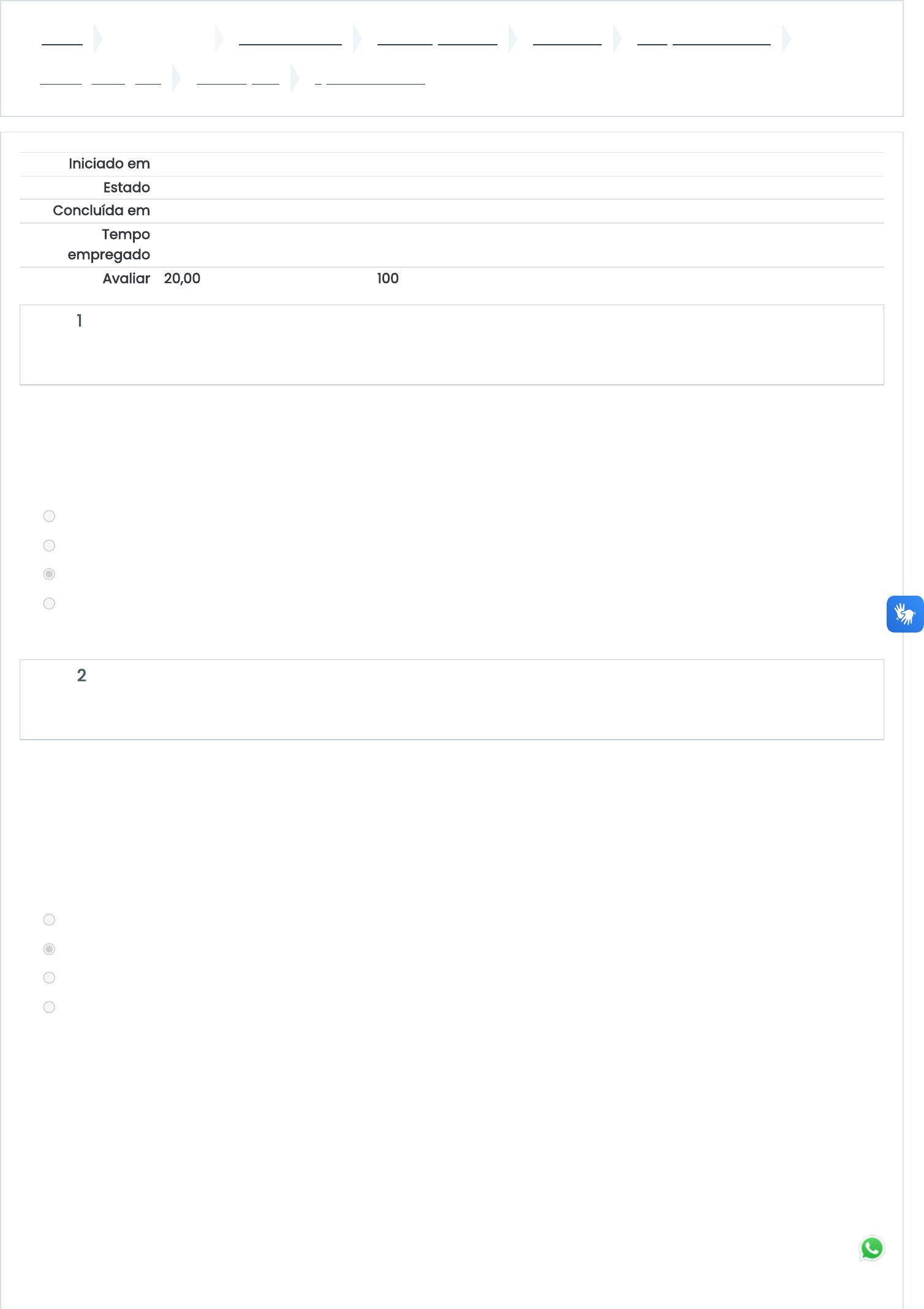 Painel Meus cursos CURSOS FUNEC Graduação - EAD Aluno EAD JUNÇÕES DE TURMA Fisiologia Vegetal AVALIAÇÕES QUESTIONÁRIO 2 Iniciado em Sunday, 7 Apr 2024, 11:39 Estado Finalizada Concluída em Sunday, 7 Apr 2024, 11:42 Tempo empregado 3 minutos 18 segundos Avaliar 20,00 de um máximo de 20,00(100%) Questão 1 Completo Atingiu 2,00 de 2,00 Questão 2 Completo Atingiu 2,00 de 2,00 Quando a difusão de água ocorre através de uma membrana permeável à água, mas impermeável a solutos (membrana semipermeável), esse movimento é chamado de: Escolha uma opção: a. Transpiração. b. Simbiose. c. Osmose. d. Mecanismo ativo. A luz é um fator de grande influência no crescimento dos caules pois, normalmente, eles crescem em direção à luz, o chamado fototropismo positivo. Assinale a alternativa que contém o nome do principal hormônio vegetal envolvido no fototropismo positivo dos caules e na dominância apical. Escolha uma opção: a. Citocininas. b. Auxinas. c. Etileno. d. Giberelinas. https://ava.funec.br/my/ https://ava.funec.br/course/index.php?categoryid=10 https://ava.funec.br/course/index.php?categoryid=17 https://ava.funec.br/course/index.php?categoryid=19 https://ava.funec.br/course/index.php?categoryid=77 https://ava.funec.br/course/view.php?id=921 https://ava.funec.br/course/view.php?id=921#section-6 https://ava.funec.br/mod/quiz/view.php?id=13199 Questão 3 Completo Atingiu 2,00 de 2,00 Questão 4 Completo Atingiu 2,00 de 2,00 Questão 5 Completo Atingiu 2,00 de 2,00 O ácido abscísico (ABA) é um hormônio que se caracteriza por inibir ou retardar o crescimento e/ou desenvolvimento da planta. Assinale a alternativa que corresponde a atuação do ABA. Escolha uma opção: a. Ele atua no processo de absorção de água pelas raízes. b. Acelera a maturação dos frutos. c. É responsável pela dominância apical. d. Ele pode atuar induzir a planta à dormência. É muito comum o transporte de frutos entre diferentes regiões do país. Nos caminhões frigoríficos, esses frutos chegam sem que ocorra o amadurecimento, pois a baixa temperatura: Escolha uma opção: a. aumenta a quantidade de ácidos e interrompe a fotossíntese. b. inibe a síntese do gás etileno e reduz a respiração. c. inibe a decomposição de clorofila e aumenta a produção de etileno. d. inibe a respiração e aumenta a auxina. A respiração aeróbica nas plantas pode ser considerada o processo inverso da fotossíntese, pois a energia armazenada em compostos orgânicos (glicose, lipídios, proteínas etc.) é liberada na forma de: Escolha uma opção: a. ATP. b. Calor. c. Oxigênio. d. CO .2 Questão 6 Completo Atingiu 2,00 de 2,00 Questão 7 Completo Atingiu 2,00 de 2,00 Questão 8 Completo Atingiu 2,00 de 2,00 As auxinas são os hormônios conhecidos como reguladores do crescimento. Assinale a alternativa que corresponde ao principal local de produção das auxinas. Escolha uma opção: a. vasos condutores. b. meristemas. c. parede celular. d. cloroplastos. Para impedir o dano por aquecimento de estruturas celulares, a célula oxida a sacarose em uma série de reações graduais. Essas reações podem ser agrupadas em quatro processos principais: a glicólise, a rota oxidativa das pentoses fosfato, o ciclo do ácido cítrico e a fosforilação oxidativa. Na fosforilação oxidativa, ocorre: Escolha uma opção: a. armazenamento de ácidos graxos. b. decomposição de lipídios. c. degradação de proteínas. d. a transferência de elétrons ao longo de uma cadeia transportadora de elétrons. A água participa diretamente de diversas reações químicas que ocorrem na planta, como, por exemplo, na fotossíntese. Também é considerada “solvente universal”, pois: Escolha uma opção: a. dissolve todas as substâncias. b. dissolve a maior variedade de substâncias que qualquer outro líquido. c. consegue reagir com várias substâncias. d. dissolve apenas substâncias simples. Questão 9 Completo Atingiu 2,00 de 2,00 Questão 10 Completo Atingiu 2,00 de 2,00 Todos os hormônios são compostos orgânicos produzidos naturalmente pelas plantas, mas também existem formas de sintetizá-los artificialmente. Como são denominados os hormônios sintéticos? Escolha uma opção: a. Reguladores endógenos. b. Agroreguladores. c. Hormônios transformadores. d. Fitorreguladores. A água move-se de uma região de potencial hídrico maior para outra de potencial hídrico menor, não importando a razão da diferença no potencial hídrico. Um exemplo simples é a água correndo morro abaixo em resposta à gravidade. Esse processo denomina-se: Escolha uma opção: a. Fluxo de massa. b. Difusão gravitacional. c. Osmose. d. Difusão simples. Manter contato RA (33) 99986-3935 secretariaead@funec.br Baixar o aplicativo móvel. tel:RA (33) 99986-3935 mailto:secretariaead@funec.br https://www.facebook.com/caratingaunec https://twitter.com/caratingaunec https://download.moodle.org/mobile?version=2019052001.02&lang=pt_br&iosappid=633359593&androidappid=com.moodle.moodlemobile