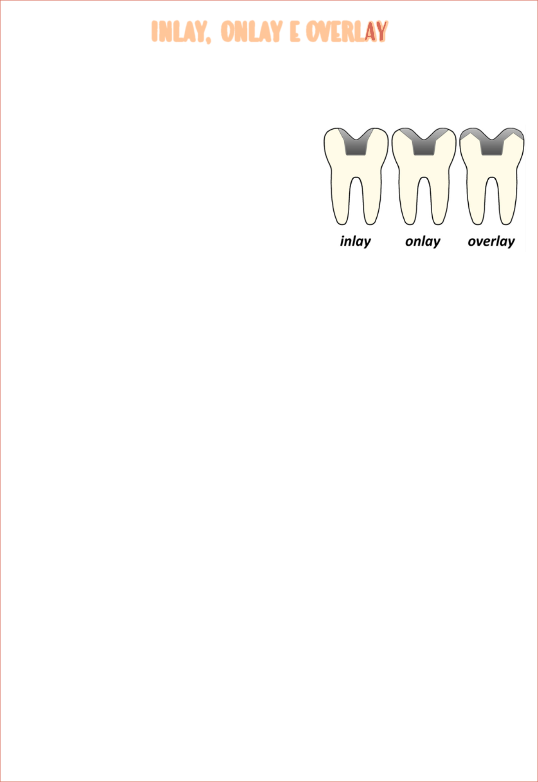INLAY, ONLAY E OVERLAY As restaurações indiretas são muito utilizadas na odontologia. Elas podem ser Inlay, Onlay ou Overlay, cada uma com suas características. Vantagens: Ø Mais fácil de reproduzir os contatos interproximais; Ø Minimiza a contração de polimerização a apenas uma fina camada do cimento resinoso usado para a fixação; Ø material restaurador apresenta melhores propriedades em comparação com as resinas diretas. Indicações: Ø Restaurações amplas em dentes posteriores; Ø Istmo oclusal maior que a metade da distância intercúspidea ou quando o preparo envolver uma ou mais cúspides; Ø Quando uma restauração estética seja necessária e uma coroa total não seja desejada. Caixa Proximal: • Parede vestibular e lingual expulsiva; • Parede axial plana e levemente expulsiva no sentido axioproximal com terminação em chanfrado; • Ângulos externos arredondados. Caixa Oclusal : • Abertura Vestíbulolingual de 1,5 a 2mm; • Parede pulpar plana; • Profundidade oclusal 2 mm; • Parede vestibular e lingual levemente expulsiva; • Ângulos internos arredondados; • Ângulo cavossuperficial nítido e sem bisel. • Chanfro nas cúspides de contenção cêntrica para ONLAY/OVERLAY INLAY, ONLAY E OVERLAY Vantagens do Chanfro: • Linha de acabamento reproduzida com material restaurador; • Transição estética e configuração adesiva favoráveis; • Escoamento para o cimento resinoso; • Ângulos internos arredondados. Desvantagens do Chanfro: • Dificuldade de se obter acabamento das restaurações indiretas; • Maior risco de fratura marginal. Brocas para preparo: • 2135: Extensão do sulco central • 3131: Preparo proximal • 4138: Canaletas e caixas oclusais • 3139F/4138F: Acabamento do preparo DICA: As paredes e margens do preparo devem sofrer acabamento com brocas multilaminadas e instrumentos manuais com o intuito de proporcionar paredes e margens lisas e definidas que facilitam as etapas de moldagem, confecção e adaptação da restauração. Escolha de cor: Técnica da “estratificação natural”. Ela deve escolher a cor da dentina na região cervical do dente e do esmalte no terço oclusal utilizando a escala VITA. Provisórios: • Resina fotoativada específica que apresenta uma consistência borrachóide após sua fotopolimerização como Systemp, Bioplic..; • Resina acrílica quimicamente ativada fixada com cimentos provisórios; • Resina composta fotopolimerizavel sem o uso de adesivo na cavidade. Prova da peça (observar): • Ponto de contato interproximal; • Adaptação marginal; • Contorno; • Cor. DICA: Não prove a restauração indireta sob isolamento absoluto, pois um pequeno deslocamento proximal do dente que recebe o grampo pode interferir na exata relação da distância interproximal. Com isso o profissional pode erroneamente ajustar áreas proximais da restauração e INLAY, ONLAY E OVERLAY comprometer o ponto de contato interproximal. Preparo da peça (Cerâmica): • Condicionamento com ácido fluorídrico (8 a 12%); • Silanizaçao. Preparo da peça (Resina composta): • Condicionamento com ácido fluorídrico (8 a 12%); • Silanizaçao; • Sistema adesivo. Preparo do dente: • Condicionamento com ácido fosfórico; • Sistema Adesivo. Cimentação: • Cimento DUAL, Autocondicionante ou resina composta micro-hibrida ou nanoparticulada (nesse caso um aparelho para aquecer o compósito e favorecer seu escoamento deve ser empregado). • Fotopolimerizar cada face por 60 segundos. Resumo dos preparos em Inlays e Onlays • Preparos expulsivos, com angulação de 10° a 12° • Redução de área proximal livre: 0,5mm a 1,0mm • Redução oclusal: 1,5mm a 2 mm (para cúspides cêntricas) • Ângulos internos arredondados (permitindo melhor escoamento do cimento) • Parede pulpar não plana, promovendo depressão em área de sulco • Cavo superficial mais próximo de 90° • Chanfro profundo externo em onlays