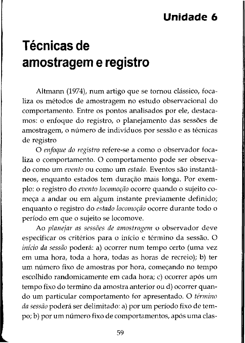 Unidade 6 Técnicas de amostragem e registro Altmann (1974), num artigo que se tornou clássico, foca liza os métodos de amostragem no estudo observacional do comportamento. Entre os pontos analisados por ele, destaca mos: o enfoque do registro, o planejamento das sessões de amostragem, o número de indivíduos por sessão e as técnicas de registro O enfoque do registro refere-se a como o observador foca liza o comportamento. O comportamento pode ser observa do como um evento ou como um estado. Eventos são instantâ neos, enquanto estados tem duração mais longa. Por exem plo: o registro do evento locomoção ocorre quando o sujeito co meça a andar ou em algum instante previamente definido; enquanto o registro do estado locomoção ocorre durante todo o período em que o sujeito se locomove. Ao planejar as sessões de amostragem o observador deve especificar os critérios para o início e término da sessão. O início da sessão poderá: a) ocorrer num tempo certo (uma vez em uma hora, toda a hora, todas as horas de recreio); b) ter um número fixo de amostras por hora, começando no tempo escolhido randomicamente em cada hora; c) ocorrer após um tempo fixo do termino da amostra anterior ou d) ocorrer quan do um particular comportamento for apresentado. O término da sessão poderá ser delimitado: a) por um período fixo de tem po; b) por um número fixo de comportamentos, após uma clas 59 se particular de interação ter terminado ou c) até o sujeito não ser mais visto. Com relação ao número de indivíduos focalizados na ses- são, Carvalho (1992) destaca os registros: focais, de varre dura ou de episódios. No registro focal um indivíduo parti cular é focalizado durante um período inteiro da amostra. A escolha do indivíduo focal deverá ser feita por sorteio ou através de algum critério com portam ental, por exemplo a prim eira criança que subir no escorregador, a primeira criança que interagir com outra criança etc. No registro de varredura, todos os indivíduos presentes na área são focali zados, em sequência casual, durante o tempo mínimo ne cessário para que se possa identificá-los, descrever sua po sição e orientação no ambiente e a atividade que desenvol vem. A ordem da observação pode se basear na localização dos indivíduos ou num sorteio anterior. No registro de episó dios é feito o registro, por tempo variável, de um episódio (por ex. brincadeira, agressão etc.). Castro e Almeida (1981), através de registro de episódios, levantaram dados acerca da incidência de comportamento agressivo em escolares. Quando um episódio de agressão ocorria, o observador re gistrava cursivamente o sexo dos envolvidos, sexo do ini ciador, motivo do incidente, comportamentos emitidos, in tervenção de adultos, desfecho do incidente e atividades se guintes dos protagonistas. Entre as decisões a serem tomadas quanto a^ amostragem estão: o enfoque do registro; o planejamento das sessões: início e termino; o número ^de indivíduos por sessão; e as técnicas de registro, j 60 As técnicas de registro A observação e registro dos comportamentos pode ser feita de forma direta ou indireta. Na observação direta, o observador focaliza o comportamento do sujeito, ou melhor as ações apresentadas pelo sujeito num determinado espaço de tempo. Na observação indireta, o observador focaliza o pro duto do comportamento do sujeito: tais como escritos, dese nhos, pinturas, quilômetros percorridos, troféus e outras pro duções intelectuais, artísticas ou esportivas. As técnicas de observação direta serão classificadas, aqui, de acordo com a forma de registro e quanto ao período em que o mesmo é efetuado. Analisando a forma do registro teremos os registros cur sivo e categorizado: Registro cursivo é aquele em que o observador registra os eventos, tais como eles se apresentam, cuidando apenas do uso da linguagem científica. Por exemplo, ao observar as brin cadeiras de uma menina de dois anos, o observador anotaria: B levanta-se do chão, corre na direção da boneca que está so bre a mesa etc. Já no registro categorizado, o observador trabalha com categorias pré-definidas. As categorias são definidas com base em trabalho anterior do próprio pesquisador, no conhecimen to que tem a respeito do assunto, na literatura e trabalhos de outros pesquisadores. Por exemplo, o observador poderia clas sificar as brincadeiras de um menino de 8 meses no berço em: brincadeiras com objeto, brincadeiras com as mãos sem obje to, brincadeiras com os pés sem objeto e brincadeiras com o corpo todo sem objeto, e anotar quando as mesmas ocorrem. Com relação ao período em que o registro é efetuado, ele pode ser contínuo ou em amostras de tempo. 61 Registro contínuo consiste em, dentro de um período ininterrupto de tempo de observação, registrar o que ocorre na situação, obedecendo à sequência temporal em que os fa tos se dão. O registro contínuo é uma espécie de "filmagem" do que acontece. Ao registrar, o observador conta o que pre sencia, na sequência em que os fatos ocorrem. Por exemplo, ao registrar o comportamento de uma menina de 9 meses no carrinho, o observador anotaria S pega o chocalho, balança-o de um lado para outro, atira o chocalho no chão etc. O registro por amostra de tempo é feito, como o próprio nome diz, em determinados períodos de tempo ou, melhor, de tempo em tempo. Por exemplo, de 20 em 20 segundos o obser vador olha para o sujeito e registra o que ele está fazendo. ----------------------------------------------------------------------------- As técnicas de observação direta podem ser classificadas: a) quanto à forma do registro em - cursivo e categorizado; b) quanto ao período em que o mesmo é efetuado em - contínuo e amostras de ^tempo._____________________________________ j Combinando os dois critérios, forma e período em que o re gistro é efetuado, teremos: a) registro contínuo cursivo, b) regis tro cont