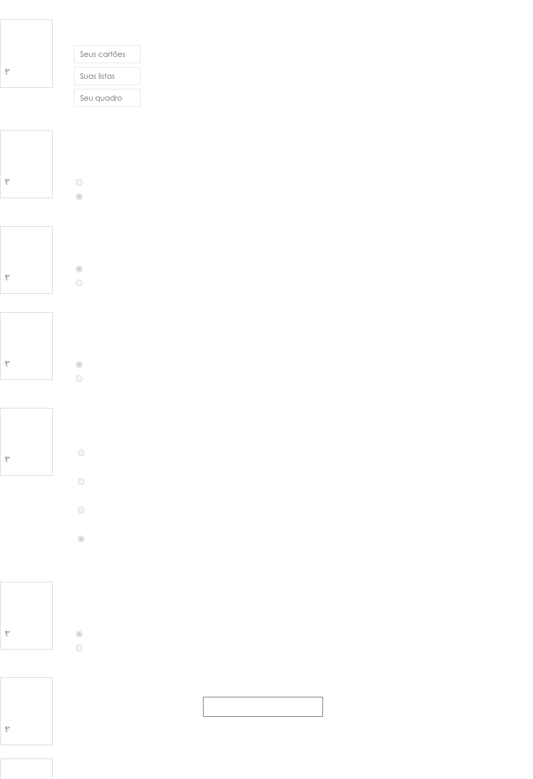 Questão 1 Correto Atingiu 1,00 de 1,00 Marcar questão Questão 2 Correto Atingiu 1,00 de 1,00 Marcar questão Questão 3 Correto Atingiu 1,00 de 1,00 Marcar questão Questão 4 Correto Atingiu 1,00 de 1,00 Marcar questão Questão 5 Correto Atingiu 1,00 de 1,00 Marcar questão Questão 6 Correto Atingiu 1,00 de 1,00 Marcar questão Questão 7 Incorreto Atingiu 0,00 de 1,00 Marcar questão Questão 8 Avaliar 8,00 de um máximo de 10,00(80%) O Trello tem três elementos importantes: São seus detalhes minuciosos: os itens que você quer marcar como feitos na lista. São as categorias gerais dentro do seu quadro. É uma página inteira. Seus cartões Suas listas Seu quadro O gráfico de Gantt demonstra o que foi planejado e o progresso obtido em certo número de atividades relacionadas numa escala vertical de tempo. Escolha uma opção: Verdadeiro Falso O gráfico de Gantt permite expedir, sequenciar e realocar recursos entre as diferentes tarefas. Escolha uma opção: Verdadeiro Falso Flipchart é um tipo de quadro, usado geralmente para exposições didáticas ou apresentações, em que fica preso um bloco de papéis. Escolha uma opção: Verdadeiro Falso Assinale a afirmativa incorreta sobre as funcionalidades do Trello. a. O usuário é livre para colocar quantos cartões quiser. b. O usuário pode criar mais de um quadro no Trello. c. O usuário pode eliminar cartões desnecessários quando quiser. d. Não há como mudar o fundo azul do Trello. O Gantt foi criado inicialmente para o controle de atividades de máquinas, operários e trabalho. A respeito dessa afirmação, pode-se dizer que: Escolha uma opção: Verdadeiro Falso Complete corretamente a lacuna na frase a seguir e com base nos textos do curso: Existe no mercado um conjunto de programas que pode ser utilizado para auxiliar as atividades de gestão de projetos, tais como: Microsoft Project; Artia, Pacotes da empresa Primavera; Timecontrol; dentre outros. Complete corretamente a lacuna na frase a seguir e com base no texto do curso: 12/06/2024, 16:58 6.5 Teste seus conhecimentos: Revisão da tentativa https://moodle.ifrs.edu.br/mod/quiz/review.php?attempt=16274664&cmid=387766 1/2 Correto Atingiu 1,00 de 1,00 Marcar questão Questão 9 Incorreto Atingiu 0,00 de 1,00 Marcar questão Questão 10 Correto Atingiu 1,00 de 1,00 Marcar questão De fácil concepção e leitura, o gráfico de Gantt permite expedir, sequenciar e realocar recursos entre as diferentes tarefas. Ele também trabalha com símbolos para designar itens específicos a serem acompanhados. Complete corretamente a lacuna na frase a seguir e com base nos textos do curso: Vale a pena você aprender sobre metodologias de trabalho, metodologias ágiles , pode ser bem útil na hora de utilizar a ferramenta Trello. A ferramenta Trello não permite a adição de colaboradores em cartões para ajudar no desenvolvimento. A respeito dessa frase, pode-se dizer que é: Escolha uma opção: Verdadeiro Falso 12/06/2024, 16:58 6.5 Teste seus conhecimentos: Revisão da tentativa https://moodle.ifrs.edu.br/mod/quiz/review.php?attempt=16274664&cmid=387766 2/2