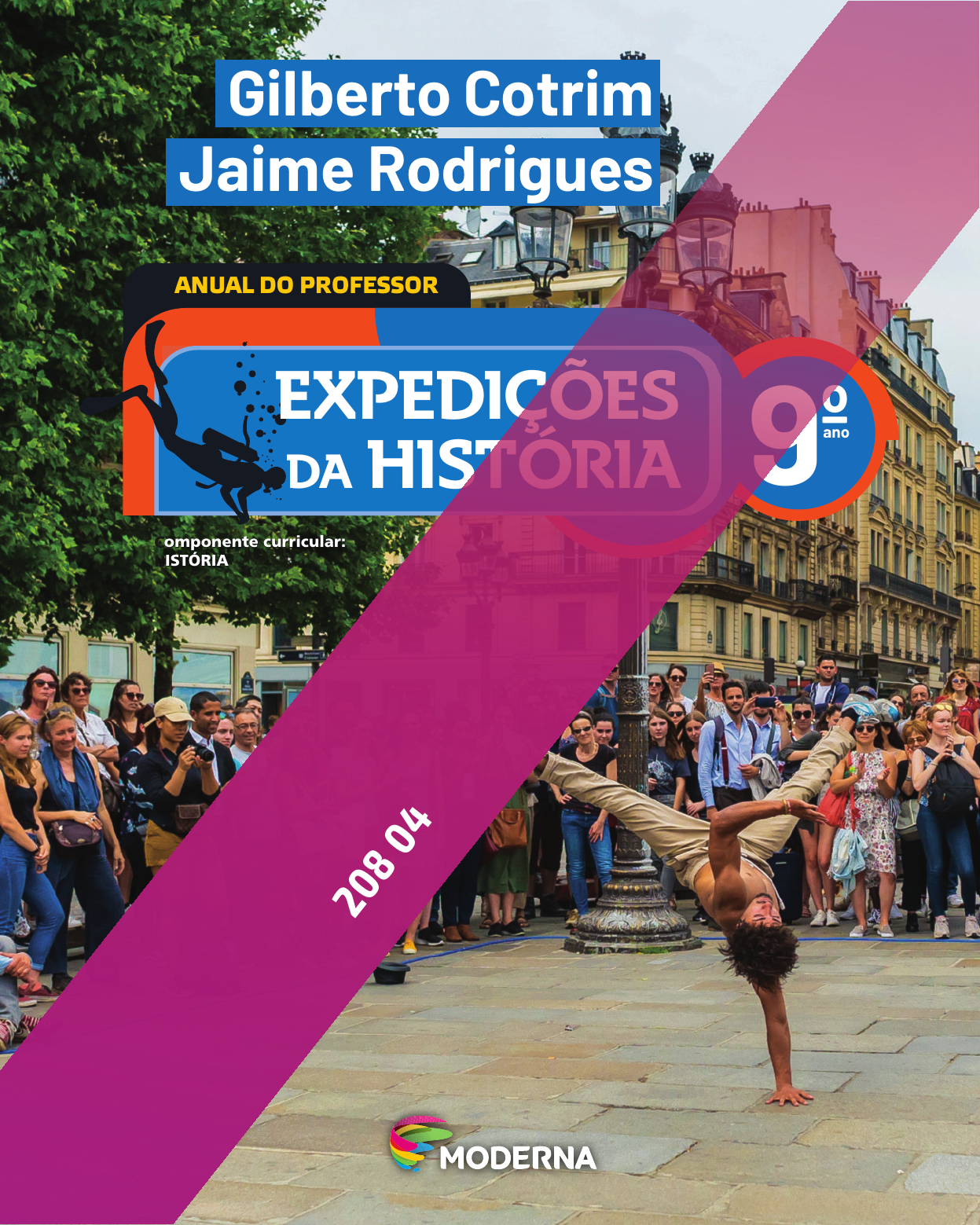 MANUAL DO PROFESSOR Componente curricular: HISTÓRIA Componente curricular: HISTÓRIA Gilberto Cotrim Jaime Rodrigues EXPEDIÇÕES DA HISTÓRIA 9ºano 0026 P24 01 0 0 208 040 MATE RIA L D E D IV ULG AÇà O. V ER Sà O SU BM ET ID A À A VALIA Çà O. Có dig o d a c ol eç ão : PN LD 20 24 - O bje to 1 Componente curricular: HISTÓRIA 1a edição São Paulo, 2022 MANUAL DO PROFESSOR Gilberto Cotrim Mestre em Educação, Arte e História da Cultura pela Universidade Presbiteriana Mackenzie. Licenciado em História pela Faculdade de Educação da Universidade de São Paulo. Bacharel em História pela Faculdade de Filosofia, Letras e Ciências Humanas da Universidade de São Paulo. Bacharel em Direito pelas Faculdades Metropolitanas Unidas. Professor de História em escolas particulares. Advogado inscrito na OAB São Paulo. Autor de livros didáticos. Jaime Rodrigues Doutor em História na área de História Social do Trabalho pela Universidade Estadual de Campinas. Licenciado em História pela Faculdade de Educação da Universidade de São Paulo. Bacharel em História pela Faculdade de Filosofia, Letras e Ciências Humanas da Universidade de São Paulo. Professor de História na Universidade Federal de São Paulo. Ex-professor em escolas públicas e particulares. EXPEDIÇÕES DA HISTÓRIA 9ºano Coordenação editorial: Cesar Brumini Dellore, Leonardo Canuto de Barros Edição de texto: Tuanny F. A. Lanzellotti, Magna Reimberg Teobaldo, Tathiane Gerbovic, Flávia Maíra de Araújo Gonçalves, Cristina Astolfi Carvalho, Leandro Calbente, Caren Inoue Gerência de design e produção gráfica: Patricia Costa Coordenação de produção: Denis Torquato Gerência de planejamento editorial: Maria de Lourdes Rodrigues Coordenação de design e projetos visuais: Marta Cerqueira Leite Projeto gráfico: Tatiane Porusselli, Juliana Medeiros de Albuquerque Capa: Douglas Rodrigues José, Tatiane Porusselli, Apis Design, Fábio Luna Foto: Dançarino se apresentando para espectadores em rua de Paris, na França. Fotografia de 2018. © illpaxphotomatic/Shutterstock Coordenação de arte: Mônica Maldonado Edição de arte: Jéssica Diniz Editoração eletrônica: Setup Editoração Eletrônica Coordenação de revisão: Elaine C. del Nero Revisão: Ana P. Felippe, Frederico Hartje, Palavra Certa Coordenação de pesquisa iconográfica: Flávia Aline de Morais Pesquisa iconográfica: Aline Reis Chiarelli, Etoile Shaw Coordenação de bureau: Rubens M. Rodrigues Tratamento de imagens: Ademir Francisco Baptista, Ana Isabela Pithan Maraschin, Denise Feitoza Maciel, Marina M. Buzzinaro, Vânia Maia Pré-impressão: Alexandre Petreca, Fabio Roldan, José Wagner Lima Braga, Marcio H. Kamoto, Selma Brisolla de Campos Coordenação de produção industrial: Wendell Monteiro Impressão e acabamento: 1 3 5 7 9 10 8 6 4 2 Reprodução proibida. Art. 184 do Código Penal e Lei 9.610 de 19 de fevereiro de 1998. Todos os direitos reservados EDITORA MODERNA LTDA. Rua Padre Adelino, 758 - Belenzinho São Paulo - SP - Brasil - CEP 03303-904 Atendimento: Tel. (11) 3240-6966 www.moderna.com.br 2022 Impresso no Brasil A imagem da capa mostra dançarino se apresentando para espectadores em rua de Paris, na França. As manifestações artísticas ligadas à arte urbana caracterizam as cidades globais no século XXI. III APRESENTAÇÃO Colega professora e professor, Esta coleção desenvolve as competências e as habilidades da Base Nacional Comum Curricular (BNCC) dos Anos Finais do Ensino Fundamental, na área de Ciências Humanas e no componente curricular de História. Nosso objetivo é apresentar caminhos para a construção da cidadania com base em princípios éticos, democráticos e inclusivos. Seguindo as novas tendências pedagógicas, esta coleção promove metodologias ativas, interdiscipli- naridade, pensamento computacional, contextualização dos conteúdos e práticas de pesquisa. Esses modernos recursos pedagógicos contribuem para tornar os estudantes protagonistas do pro- cesso de ensino-aprendizagem. Com isso, mobilizamos a capacidade de argumentação e resolução de problemas, bem como atitudes de reflexão, criatividade, empatia e cooperação. Este Manual do Professor está organizado em torno de itens que apresentam tanto as características gerais da coleção como as abordagens relacionadas especificamente a este volume. Entre os elementos que caracterizam a coleção de maneira geral, são apresentados a concepção da obra e seus pressupostos teórico-metodológicos, propostas de avaliação, possibilidades para ampliar o uso da obra em sala de aula e orientações a respeito das perspectivas para o trabalho com a história e a cultura da África, dos descendentes de africanos e dos povos indígenas do Brasil. Nos itens que tratam do trabalho com este volume em específico, apresentamos, por exemplo, a iden- tificação dos conteúdos com as competências e as habilidades da BNCC e com os temas contemporâneos transversais, os objetivos dos capítulos e suas justificativas de forma articulada com as competências e as habilidades da BNCC, orientações sobre atividades a serem trabalhadas no Livro do Estudante, alertas sobre os pontos essenciais relacionados à BNCC e propostas de leituras e atividades complementares. Bom trabalho com sua turma! Os autores IV SUMÁRIO 1. Concepção da coleção e seus pressupostos ......................................................... VI 1.1. Diálogo passado e presente ........................................................................................................................ VI 1.2. Novos objetos, novos objetivos ............................................................................................................... VII 1.3. História: campo de interpretações ........................................................................................................VIII 1.4. Criança e adolescente: uma breve visão histórica ..............