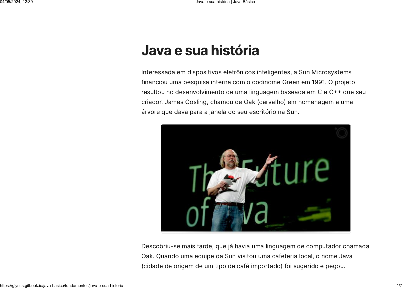 Java e sua história Interessada em dispositivos eletrônicos inteligentes, a Sun Microsystems financiou uma pesquisa interna com o codinome Green em 1991. O projeto resultou no desenvolvimento de uma linguagem baseada em C e C�� que seu criador, James Gosling, chamou de Oak (carvalho) em homenagem a uma árvore que dava para a janela do seu escritório na Sun. Descobriu-se mais tarde, que já havia uma linguagem de computador chamada Oak. Quando uma equipe da Sun visitou uma cafeteria local, o nome Java (cidade de origem de um tipo de café importado) foi sugerido e pegou. 04/05/2024, 12:39 Java e sua história | Java Básico https://glysns.gitbook.io/java-basico/fundamentos/java-e-sua-historia 1/7 Mas o projeto Green atravessava algumas dificuldades. O mercado para dispositivos eletrônicos inteligentes destinados ao consumidor final, não estava se desenvolvendo tão rapidamente como a Sun tinha previsto. Pior ainda, um contrato importante pelo qual a Sun competia fora concedido a outra empresa. Então, o projeto estava em risco de cancelamento. Por pura sorte, a World Wide Web explodiu em popularidade em 1993 e as pessoas da Sun viram o imediato potencial de utilizar Java para criar páginas da Web com o chamado conteúdo dinâmico. Isso deu nova vida ao projeto. Em maio de 1995, a Sun anunciou Java formalmente em uma conferência importante. Normalmente, um evento como esse não teria gerado muita atenção. Entretanto, Java gerou interesse imediato na comunidade comercial, por causa do fenomenal interesse pela World Wide Web. Um pouco mais da história sobre Java no canal do Guanabara Curso em Vídeo Páginas da Web com conteúdo interativo e dinâmico; Aplicações corporativas de grande porte; Softwares destinados ao consumidor final. Aplicativos para Smartphones. Java é agora utilizada praticamente em todo lugar: 04/05/2024, 12:39 Java e sua história | Java Básico https://glysns.gitbook.io/java-basico/fundamentos/java-e-sua-historia 2/7 https://www.youtube.com/watch?v=sTX0UEplF54&list=PLHz_AreHm4dkI2ZdjTwZA4mPMxWTfNSpR Características de cada versão Em 23 de janeiro de 2021 foi celebrado os 25 anos da linguagem Java hoje é mantida pela Oracle Inc. Versão Data Recurso JDK 1.0 23 de janeiro de 1996 É a 1ª versão sendo hoje usada para compatibilidade de browsers mais antigos. 04/05/2024, 12:39 Java e sua história | Java Básico https://glysns.gitbook.io/java-basico/fundamentos/java-e-sua-historia 3/7 Versão Data Recurso JDK 1.1 19 de fevereiro de 1997 Muitas bibliotecas adicionadas, das quais se destacaram o Java RMI, JavaBeans, novo modelo de eventos e JDBC driver, para conexão com banco de dados. J2SE 1.2 8 de dezembro de 1998 Obteve um grande aumento das classes, na biblioteca Java �API�. J2SE 1.3 8 de maio de 2000 Foram incluidas as bibliotecas JNDI, JavaSound, entre outros. J2SE 1.4 6 de fevereiro de 2002 Foi criada a palavra reservada “assert”, biblioteca NIO, entre outros. J2SE 5.0 30 de setembro de 2004 Introdução dos Generics, Enumeração, Auto-boxing, for-each entre outros. JAVA SE 6 11 de dezembro de 2006 Obteve uma melhora significativa na performance e na estabilidade, tendo o surgimento do JIT. JAVA SE 7 28 de julho de 2011 Suporte ao uso de strings em condições do switch, inferência na criação de objetos com tipos 04/05/2024, 12:39 Java e sua história | Java Básico https://glysns.gitbook.io/java-basico/fundamentos/java-e-sua-historia 4/7 Versão Data Recurso genéricos, simplificação na invocação de métodos com parâmetros VarArgs e tipos genéricos, entre outros. JAVA SE 8 18 de março de 2014 Expressões Lambdas, forEach, Consumer e interfaces no java.util.functions, Default methods, Method references e etc. JAVA SE 9 21 de setembro de 2017 Uma das novidades dessa versão, são os factory methods para coleções. JAVA SE 10 20 de março de 2018 Dentre as novidades do java 10 podemos apontar a nova API para criação de coleções imutáveis e a nova forma de se declarar variáveis locais. JAVA SE 11 25 de setembro de 2018 Métodos readString() writeString(). Alguns métodos foram adicionados no tocante a manipulação de cordas como o repeat, strip, stripLeading, stripTrailing, lines e isBlank. Também vale ressaltar a utilização de variáveis por inferência. JAVA SE 12 19 de março de 2019 Expressão Switch melhorada e métodos String indent e transform. 04/05/2024, 12:39 Java e sua história | Java Básico https://glysns.gitbook.io/java-basico/fundamentos/java-e-sua-historia 5/7 Versão Data Recurso JAVA SE 13 17 de setembro de 2019 O Java 13 trouxe dois novos recursos de linguagem, embora no modo de visualização. Usando yield, agora podemos efetivamente retornar valores de uma expressão switch. O segundo recurso de visualização são blocos de texto para Strings de várias linhas, como JSON, XML, HTML, etc. JAVA SE 14 17 de março de 2020 Helpful NullPointerExceptions, nos permite saber quem causou e a consequência, Records �Preview) criado pela oracle para reduzir a verbosidade, Switch Expressions tornando a sintaxe do switch mais fácil e simples, deixando o código mais limpo e agradável. JAVA SE 15 Setembro de 2020 O Java 15, oferece aos desenvolvedores 14 aprimoramentos/alterações, incluindo um módulo de incubadora, três recursos de visualizações, dois recursos obsoletos e duas remoções. Algumas mudanças servem para reduzir o tamanho e o escopo do JDK através da depreciação, que é uma Java Básico Java e sua história Plataformas Configurando o ambiente FUNDAMENTOS Java Básico Search Ctrl � K 04/05/2024, 12:39 Java e sua história | Java Básico https://glysns.gitbook.io/java-basico/fundamentos/java-e-sua-historia 6/7 https://glysns.gitbook.io/java-basico https://glysns.gitbook.io/java-basico/fundamentos/java-e-sua-historia https://glysns.gitbook.io/java-basico/fundamentos/plataformas https://glysns.gitbook.io/java-basico/fundamentos/configurando-o-ambiente-de-desenvolvimento https://glysns.