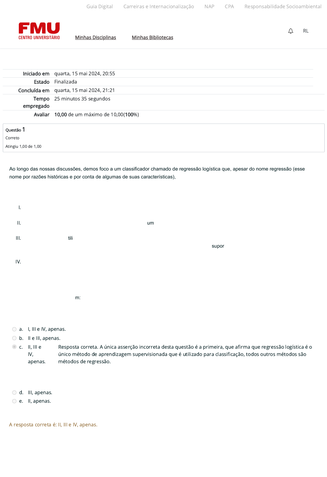 Iniciado em quarta, 15 mai 2024, 20:55 Estado Finalizada Concluída em quarta, 15 mai 2024, 21:21 Tempo empregado 25 minutos 35 segundos Avaliar 10,00 de um máximo de 10,00(100%) Questão 1 Correto Atingiu 1,00 de 1,00 Ao longo das nossas discussões, demos foco a um classificador chamado de regressão logística que, apesar do nome regressão (esse nome por razões históricas e por conta de algumas de suas características), é usado como um classificador. Mas também vimos que existem outros tipos de classificadores. Relativamente a esse assunto de algoritmos de classificação, analise as afirmativas a seguir. I. Regressão logística é o único método de aprendizagem supervisionada que é utilizado para classificação, todos outros métodos são métodos de regressão. II. Apesar do nome regressão logística, o que acaba sendo um pouco confuso para iniciantes, na verdade este é um dos vários métodos de aprendizagem supervisionada utilizado para classificação. III. Dentre os métodos utilizados para classificação se encontram regressão logística, análise discriminante linear (LDA = Linear Discriminant Analysis), árvores de decisão para classificação, máquinas de vetores de suporte (SVM = support vector machines) e k- vizinhos mais próximos (KNN = k-nearest neighbors). IV. Regressão linear não é um método de classificação, mas, sim, um dos métodos preditivos de aprendizagem supervisionada usados na predição de valores de variáveis respostas quantitativas. Está correto o que se afirma em: a. I, III e IV, apenas. b. II e III, apenas. c. II, III e IV, apenas. Resposta correta. A única asserção incorreta desta questão é a primeira, que a�rma que regressão logística é o único método de aprendizagem supervisionada que é utilizado para classi�cação, todos outros métodos são métodos de regressão. d. III, apenas. e. II, apenas. A resposta correta é: II, III e IV, apenas. Guia Digital Carreiras e Internacionalização NAP CPA Responsabilidade Socioambiental Minhas Disciplinas Minhas Bibliotecas RL Aces Recu 10/06/24, 19:17 Atividade 2 (A2): Revisão da tentativa https://ambienteacademico.com.br/mod/quiz/review.php?attempt=4261768&cmid=1382453 1/10 https://codely-fmu-content.s3.amazonaws.com/Moodle/GuiaDigital/Guia+digital/index.html https://carreiras.fmu.br/ https://codely-fmu-content.s3.amazonaws.com/Moodle/NAP/inicial/nap/fmu/index.html https://codely-fmu-content.s3.amazonaws.com/Moodle/CPA/landing_CPA/index.html https://portal.fmu.br/sustentabilidade https://ambienteacademico.com.br/ https://ambienteacademico.com.br/ https://ambienteacademico.com.br/course/view.php?id=236 Questão 2 Correto Atingiu 1,00 de 1,00 Naturalmente, dados ocupam uma posição central, tanto na estatística quanto na ciência dos dados. Entendê-los, saber da sua natureza, o que representam, é de suma importância, antes da realização de qualquer análise ou projeto. Os dados são divididos entre quantitativos e qualitativos, na estatística e na ciência dos dados. Relativamente aos qualitativos, analise as afirmativas a seguir e assinale V para a(s) Verdadeira(s) e F para a(s) Falsa(s). I. ( ) Dados qualitativos dicotômicos são dados observados de variáveis qualitativas que podem assumir apenas dois níveis (também chamados de classes) como seus valores, tais como sexo (feminino ou masculino), ocupação (empregado ou desempregado), localização (bairro ou centro), emprego estável (sim ou não), inadimplente (sim ou não). II. ( ) Dados qualitativos politômicos são aqueles oriundos de variáveis qualitativas que podem assumir três ou mais níveis como seus valores, tais como classe social (A, B, C, D e E), escolaridade (fundamental, médio, superior), gravidade da doença (baixa, média, alta). III. ( ) A função table() do R permite a contagem da frequência de cada nível assumido por uma variável qualitativa em uma dada amostra, e foi usada pela jovem cientista de dados para contar a frequência de pessoas com ou sem emprego estável e se ficaram ou não inadimplentes com o pagamento das faturas do cartão no período amostrado. IV. ( ) Um mosaicplot permite a visualização gráfica da relação entre duas variáveis qualitativas. Foi usado por uma jovem cientista de dados para examinar a possível relação entre duas variáveis qualitativas dicotômicas: pessoas com ou sem emprego estável e se ficaram ou não inadimplentes com o pagamento das faturas do cartão de crédito ao longo do período amostrado. Ela percebeu, ao ver o gráfico resultante (ver figura adiante), que parece haver um maior nível de inadimplência com o cartão entre aquelas que não têm emprego estável. Assinale a alternativa que apresenta a sequência correta. a. V, V, F, F. b. V, V, F, V. c. F, F, F, F. d. V, V, V, V. Resposta correta. Todas asserções desta questão são verdadeiras. Dados qualitativos dicotômicos são dados observados de variáveis qualitativas que podem assumir apenas dois níveis. Dados qualitativos politômicos são aqueles oriundos de variáveis qualitativas que podem assumir três ou mais níveis como seus valores. A função table() do R permite a contagem da frequência de cada nível assumido por uma variável qualitativa em uma dada amostra. O mosaicplot permite a visualização grá�ca da relação entre duas variáveis qualitativas. e. F, V, F, V. A resposta correta é: V, V, V, V. Guia Digital Carreiras e Internacionalização NAP CPA Responsabilidade Socioambiental Minhas Disciplinas Minhas Bibliotecas RL Aces Recu 10/06/24, 19:17 Atividade 2 (A2): Revisão da tentativa https://ambienteacademico.com.br/mod/quiz/review.php?attempt=4261768&cmid=1382453 2/10 https://codely-fmu-content.s3.amazonaws.com/Moodle/GuiaDigital/Guia+digital/index.html https://carreiras.fmu.br/ https://codely-fmu-content.s3.amazonaws.com/Moodle/NAP/inicial/nap/fmu/index.html https://codely-fmu-content.s3.amazonaws.com/Moodle/CPA/landing_CPA/index.html https:/