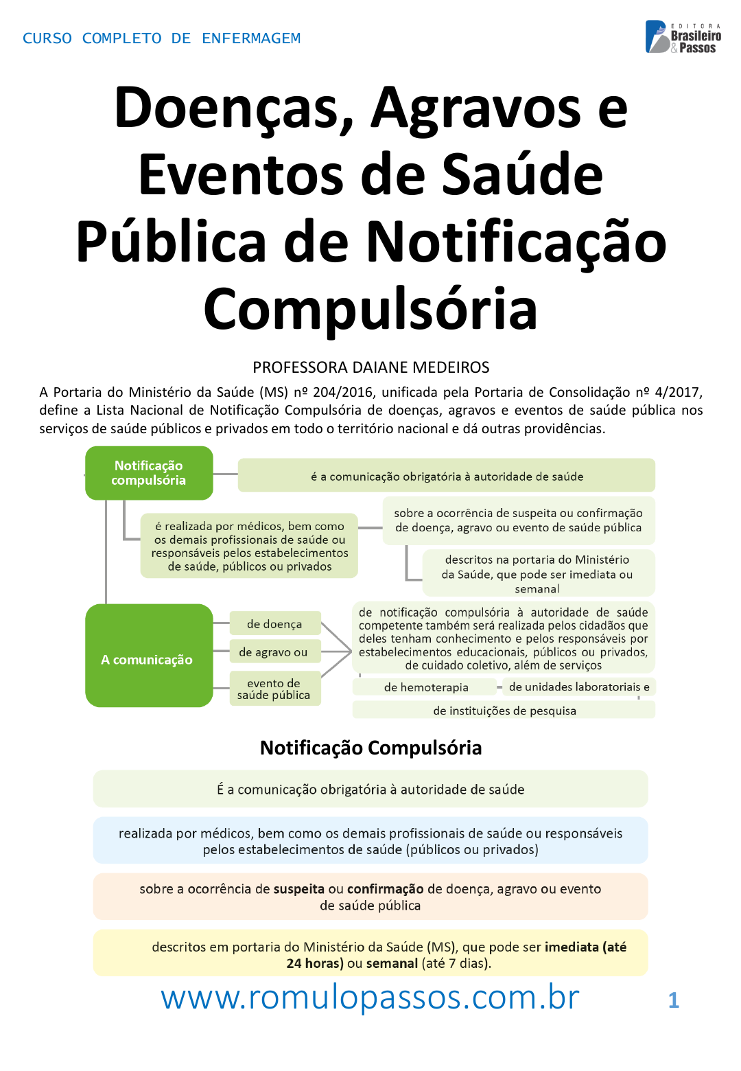 www.romulopassos.com.br CURSO COMPLETO DE ENFERMAGEM 1 Doenças, Agravos e Eventos de Saúde Pública de Notificação Compulsória PROFESSORA DAIANE MEDEIROS A Portaria do Ministério da Saúde (MS) nº 204/2016, unificada pela Portaria de Consolidação nº 4/2017, define a Lista Nacional de Notificação Compulsória de doenças, agravos e eventos de saúde pública nos serviços de saúde públicos e privados em todo o território nacional e dá outras providências. Notificação Compulsória Paulo Lucas Ramos Rodrigues - 62542504385 www.romulopassos.com.br CURSO COMPLETO DE ENFERMAGEM 2 Notificação compulsória negativa Comunicação semanal realizada pelo responsável pelo estabelecimento de saúde à autoridade de saúde, informando que, na semana epidemiológica, não foi identificada nenhuma doença, nenhum agravo ou evento de saúde pública constante na Lista de Notificação Compulsória. Vigilância sentinela Modelo de vigilância realizada a partir de estabelecimento de saúde estratégico para a vigilância de morbidade, mortalidade ou agentes etiológicos de interesse para a saúde pública, com participação facultativa, segundo norma técnica específica estabelecida pela SVS/MS. Autoridades de saúde o Ministério da Saúde e as Secretarias de Saúde dos Estados, Distrito Federal e Municípios. O u tr o s C o n ce it o s Agravo qualquer dano à integridade física ou mental do indivíduo, provocado por circunstâncias nocivas. Evento de saúde pública (ESP) situação que pode constituir potencial ameaça à saúde pública. Epizootia doença ou morte de animal ou de grupo de animais que possa apresentar riscos à saúde pública. Paulo Lucas Ramos Rodrigues - 62542504385 www.romulopassos.com.br CURSO COMPLETO DE ENFERMAGEM 3 Conforme disposições do Ministério da Saúde, os parâmetros para inclusão de doenças e de agravos na lista de notificação compulsória devem obedecer aos critérios a seguir (BRASIL, 2009): incluiu a Infecção pelo vírus Linfotrópico de Células T Humanas (HTLV) incluiu a Infecção pelo HTLV em gestante, parturiente ou puérpera e criança exposta ao risco de transmissão vertical do HTLV Portaria MS nº 3.148/2024 notificação semanal Portaria MS nº 2.010/2023 notificação semanal incluiu a Doença falciforme Portaria MS nº 217/2023 notificação imediata SMS Portaria MS nº 3.418/2022 Notificação imediata MS/SES/SMS substituiu o Acidente de trabalho: grave, fatal e em crianças e adolescentes por Acidente de Trabalho incluiu o Monkeypox (varíola dos macacos) Paulo Lucas Ramos Rodrigues - 62542504385 www.romulopassos.com.br CURSO COMPLETO DE ENFERMAGEM 4 Portaria MS nº 420/2022 notificação semanal Portaria MS nº 1.061/2020 notificação semanal incluiu o Sars-CoV-2 no item da Síndrome Respiratória Aguda Grave (SRAG) associada ao coronavírus Portaria MS nº 1.102/2022 incluiu a Covid-19 incluiu a Síndrome congênita associada à infecção pelo vírus Zika notificação imediata MS/SES/SMS incluiu a Doença de Chagas Crônica incluiu a Síndrome Inflamatória Multissistêmica Pediátrica (SIM-P) associada à Covid-19 incluiu a Síndrome Inflamatória Multissistêmica em Adultos (SIM-A) associada à Covid-19 incluiu a Síndrome Gripal suspeita de Covid-19 Vejamos, a seguir, a relação das doenças, dos agravos e dos eventos de notificação compulsória com a indicação de notificação semanal ou imediata estabelecida no anexo 1 do anexo V à Portaria de Consolidação do MS nº 4/2017: Acidente de trabalho com exposição a material biológico; Dengue - Casos; Doença de Chagas Crônica; Doença de Creutzfeldt-Jakob (DCJ); Doença aguda pelo vírus Zika; Esquistossomose; Febre de Chikungunya; Hanseníase; Hepatites virais;N o ti fi ca çã o C o m p u ls ó ri a Se m an al Síndrome congênita associada à infecção pelo vírus Zika; Doença Falciforme; Paulo Lucas Ramos Rodrigues - 62542504385 www.romulopassos.com.br CURSO COMPLETO DE ENFERMAGEM 5 Infecção pelo HIV em gestante, parturiente ou puérpera e Criança exposta ao risco de transmissão vertical do HIV; Intoxicação Exógena (por substâncias químicas, incluindo agrotóxicos, gases tóxicos e metais pesados); Leishmaniose Tegumentar Americana; Leishmaniose Visceral; Infecção pelo Vírus da Imunodeficiência Humana (HIV); Infecção pelo Vírus Linfotrópico de Células T Humanas (HTLV); Infecção pelo HTLV em gestante, parturiente ou puérpera e Criança exposta ao risco de transmissão vertical do HTLV; HIV/AIDS - Infecção pelo Vírus da Imunodeficiência Humana ou Síndrome da Imunodeficiência Adquirida; N o ti fi ca çã o C o m p u ls ó ri a Se m an al Malária na região amazônica; Óbito: a) Infantil b) Materno; Sífilis: a) Adquirida b) Congênita c) Em gestante; Toxoplasmose gestacional e congênita; Tuberculose; Violência doméstica e/ou outras violências. Acidente de trabalho: grave, fatal e em crianças e adolescentes; Acidente por animal peçonhento; Acidente por animal potencialmente transmissor da raiva; Leptospirose; Tétano: a) Acidental b) Neonatal; Violência sexual e tentativa de suicídio. Notificação Compulsória Imediata - SMS Paulo Lucas Ramos Rodrigues - 62542504385 www.romulopassos.com.br CURSO COMPLETO DE ENFERMAGEM 6 Notificação Compulsória Imediata - SMS e SES Coqueluche; Difteria; Doença de Chagas Aguda; Doença Invasiva por "Haemophilus Influenza“; Doença Meningocócica e outras meningites; Doença aguda pelo vírus Zika em gestante; Febre Tifoide; Varicela - caso grave internado ou óbito. Doenças com suspeita de disseminação intencional: a) Antraz pneumônico b) Tularemia c) Varíola; Doenças febris hemorrágicas emergentes/reemergentes: a) Arenavírus b) Ebola c) Marburg d) Lassa e)b Febre purpúrica brasileira; Óbito com suspeita de doença pelo vírus Zika; Evento de Saúde Pública (ESP) que se constitua ameaça à saúde pública; Eventos adversos graves ou óbitos pós vacinação; Febre