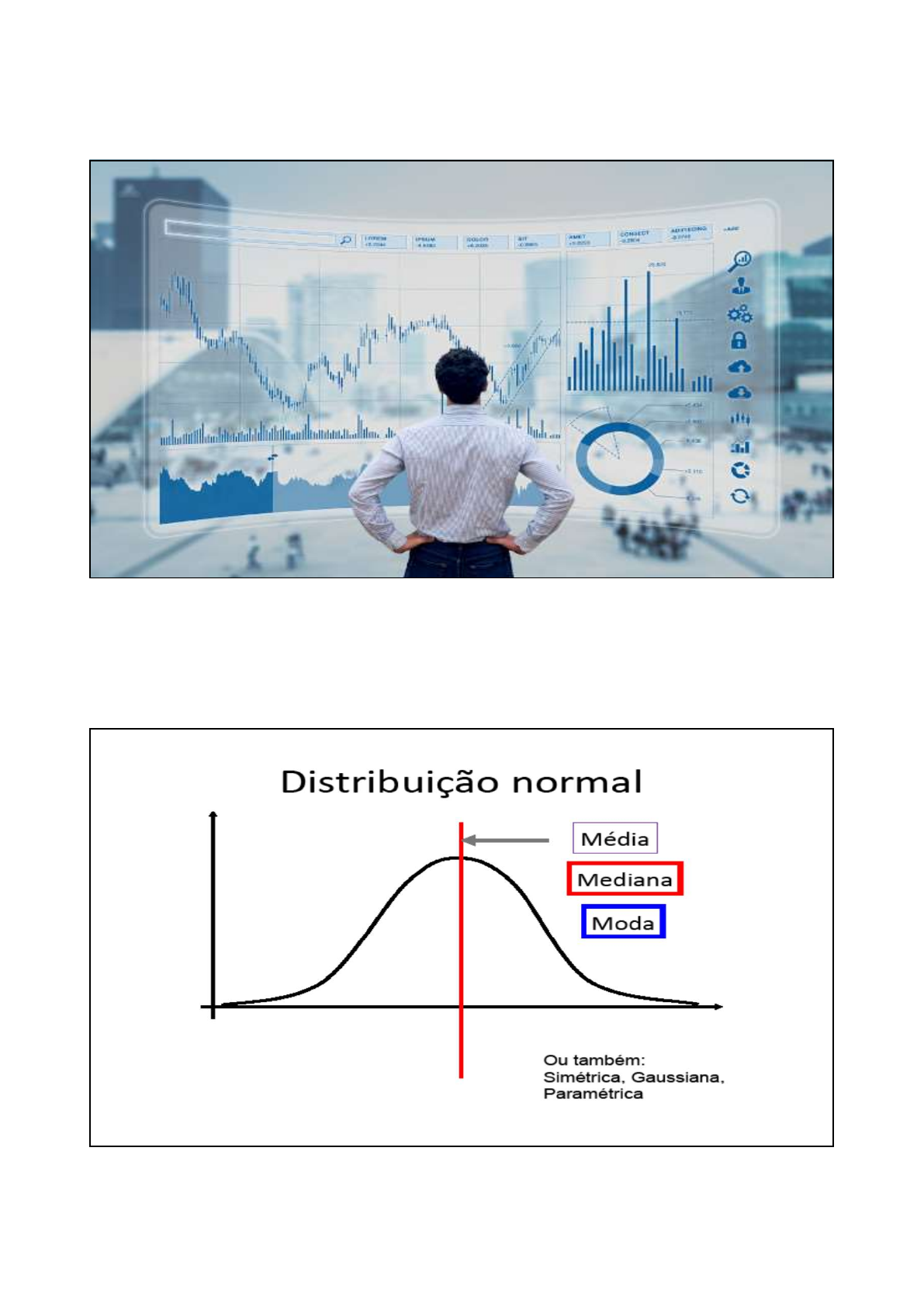 03/04/2024 CURVA NORMAL E MEDIDAS DE POSIÇÃO OBJETIVO GERAL DE APRENDIZAGEM: Compreender os elementos conceituais e matemáticos da distribuição normal e representação de dados. Prof. Renato André @renato_andre_silva www.rassll.com.br Média: soma de todos os números do conjunto dividido pelo número de valores do conjunto. Mediana: é o valor do meio quando o conjunto de dados está ordenado do menor para o maior. Moda: é o número que aparece mais vezes em um conjunto de dados. 1 2 03/04/2024 MEDIDAS DE TENDÊNCIA CENTRAL E DISTRIBUIÇÕES DE FREQUÊNCIAS Distribuição Simétrica Média, mediana e moda Distribuição com Assimetria Negativa moda mediana média Distribuição com Assimetria Positiva média mediana moda Aderência à Distribuição Normal ou de Gauss One-Sample Kolmogorov-Smirnov Test 1488 $2,516.58 $994.59 ,019 ,019 -,010 ,750 ,627 N Mean Std. Deviation Normal Parameters a,b Absolute Positive Negative Most Extreme Differences Kolmogorov-Smirnov Z Asymp. Sig. (2-tailed) Revenue Test distribution is Normal.a. Calculated from data.b. O Teste de Kolmogorov- Smirnov compara um distribuição cumulativa observada (DO) com uma distribuição teórica normal (DN). “Absolute” indica a diferença entre a DO e a DN. Valores elevados na significância (>0,05) indicam que a DO corresponde à DN. 3 4 03/04/2024 DADOS E ESTATÍSTICA VARIÁVEL CATEGÓRICA (qualitativa) NUMÉRICA (quantitativa) Nominal Ordinal Discreta Continua ----------------------------------------------- São representados por porcentagem -------------------------------------------------- Distribuição Normal - média±desvio Padrão Do contrário - mediana (intervalo entre Quartis), etc APLICAÇÃO PRÁTICA ATÉ AGORA • INTRODUÇÃO • MATERIAL E MÉTODOS Análise estatística – Os dados numéricos serão apresentados em média ± desvio padrão ou mediana com intervalo entre quartis quando apropriado e os dados categóricos em porcentagem. • RESULTADOS Foram estudados x pacientes, sendo tantos % do sexo masculino, tantos % hipertensos, etc. 5 6 03/04/2024 • O cálculo da média de variáveis é igual ao somatório dos valores dos dados de cada variável dividido pelo número de eventos. É afetada pela presença de valores discrepantes dentro da amostra MédiaMédia REPRESENTATIVIDADE DA MÉDIA Identificar menores Valores Identificar maiores Valores Calcular Média 7 8 03/04/2024 MédiaMédia • A mediana é a observação que ocupa a posição central, depois que os dados são ordenados em forma crescente ou decrescente. Esta medida de posição não é afetada por valores discrepantes na amostra já que depende do número de elementos da amostra e não dos seus valores MedianaMediana 9 10 03/04/2024 ModaModa • As medidas de posição são, na maioria dos casos, insuficientes para descrever um conjunto de dados, fornecendo uma ideia geral da posição dos valores da amostra, porém, não é possível saber se todos os dados estão concentrados ou dispersos em torno da medida de posição usada. Variabilidade (dispersão)Variabilidade (dispersão) Média Mediana 5,0 Grupos iguais ? 11 12 03/04/2024 • O cálculo da variância é obtido através da soma dos quadrados da diferença entre cada valor e a média aritmética, dividida pela quantidade de elementos observados. Variância (S2)Variância (S2) 13 14 03/04/2024 • O desvio padrão é uma das mais utilizadas medidas de variação de um grupo de dados. A vantagem que apresenta sobre a variância é de permitir uma interpretação direta da variação do conjunto de dados, pois o desvio padrão é expresso na mesma unidade que a variável (Kg, cm, atm...). É representado por “s” e calculado por Desvio PadrãoDesvio Padrão ou 15 16