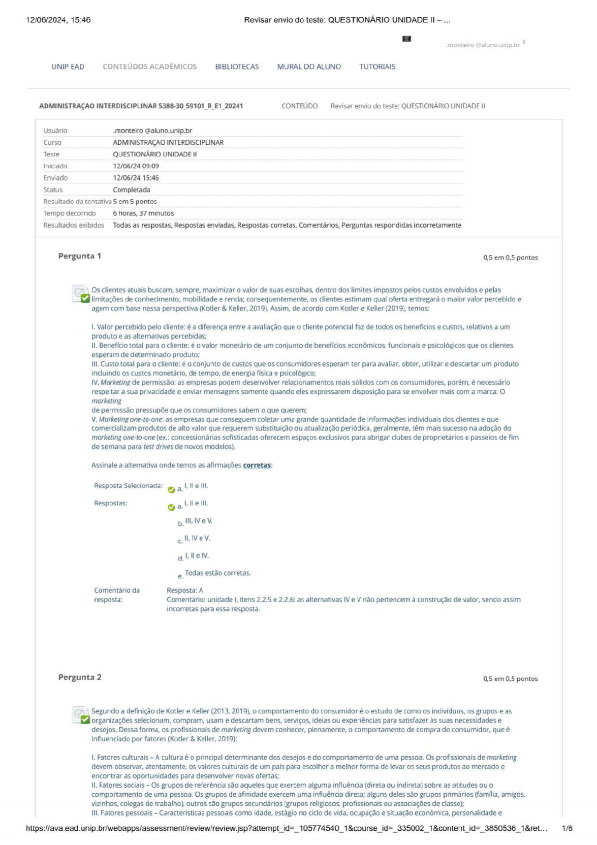 12/06/2024, 15:46 Revisar envio do teste: QUESTIONÁRIO UNIDADE Il - ... - monteiro no.unip.br 3 UNIPEAD CONTEUDOS ACADEMICOS BIBLIOTECAS — MURALDOALUNO TUTORIAIS ADMINISTRACAO INTERDISCIPLINAR 5388-30 59101 R E1 20241 CONTEUDO Revisar envio do teste: QUESTIONARIO UNIDADE Il Ususrio .monteiro @aluno.unip.br Curso 'ADMINISTRACAO INTERDISCIPLINAR Teste QUESTIONARIO UNIDADE |l Iniciado 12/06/24 09:09 Enviado 12/06/24 15:46 Status Completada Resultado da tentativa 5 em 5 pontos Tempo decorrido — 6 horas, 37 minutos Resultados exibidos Todas as respostas, Respostas enviadas, Respostas corretas, Comentarios, Perguntas respondidas incorretamente Pergunta 1 0,5 em 0,5 pontos s clientes atuais buscam, sempre, maximizar o valor de suas escolhas, dentro dos limites impostos pelos custos envolvidos e pelas mitagdes de conhecimento, mobilidade e renda; consequentemente, os clientes estimam qual oferta entregará o maior valor percebido e ‘agem com base nessa perspectiva (Kotler & Keller, 2019). Assim, de acordo com Kotler e Keller (2019), temos: 1. Valor percebido pelo cliente: é a diferenca entre a avaliação que o cliente potencial faz de todos os beneficios e custos, relativos a um produto e as alternativas percebidas; 1. Beneficio total para o cliente: é o valor monetario de um conjunto de beneficios econdmicos, funcionas e psicolgicos que os clientes esperam de determinado produto; M. Custo total para o cliente: é o conjunto de custos que os consumidores esperam ter para avaliar, obter, utilizar e descartar um produto incluindo os custos monetário, de tempo, de energia fisica e psicológico; 1. Marketing de permissão: as empresas podem desenvolver relacionamentos mais sélidos com os consumidores, porém, é necessario respeitar a sua privacidade e enviar mensagens somente quando eles expressarem disposição para se envolver mais com a marca. O marketing de permissão pressupõe que os consumidores sabem o que querem; V. Marketing one-to-one: as empresas que conseguem coletar uma grande quantidade de informações individuais dos clientes e que comercializam produtos de alto valor que requerem substituição ou atualização periódica, geralmente, têm mais sucesso na adoção do marketing one-to-one (ex.: concessionárias sofisticadas oferecem espaços exclusivos para abrigar clubes de proprietários e passeios de fim de semana para test drives de novos modelos). Assinale a alternativa onde temos as afirmações corretas: Resposta Selecionada: g , Il € il Respostas: eem NUA c!hNev qluem «. Todas estão corretas. Comentário da Resposta: À resposta: Comentario: unidade |, itens 2.2.5 e 2.2.6: as alternativas IV e V não pertencem à construção de valor, sendo assim incorretas para essa resposta. Pergunta 2 0,5 em 05 pontos https://ava.ead.unip.br/webapps/assessment/review/review.jsp?attempt | | Segundo a definição de Kotler e Keller (2013, 2019), o comportamento do consumidor é o estudo de como os indivíduos, os grupos e as organizagdes selecionam, compram, usam e descartam bens, servigos, ideias ou experiências para satisfazer às suas necessidades e desejos. Dessa forma, os profissionais de marketing devem conhecer, plenamente, o comportamento de compra do consumidor, que é influenciado por fatores (Kotler & Keller, 2019): 1. Fatores culturais - A cultura é o principal determinante dos desejos e do comportamento de uma pessoa. Os profissionais de marketing devem observar, atentamente, os valores culturais de um país para escolher a melhor forma de levar os seus produtos ao mercado e encontrar as oportunidades para desenvolver novas ofertas; 1. Fatores sociais - Os grupos de referéncia são aqueles que exercem alguma influência (direta ou indireta) sobre as atitudes ou o comportamento de uma pessoa. Os grupos de afinidade exercem uma influência direta; alguns deles são grupos primários (família, amigos, vizinhos, colegas de trabalho), outros são grupos secundários (grupos religiosos, profissionais ou associações de classe); 11l Fatores pessoais - Características pessoais como idade, estagio no ciclo de vida, ocupação e situação econômica, personalidade e : 105774540 1&course id= 335002 1&content i : 3850536 18ret... 16 12/06/2024, 15:46 Revisar envio do teste: QUESTIONÁRIO UNIDADE Il autoimagem, estilo de vida e valores influenciam as decisões do comprador. Os profissionais de marketing precisam conhecer bem tais características, uma vez que elas exercem um impacto direto sobre o comportamento do consumidor; IV. Fatores psicológicos - Estimulos ambientais e de marketing também atingem o consciente do comprador, e um conjunto de fatores psicológicos combinado às determinadas caracteristicas do comprador que levam às decisões de compra. Os principais fatores psicologicos são: motivação, percepção, aprendizagem e memória; V. Fatores de comportamento pós-compra: após a compra, o consumidor ficará atento às informações que apoiem a sua decisão de compra. A satisfação pós-compra do cliente deriva da proximidade entre as suas expectativas e o desempenho percebido do produto. Assinale a alternativa onde temos as afirmações corretas: Resposta Selecionada: g, 1,1l il V. Respostas: &al 111, 1V e V. cLlew. Lilev. o, Todas estão corretas. Comentarioda Resposta: A resposta: Comentário: unidade |, itens: 2.2.7.1,2.2.7.2, 2.2.7.3 e 2.2.7.4: a alternativa V não faz parte dos fatores de comportamento de compra do consumidor e sim do processo decisório de compra. Pergunta 3 0,5 em 0,5 pontos AA função da produção dá à organizagdo uma vantagem baseada em produção e isso é possivel por meio de cinco objetivos de desempenho B básicos. Colocamos a seguir cinco objetivos de desempenho básicos da produção, segundo Slack et al. (2018): |. Objetivo qualidade: significa fazer certo as coisas, mas “fazer certo” depende do tipo de operação que a produção precisa realizar. Fazer certo proporciona uma vantagem em qualidade, e quali