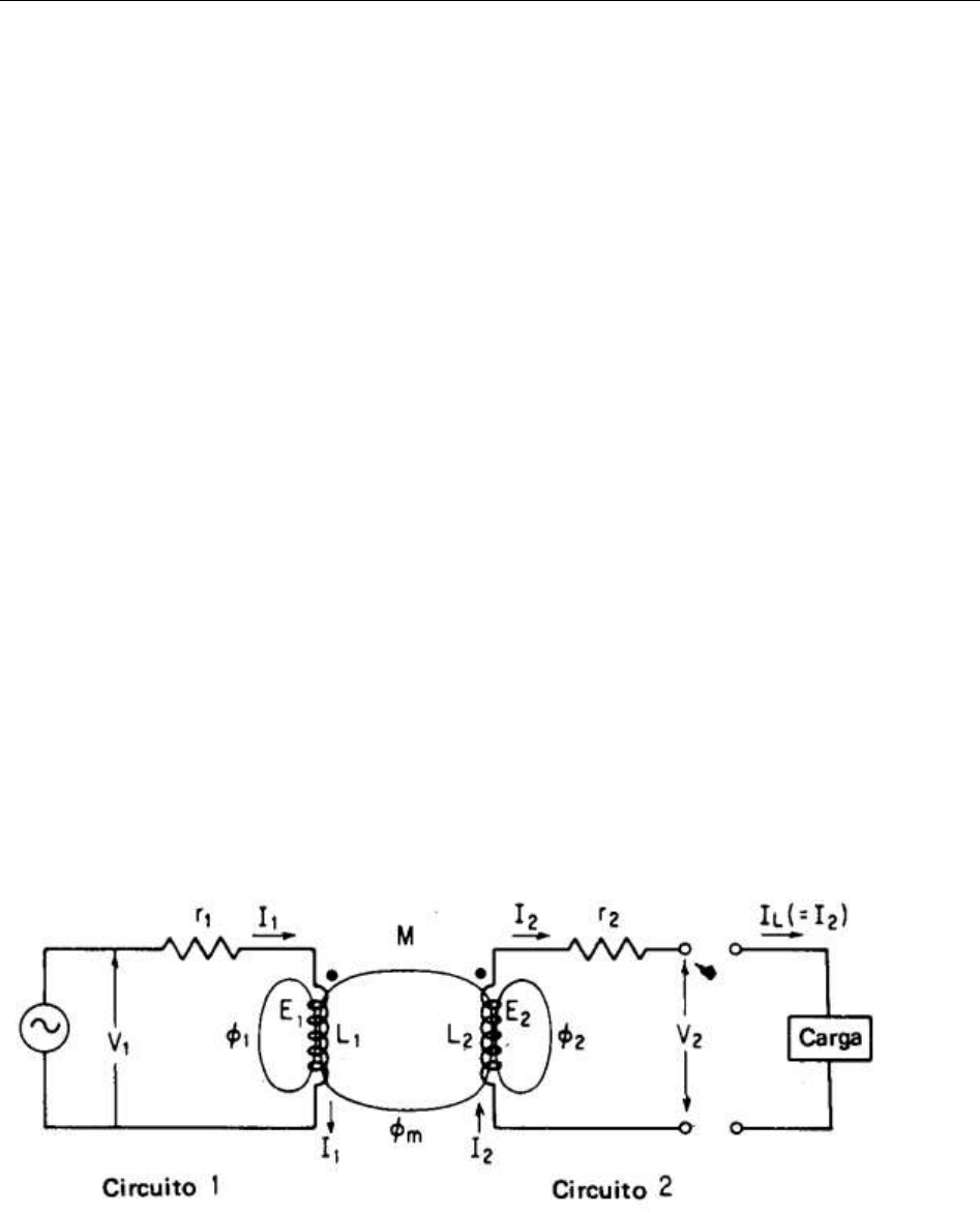 15 MÓDULO II Transformadores REFERÊNCIAS BIBLIOGRÁFICAS FITZGERALD, A. Máquinas Elétricas. São Paulo: Mc-Graw-Hill do Brasil. KOSOW, I. W. Máquinas elétricas e transformadores. São Paulo: Globo, 5ª edição, 1998. OLIVEIRA, J. C. Transformadores, teoria e ensaios. São Paulo: Edgard Blucher Ltda, 1984. http://www.escoladoeletrotecnico.com.br – Curso preparatório para concursos. Aula 2, 2009. ------------------------------------------------------------------------------------------------------------------- 2.1 DEFINIÇÕES FUNDAMENTAIS O transformador opera segundo o princípio da indução mútua entre duas (ou mais) bobinas ou circuito indutivamente acoplados. Um transformador teórico de núcleo a ar, no qual dois circuitos são acoplados por indução magnética, é visto na figura 2.1. Observe que os circuitos não são ligados fisicamente (não há conexão condutiva entre eles). O circuito ligado à fonte de tensão alternativa, V1, é chamado primário (circuito 1). O primário recebe sua energia de uma fonte alternativa. Dependendo do grau de acoplamento magnético entre dois circuitos, Eq. 2.1, esta energia é transferida do circuito 1 ao circuito 2. Se os dois circuitos são frouxamente acoplados, como no caso do transformador a núcleo de ar, mostrado na figura 2.1, somente uma pequena quantidade de energia é transferida doo primário (circuito 1) para o secundário (circuito 2). Se as duas bobinas ou circuitos estão enrolados sobre um núcleo comum de ferro, eles estão fortemente acoplados. Neste caso, quase toda a energia recebida da fonte, pelo primário, é transferida por ação transformadora ao secundário. Figura 2.1 – transformador de núcleo de ar, indutivamente acoplado, com os símbolos definidos. Fonte: KOSOW (1982). 16 As seguintes definições aplicam-se ao transformador da figura 2.1. V1 – é a tensão de suprimento aplicada ao primário, circuito 1, em volts. r1 é a resistência do circuito primário, em ohms. L1 é a indutância do circuito primário, em henries. XL1 é a reatância indutiva do circuito primário, em ohms. Z1 é a impedância do circuito primário, em ohms. I1 é o valor médio quadrático da corrente drenada da fonte pelo primário, em ampères. E1 é a tensão induzida no enrolamento primário (ou circuito). E2 tensão induzida no enrolamento secundário (ou circuito). I2 é o valor médio quadrático da corrente entregue pelo circuito secundário à carga ligada a seus terminais r2 resistência do circuito secundário (excluída a carga), em ohms. V2 é a tensão que aparece nos terminais do enrolamento secundário, em volts. L2 é a indutância do circuito secundário, em henries. XL2 é a reatância indutiva do circuito secundário, em ohms. Z2 é a impedância do circuito secundário (excluída a carga), em ohms. é a componente de dispersão do fluxo que concatena apenas com a bobina 1. é a componente de dispersão do fluxo que concatena apenas com a bobina 2. é o fluxo mútuo, compartilhado por ambos os circuitos, concatenando as bobinas 1 e 2. M indutância mútua entre as duas bobinas (ou circuitos) produzidas pelo fluxo mútuo ( ), em henries. Note-se o significado da convenção dos pontos, usada na figura 2.1 para mostrar a polaridade instantânea positiva da tensão alternativa induzida em ambos os enrolamentos, primário e secundário, como resultado da tensão de transformação. Assim, quando V1 é instantaneamente positivo, uma tensão E1 é induzida no enrolamento primário, de uma polaridade tal eu se opõe a V1, de acordo com a lei de Lenz, como mostra a figura 2.1. Também deve-se notar na figura 2.1 que a corrente I2 está em oposição em relação a corrente I1. Isto também está de acordo com a Lei de Lenz, uma vez que I1 produz , I2 deve circular numa direção tal que se oponha a I1, e (ao mesmo tempo) que esteja conforme a polaridade instantânea E2, como se vê na figura 2.1. A polaridade instantânea de E2 e I2 estabelece a polaridade instantânea de V2 (terminal positivo) e a direção da corrente na carga. O coeficiente de acoplamento, k, entre duas bobinas, é a relação do fluxo mútuo para o fluxo total, definido como: (2.1) 17 Onde todos os termos foram definidos. Se as duas bobinas estão frouxamente acopladas, como no transformador de núcleo de ar, da figura 2.1, termos e são pequenos em comparação a . Como consequência, os termos e M são pequenos em comparação . A substituição na eq. 2.1 leva um valor pequeno do coeficiente de acoplamento k. Isto por sua vez, leva a um valor pequeno de E2 e V2 (em comparação a E1 e V1). Para qualquer carga dada, assim, um pequeno valor de V1 leva um pequeno valor da corrente de carga I2. Estabelece-se simplesmente, então, que para o acoplamento frouxo, a potência transferida ao circuito secundário, E2.I2, é relativamente pequena. Transformadores que têm acoplamento frouxo são usados principalmente em comunicação em alta frequência e em circuitos eletrônicos. Praticamente, todos os transformadores usados em aplicações relativas a máquinas e potência, entretanto, são transformadores de núcleo de ferro, fortemente acoplados. Se as bobinas ou circuitos são estreitamente acoplados, e os fluxos dispersos são relativamente pequenos em comparação a , a indutância mútua M entre as duas bobinas é grande como o são os termos E2, I2 e V2. Neste caso, a energia transformadora E2.I2.t . Tanto quando possível, o projeto dos transformadores de potência, de núcleo de ferro, tenta fazê-los atingir um coeficiente de acoplamento unitário ( k = 1 ) tal que na eq. 2.1 , como no caso de um transformador ideal. O acoplamento entre os dois circuitos é aumentado se porções de ambas as bobinas são enroladas no mesmo formato e se são colocadas sobre um núcleo magnético de baixa relutância. Tais considerações tendem a reduzir . Mas, mesmo com ótimos projetos, é impossível atingir condições de transformador ideal – um