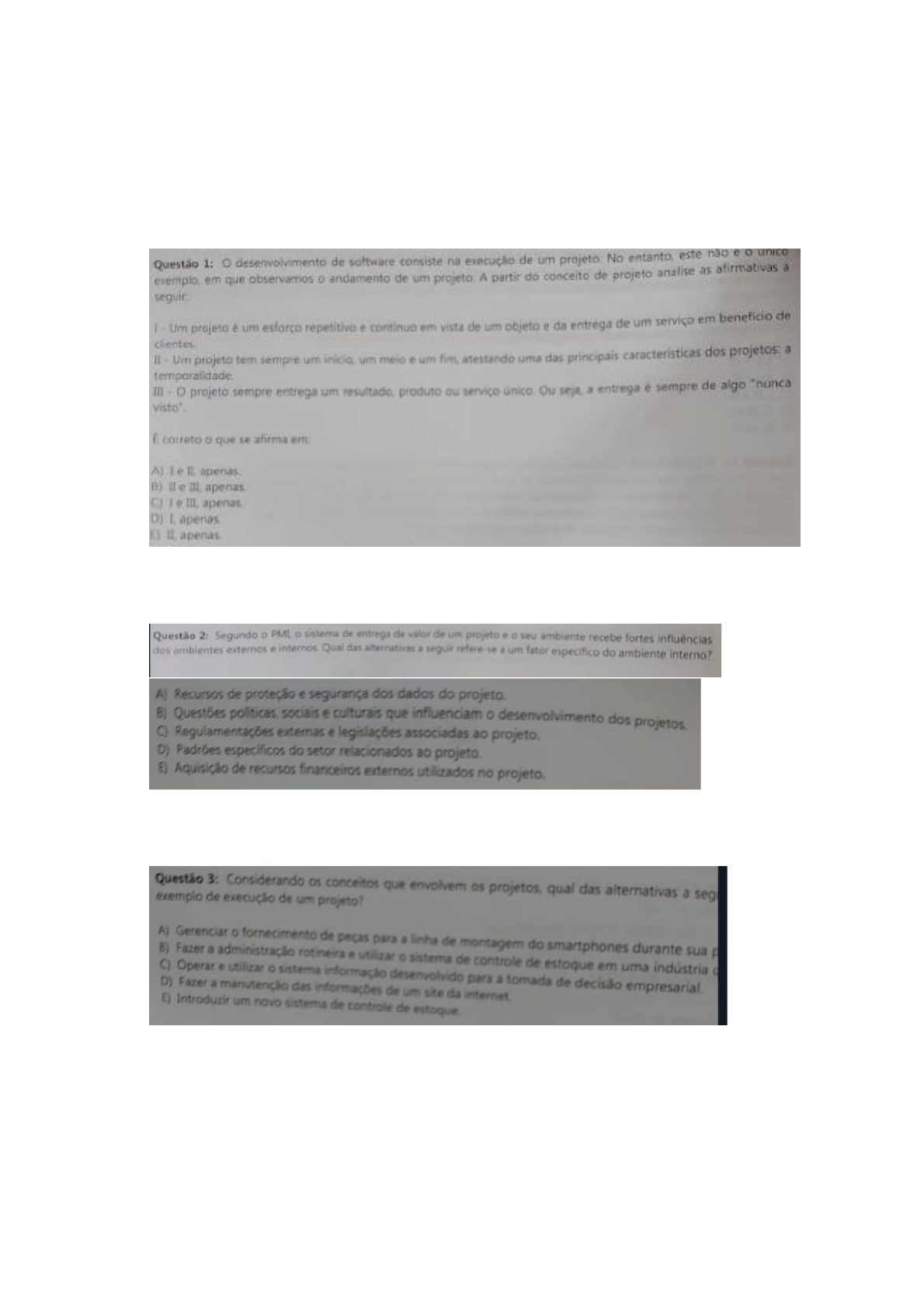 Impresso por Thiago Carvalho Da Silva, E-mail dasilvathiagocarvalho@gmail.com para uso pessoal e privado. Este material pode ser protegido por direitos autorais e não pode ser reproduzido ou repassado para terceiros. 07/10/2022 12:53:33 GERENCIAMENTO DE PROJETOS DE SOFTWARE COMPILADO DE PROVAS 2022 (UNI – P) Questão 01: Resposta: B) II e III, apenas. Questão 02: Resposta: A) Recursos de proteção... Questão 03: Resposta: E) Introduzir um... Impresso por Thiago Carvalho Da Silva, E-mail dasilvathiagocarvalho@gmail.com para uso pessoal e privado. Este material pode ser protegido por direitos autorais e não pode ser reproduzido ou repassado para terceiros. 07/10/2022 12:53:33 Questão 04: Resposta: B) II e III, apenas Questão 05: Resposta: B) II, I e III Questão 06: Resposta: D) Conformidade, Confiabilidade e Cuidado Impresso por Thiago Carvalho Da Silva, E-mail dasilvathiagocarvalho@gmail.com para uso pessoal e privado. Este material pode ser protegido por direitos autorais e não pode ser reproduzido ou repassado para terceiros. 07/10/2022 12:53:33 Questão 07: Resposta: C) I e III, apenas Questão 08: Resposta: B) Está relacionada a integração... Questão 09: Resposta: C) I e III, apenas Impresso por Thiago Carvalho Da Silva, E-mail dasilvathiagocarvalho@gmail.com para uso pessoal e privado. Este material pode ser protegido por direitos autorais e não pode ser reproduzido ou repassado para terceiros. 07/10/2022 12:53:33 Questão 10: Resposta: C) O gerente de projetos... Questão 11: Resposta: C) I e III, apenas Questão 12: Resposta: E) Cadeia de Valor do Serviço Impresso por Thiago Carvalho Da Silva, E-mail dasilvathiagocarvalho@gmail.com para uso pessoal e privado. Este material pode ser protegido por direitos autorais e não pode ser reproduzido ou repassado para terceiros. 07/10/2022 12:53:33 Questão 13: Resposta: E) Modelo de implantação... Questão 14: Resposta: D) Evite adaptações... Questão 15: Resposta: A) Sistema de Valor do Serviço Questão 16: Resposta: D) Matriz SWOT Impresso por Thiago Carvalho Da Silva, E-mail dasilvathiagocarvalho@gmail.com para uso pessoal e privado. Este material pode ser protegido por direitos autorais e não pode ser reproduzido ou repassado para terceiros. 07/10/2022 12:53:33 Questão 17: Resposta: C) I e III, apenas Questão 18: Resposta: A) I, II e III, apenas Questão 19: Resposta: D) Resiliência