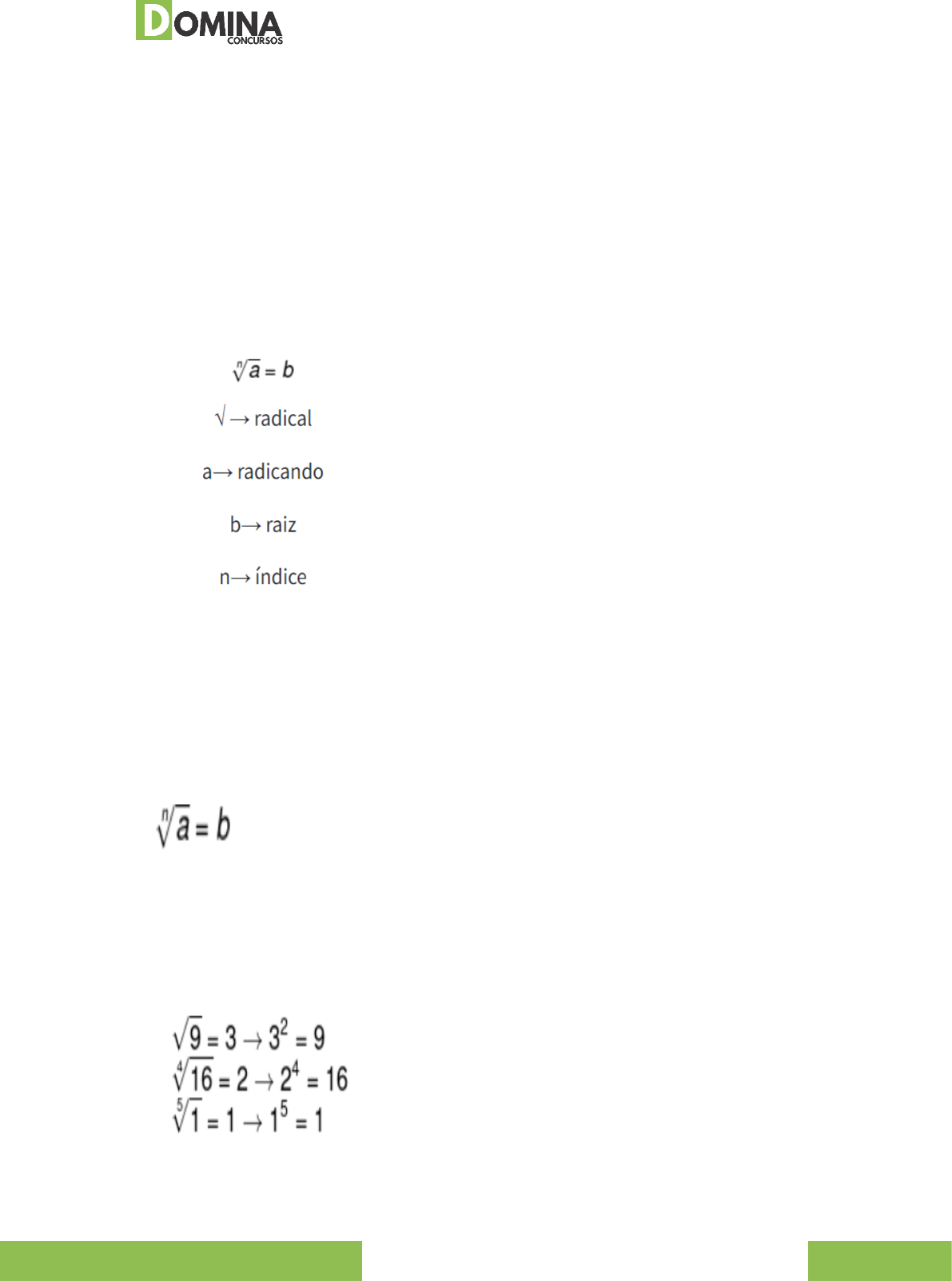 RADICIAÇÃO 1 WWW.DOMINACONCURSOS.COM.BR Radiciação A radiciação é uma operação matemática que possui várias aplicações, dominá-la é importante para resolver-se problemas envolvendo potenciação, já que essas operações são inversas. Calcular a raiz enésima de um número x é encontrar qual número que, elevado a n, é igual a x. A radiciação possui propriedades importantes que servem para facilitar as contas e realizar simplificações de radicais. Para realizar operações com radiciação, é importante o domínio de cada uma das suas propriedades e compreender o significado de cada um dos seus termos. Representação de uma radiciação Para representar a raiz de um número, utilizamos um símbolo conhecido como radical (√ ), a raiz de um número qualquer é representada pela seguinte operação: Observação: quando n = 2, chamamos de raiz quadrada, e, nesse caso, escrever o número 2 no índice torna-se opcional. Radiciação e potenciação Para calcular-se a raiz de um número, é fundamental entender que a radiciação é a operação inversa da potenciação, então dominar potenciação é essencial para calcular-se a raiz de um número. Ao escrever a raiz enésima de a e afirmar que ela é igual a b, ou seja: estamos dizendo que, quando calculamos bn, encontramos o número representado pela letra a. Por- tanto é essencial entender que quando se fala que um número é raiz enésima de um outro número, isso significa que a raiz elevada ao índice é igual ao radicando. Exemplos: Propriedades da radiciação RADICIAÇÃO 2 WWW.DOMINACONCURSOS.COM.BR As propriedades da radiciação são meios para facilitar-se o cálculo de problemas que envolvem tal operação. Existe um total de sete propriedades, e dominar cada uma delas é de grande importância para resolução de problemas sobre o tema. 1ª propriedade A raiz enésima de um número a elevado a n é igual ao próprio número a, ou seja, calculando a raiz de um número cujo o índice da raiz é igual ao expoente do radicando, encontraremos como resposta o próprio radicando. 2ª propriedade A raiz enésima do produto é igual ao produto de duas raízes enésimas. Se o radicando for o produto entre dois números, podemos separar como a multiplicação da raízes enésimas de cada uma de suas parcelas. 3ª propriedade A raiz enésima de uma divisão é igual ao quociente entre duas raízes enésimas. Se o radicando for uma divisão entre dois números, podemos separar como a raiz enésima do dividendo, dividido pela raiz enésima do divisor. 4ª propriedade Podemos multiplicar ou dividir (simplificar) o índice da raiz, desde que a mesma operação seja feita com o expoente do radicando. 5ª propriedade Quando encontramos a raiz de uma raiz, podemos multiplicar seus índices e representar essa operação com um único radical. 6ª propriedade RADICIAÇÃO 3 WWW.DOMINACONCURSOS.COM.BR A potência de uma raiz enésima pode ser reescrita como a raiz enésima do radicando elevada a essa potência. 7ª propriedade A raiz enésima pode ser transformada em uma potência com expoente racional. O índice da raiz cor- responde ao denominador, e o expoente da base corresponde ao numerador: Simplificação de radicais Quando estamos trabalhando com um valor que não possui uma raiz exata, podemos fazer a simplifi- cação desse radical. Para isso, é necessário algum método para decompor o número em fatores pri- mos. Exemplo: Escreva na forma simplificada a raiz quadrada de 360. Vamos realizar a fatoração de 360 utilizando o método das divisões sucessivas. 360|2→ 2 é o menor número primo que divide 360; 180|2→ 2 é o menor número primo que divide 180; 90|2 → 2 é o menor número primo que divide 90; 45|3 → 3 é o menor número primo que divide 45; 15|3 → 3 é o menor número primo que divide 15; 5|5 → 5 é o menor número primo que divide 5. 1| Sendo assim, temos que 360= 2 · 2 · 2 · 3 · 3 · 5. Como o nosso objetivo é simplificar uma raiz quadrada, vamos agrupar esses fatores de 2 em 2, logo, podemos reescrever 360 como: Assim, podemos reescrever a raiz de 360, utilizaremos a primeira propriedade para simplificar a raiz quadrada, o que significa que os termos que estão elevados ao quadrado sairão do radical, e os que não estão permanecem dentro do radical: Operações com radicais Adição e subtração RADICIAÇÃO 4 WWW.DOMINACONCURSOS.COM.BR A adição e a subtração de dois radicais são operações que, muitas vezes, são feitas de forma errada. Acontece que não podemos somar ou subtrair o radical de uma raiz com o radical de outra, ainda que o índice seja o mesmo: Na busca por não cometer esse erro, o que deve ser feito é deixar representada a adição como no primeiro membro da equação. Vale lembrar que se trata de raízes. Realizar a soma ou a subtração de duas raízes e representá-las de forma mais simples só é possível se estivermos falando da mesma raiz, por exemplo: Nesse caso sempre somaremos os coeficientes, ou seja, o número que acompanha a raiz, lembrando que não se pode somar o radicando de cada uma delas. Quando necessário, podemos simplificar as raízes para que elas tenham os mesmos radicandos, e aí sim realizar a operação: Sabemos que: e também podemos reescrever o 40 como: Então teremos: Multiplicação e divisão Para realizar a multiplicação, é necessário que o índice seja o mesmo para todas as raízes. Quando isso ocorre, acabamos recorrendo à 2ª e à 3ª propriedade. Somente nesses casos é possível realizar- se a operação. Exemplo: