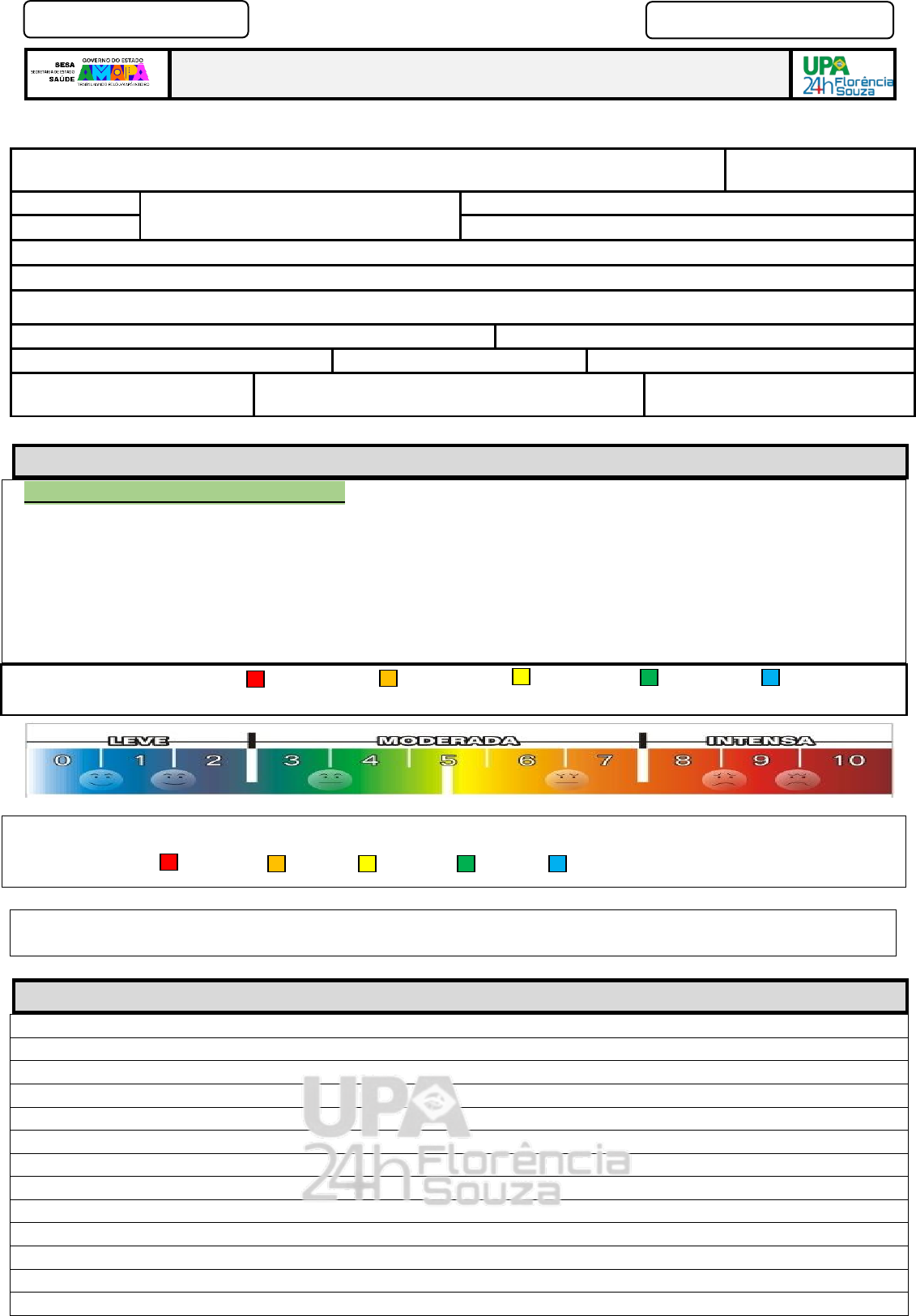 DATA DO ATENDIMENTO: ______/______/______ HORÁRIO DE CHAGADA: _______: _______ NOME: IDADE: SEXO DATA DE NASCIMENTO: ______/______/_______ OCUPAÇÃO: COR TELEFONE: NOME DA MÃE: ENDEREÇO: BAIRRO: MUNICÍPIO: CHEGADA: CASO DE POLÍCIA: ACIDENTE DE TRABALHO: PROCEDÊNCIA CNS: ASS. ATENDENTE: CLASSIFICAÇÃO DE RISCO HORÁRIO DO ATENDIMENTO: ____:____Alergia:____________________________________________ Vacinas: Influenza sim ( ) não ( ) - COVID- 19 sim ( ) não ( ) Doenças preexistentes: ____________________________________________________________ Queixa:__________________________________________________________________________ Data dos sintomas: ____/____/____ Sinais Vitais: P:_____bpm P.A:_________mm/hg FR:_______rpm T:____ºC SpO2: _______ Glicemia Capilar: _______mg/dl Altura:______m Peso:____Kg Escala de Glasgow:______ Classificação de Risco: Vermelha Laranja Amarela Verde Azul 0 minutos 10 minutos 60 minutos 120 minutos 240 minutos Características da Dor:__________________________ Classificador:________________________ Reclassificação: Vermelho Laranja Amarelo Verde Azul Ass. e carimbo:____________ Anamnese/ avaliação diagnóstica Acidente de Trabalho: ( ) Sim ( ) Não _________________________________________________________________________________________ _________________________________________________________________________________________ PRESCRIÇÃO MÉDICA UNIDADE DE PRONTO ATENDIMENTO 24H – FLORÊNCIA SOUZA FICHA DE ATENDIMENTO DE EMERGÊNCIA N° DA PBA: TIPO DE ATENDIMENTO: __________________________________ Assinatura Carimbo Médico Plantonista/UPA/SESA REAVALIAÇÃO ANOTAÇÕES DE ENFERMAGEM __________________________________ Assinatura e carimbo do Enfermeiro Plantonista/UPA/SESA IMPLEMENTAÇÃO DA ASSISTÊNCIA DE ENFERMAGEM EVOLUÇÃO CLÍNICA _________________________________________________________________________________________ _________________________________________________________________________________________ _________________________________________________________________________________________ _________________________________________________________________________________________ _________________________________________________________________________________________ _________________________________________________________________________________________ ___________________________________ Assinatura e carimbo do Médico Plantonista/UPA DESTINO DO USUÁRIO ( ) Alta ( ) Encaminhado para unidade de referência ( ) óbito ( ) Evasão