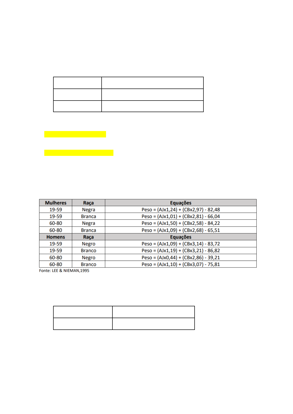 AVALIAÇÃO ANTROPOMÉTRICA - PACIENTES HOSPITALIZADOS ADULTOS E IDOSOS ● Peso Ideal (PI): PI = Altura² (m) x IMC médio Mulheres 21,5 kg/m² Homens 22,5 kg/m² Idosos 24,5 kg/m² ● Peso Ajustado (PA): estimado a partir do peso atual e do ideal. - PA para OBESIDADE PAjust = (PA – PI) x 0,25 + PI (Shills, 1998; Cuppari, 2002). - PA para DESNUTRIÇÃO PAjust = (PI - PA) x 0,25 + PA (Frankenfield et al., 2003). ● Peso Estimado (PEst): utilizado para os casos que são impossíveis de realizar a medida do peso e não há outras formas de determiná-lo. - PEst equação de Rabito et al (2006): Peso (kg) = (0,5759 x circunferência do braço) + (0,5263 x circunferência da cintura) + (1,2452 x circunferência da panturrilha) – (4,8689 x sexo*) -32,9241 Sexo feminino 2 Sexo masculino 1 - Em casos em que o paciente se apresenta edemaciado ou em presença de ascite utiliza-se o peso seco, ou seja, peso descontado de edemas: Classificação de Edemas: Estimativa de peso relativo à edema: Estimativa de peso relativo à ascite: ● Peso estimado para amputados: na impossibilidade de aferição do PA, deve-se utilizar a fórmula de estimativa de peso corporal e subtrair o percentual do segmento amputado de acordo com a Figura 7 (OSTERKAMP et al., 1995). Percentual do segmento corporal amputado: - Havendo registro do PA pré-amputação, pode-se utilizar a seguinte fórmula para determinação do peso pós-amputação: Peso estimado pós-amputação = PA - (PA x % Segmento amputado) ● % Perda de peso ponderal (PP%) é realizado com base no PA e PH e é utilizada para análise de perda de peso de acordo com o tempo, utiliza-se a seguinte fórmula: PP% =[(PH-PA) / PH] x 100 Classificação da perda de peso de acordo com o tempo: ● Porcentagem de adequação de peso: É uma classificação do estado nutricional através da comparação do peso atual com o peso ideal, por intermédio da fórmula: Adequação do peso (%) = (PA / PI) x 100 Classificação do estado nutricional de acordo com a adequação de peso: ● Estimativa de Estatura/Altura: Estimativa da estatura por meio da altura do joelho para indivíduos do sexo feminino e masculino acima de 19 anos de idade. Mulheres Negras Equações 19 – 60 anos Estatura = 68,10 + (1,86 x AJ) – (0,06 x I) Mais de 60 anos Estatura = 58,72 + (1,96 x AJ) Mulheres Brancas Equações 19 – 60 Anos Estatura = 70,25 + (1,87 x AJ) – (0,06 x I) Mais de 60 anos Estatura = 75,00 + (1,91 x AJ) – (0,07 x I) Homens negros Equações 19 – 60 Anos Estatura = 73,42 + (1,79 x AJ) Mais de 60 anos Estatura = 95,79 + (1,37 x AJ) Homens Brancos Equações 19 – 60 Anos Estatura = 71,85 + (1,88 x AJ) Mais de 60 anos Estatura = 59,01 + (2,08 x AJ) AJ= altura do joelho (cm); I= idade (anos). Fonte: Chumlea et al., 1994 ● Técnicas de aferição: ● IMC: Classificação do IMC para adultos Classificação de IMC para idosos ● Circunferências: - Circunferência do Braço (CB): A circunferência do braço é um bom indicador de reserva muscular. Para medir a circunferência do braço o medidor deve posicionar a fita métrica no ponto médio entre o processo acromial da escápula e o olécrano do braço dominante (preferencialmente) do paciente sem compressão - Adequação do CB(%): Adequação da CB (%) = (CB obtida (cm) / CB percentil 50) x 100 Percentil da circunferência do braço (cm) para homens de 1 a 90,9 anos: Percentil da circunferência do braço (cm) para mulheres de 1 a 90,9 anos: Percentil da circunferência do braço (cm) para homens idosos (≥ 60 anos): Percentil da circunferência do braço (cm) para mulheres idosas (≥ 60 anos): Estado nutricional segundo adequação CB% Estado nutricional segundo classificação da CB em percentis - Circunferência da Panturrilha (CP): Para proceder a mensuração da circunferência da panturrilha o indivíduo deve estar sentado, com os joelhos flexionados a 90°, com o calcanhar apoiado sobre a cama ou cadeira. Com uma fita métrica envolvendo a panturrilha, mover a fita para cima e para baixo até encontrar um perímetro máximo, ou seja, a maior circunferência (WHO, 1995). Uma CP inferior ao ponto de corte indica perda de massa magra, possivelmente associada à sarcopenia. Ponto de corte: 31 cm (Guigoz et al., 1999). Percentil da circunferência da panturrilha (cm) para homens idosos (≥ 60 anos) Percentil da circunferência da panturrilha (cm) para mulheres idosas (≥ 60 anos) Estado nutricional segundo classificação da CP em percentis ● Somatório das 4 dobras – percentual de gordura: Nesta técnica, a composição corpórea é estimada utilizando-se a somatória de 4 dobras cutâneas: bicipital, tricipital, subescapular e supra-ilíaca, segundo a equação de Durnin e Womersley (1974), de acordo com idade e gênero, a seguir. Idade Mulheres Homens 17-19 D = 1,1549 – 0,0678 x log (x1) D = 1,1620 – 0,063 x log (x1) 20-29 D = 1,1599 – 0,0717 x log (x1) D = 1,1631 – 0,0632 x log (x1) 30-39 D = 1,1423 – 0,0632 x log (x1) D = 1,1422 – 0,0544 x log (x1) 40-49 D = 1,1333 – 0,0612 x log (x1) D = 1,1620 – 0,0700 x log (x1) Acima de 50 D = 1,1339 – 0,0643 x log (x1) D = 1,1715 – 0,0779 x log (x1) Sendo: x1 – somatório das 4 dobras cutâneas A partir do valor da densidade corporal (DC), a porcentagem de gordura corpórea total é determinada utilizando a fórmula de Siri (1961): Gordura corpórea (%) = 4,95 - 4,5 x 100 /DC Valores de referência para percentuais de gordura corpórea: Classificação Gordura corpórea (%) Mulheres Homens Risco de doenças e distúrbios associados à desnutrição ≤ 8 ≤ 5 Abaixo da média 9 a 22 6 a 14 Média 23 15 Acima da média 24 a 31 16 a 24 Risco de doenças associadas à obesidade ≥ 32 ≥ 25 Fonte: Lohman et al., 1991 ● Avaliação Bioquímica: Os parâmetros de avaliação laboratorial são importantes auxiliares na identificação precoce de alterações nutricionais, eles não devem, de maneira nenhuma, ser utilizados isolada