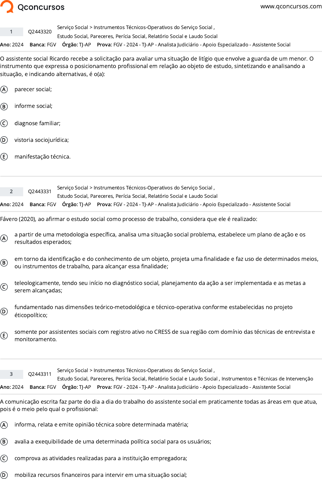 www.qconcursos.com Ano: 2024 Banca: FGV Órgão: TJ-AP O assistente social Ricardo recebe a solicitação para avaliar uma situação de litígio que envolve a guarda de um menor. O instrumento que expressa o posicionamento pro�ssional em relação ao objeto de estudo, sintetizando e analisando a situação, e indicando alternativas, é o(a): A parecer social; B informe social; C diagnose familiar; D vistoria sociojurídica; E manifestação técnica. Ano: 2024 Banca: FGV Órgão: TJ-AP Fávero (2020), ao a�rmar o estudo social como processo de trabalho, considera que ele é realizado: A a partir de uma metodologia especí�ca, analisa uma situação social problema, estabelece um plano de ação e os resultados esperados; B em torno da identi�cação e do conhecimento de um objeto, projeta uma �nalidade e faz uso de determinados meios, ou instrumentos de trabalho, para alcançar essa �nalidade; C teleologicamente, tendo seu início no diagnóstico social, planejamento da ação a ser implementada e as metas a serem alcançadas; D fundamentado nas dimensões teórico-metodológica e técnico-operativa conforme estabelecidas no projeto éticopolítico; E somente por assistentes sociais com registro ativo no CRESS de sua região com domínio das técnicas de entrevista e monitoramento. Ano: 2024 Banca: FGV Órgão: TJ-AP A comunicação escrita faz parte do dia a dia do trabalho do assistente social em praticamente todas as áreas em que atua, pois é o meio pelo qual o pro�ssional: A informa, relata e emite opinião técnica sobre determinada matéria; B avalia a exequibilidade de uma determinada política social para os usuários; C comprova as atividades realizadas para a instituição empregadora; D mobiliza recursos �nanceiros para intervir em uma situação social; 1 Q2443320 >Serviço Social Instrumentos Técnicos-Operativos do Serviço Social , Estudo Social, Pareceres, Perícia Social, Relatório Social e Laudo Social Prova: FGV - 2024 - TJ-AP - Analista Judiciário - Apoio Especializado - Assistente Social 2 Q2443331 >Serviço Social Instrumentos Técnicos-Operativos do Serviço Social , Estudo Social, Pareceres, Perícia Social, Relatório Social e Laudo Social Prova: FGV - 2024 - TJ-AP - Analista Judiciário - Apoio Especializado - Assistente Social 3 Q2443311 >Serviço Social Instrumentos Técnicos-Operativos do Serviço Social , Estudo Social, Pareceres, Perícia Social, Relatório Social e Laudo Social , Instrumentos e Técnicas de Intervenção Prova: FGV - 2024 - TJ-AP - Analista Judiciário - Apoio Especializado - Assistente Social https://www.qconcursos.com/ https://www.qconcursos.com/questoes-de-concursos/bancas/fgv https://www.qconcursos.com/questoes-de-concursos/institutos/tj-ap https://www.qconcursos.com/questoes-de-concursos/bancas/fgv https://www.qconcursos.com/questoes-de-concursos/institutos/tj-ap https://www.qconcursos.com/questoes-de-concursos/bancas/fgv https://www.qconcursos.com/questoes-de-concursos/institutos/tj-ap https://www.qconcursos.com/questoes-de-concursos/questoes/c6386e01-f2 https://www.qconcursos.com/questoes-de-concursos/disciplinas/servico-social-servico-social https://www.qconcursos.com/questoes-de-concursos/disciplinas/servico-social-servico-social/instrumentos-tecnicos-operativos-do-servico-social https://www.qconcursos.com/questoes-de-concursos/disciplinas/servico-social-servico-social/estudo-social-pareceres-pericia-social-relatorio-social-e-laudo-social https://www.qconcursos.com/questoes-de-concursos/provas/fgv-2024-tj-ap-analista-judiciario-apoio-especializado-assistente-social https://www.qconcursos.com/questoes-de-concursos/questoes/c655ceb6-f2 https://www.qconcursos.com/questoes-de-concursos/disciplinas/servico-social-servico-social https://www.qconcursos.com/questoes-de-concursos/disciplinas/servico-social-servico-social/instrumentos-tecnicos-operativos-do-servico-social https://www.qconcursos.com/questoes-de-concursos/disciplinas/servico-social-servico-social/estudo-social-pareceres-pericia-social-relatorio-social-e-laudo-social https://www.qconcursos.com/questoes-de-concursos/provas/fgv-2024-tj-ap-analista-judiciario-apoio-especializado-assistente-social https://www.qconcursos.com/questoes-de-concursos/questoes/c61fb39a-f2 https://www.qconcursos.com/questoes-de-concursos/disciplinas/servico-social-servico-social https://www.qconcursos.com/questoes-de-concursos/disciplinas/servico-social-servico-social/instrumentos-tecnicos-operativos-do-servico-social https://www.qconcursos.com/questoes-de-concursos/disciplinas/servico-social-servico-social/estudo-social-pareceres-pericia-social-relatorio-social-e-laudo-social https://www.qconcursos.com/questoes-de-concursos/disciplinas/servico-social-servico-social/instrumentos-e-tecnicas-de-intervencao https://www.qconcursos.com/questoes-de-concursos/provas/fgv-2024-tj-ap-analista-judiciario-apoio-especializado-assistente-social E torna a comunicação com a che�a e equipe multipro�ssional mais e�caz e ágil. Ano: 2024 Banca: FGV Órgão: TJ-AP Um dos instrumentos mais comumente utilizados pelo assistente social é a visita domiciliar. Na ótica da teoria crítica que ilumina a pro�ssão, esse instrumento tem como �nalidade: A reunir elementos para aferir a verdade sobre o usuário e/ou sua família; B apreender os vários determinantes sociais que fazem parte daquela realidade social; C articular critérios sociais com a instituição a �m de determinar prioridades; D utilizar mais uma atividade vinculada à lógica da razão instrumental; E veri�car e sistematizar as informações prestadas pelos usuários atendidos na instituição. Ano: 2024 Banca: FGV Órgão: TJ-AP No sociojurídico, o instrumento utilizado pelo juiz para obtenção de suporte técnico-cientí�co para resolução de um litígio é o(a): A relatório social; B perícia social; C instrução social; D parecer social; E laudo social. Ano: 2024 Banca: FGV Órgão: TJ-AP O estudo social é largamen
