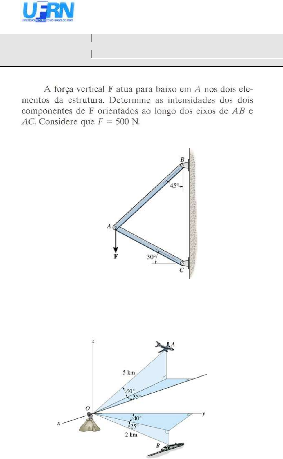 E S C O L A D E C I Ê N C I A S E T E C N O L O G I A L i s t a d e E x e r c í c i o s 4 - V e t o r e s e E q u i l í b r i o DISCIPLINA ECT3307 – Introdução a Mecânica para Engenharia: Estática NOME DO PROFESSOR Prof. Dr. Rodrigo Barros SEMESTRE/ANO 1º SEMESTRE / 2024 DIA / HORÁRIO 2T34 / 3N34 / 4M12 / 5N34 / 6M12 (Resposta: FAB = 448 N; FAC = 366 N) 2. Em um dado instante, a posição de um avião passando pelo ponto A e a de um trem passando no ponto B são medidas em relação à antena do radar em O. Determine a distância d entre os pontos A e B nesse instante. Para resolver o problema, defina um vetor posição orientado de A, para B, e depois determine sua intensidade. (Resposta: d=6,71 km) 1- 3. Determine a intensidade e o ângulo ϴ da força F1 de modo que o ponto material P esteja em equilíbrio. (Resposta: F = 552 N; θ = 12,9°) 4. O cabo preso ao trator no ponto B exerce uma força de 350 lb sobre a estrutura. Expresse essa força como um vetor cartesiano. (Resposta: FR = 98,1 i + 269 j – 201 k) 5. A torre da figura abaixo é mantida reta pelos três cabos. Se a força em cada cabo que atua sobre a torre for aquela indicada na figura, determine a intensidade e os ângulos diretores coordenados α, e da força resultante. Considere que x=20m e y=15m. (Resposta: FR = 1501,6 N; α = 77,6o; β = 90,6 o; γ = 168o)