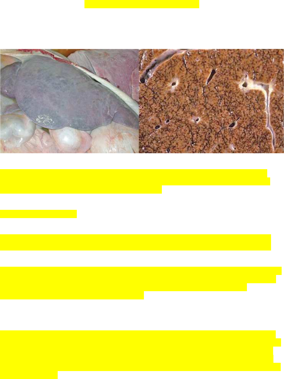 Universidade Estadual de Santa Cruz Patologia especial Veterinária Medicina Veterinária Josiane Leão Oliveira Estudo Dirigido – Figado e Vias Biliares 1) As imagens abaixo foram obtidas durante a necropsia de um bovino Avalie-as atentamente e responda: a) Faça a descrição macroscópica da lesão hepática. Coloração pálida com bordas abauladas, aumentado de volume, ao corte terá o aspecto em noz moscada: áreas centro-lobulares necróticas com coloração escura e áreas periféricas amareladas devido a degeneração (fígado com evidenciação lobular). b) Dê o diagnóstico morfológico da lesão hepática. Hiperemia passiva crônica. c) Qual a principal causa da alteração hepática? Insuficiência cardíaca congestiva do lado direito que leva congestão generalizada (fígado). Obs: pode ter outras causas como trombose ou embolia na veia hepática causando um padrão similar. d) Explique como ocorre essa alteração. Devido a congestão, ocorre primeiro degeneração devido o sangue pobre em oxigenio e se perpetua para necrose e fibrose dos hepatocitos centro-lobulares (pois estão próximos as velas congestas) e posteriormente essa área é invadida por sangue, enquanto as células da periferia sofrem degeneração por conta do sangue ainda oxigenado. 2) Por que ocorre ascite (hidroperitôneo) nos casos de insuficiência hepática? Por que essa manifestação de edema é mais frequente em animais com hepatopatias crônicas? A insuficiencia hepática gera uma hipoalbunemia o que diminui a pressão oncotica favorecendo a saída de líquido. Além disso, uma doença hepática crônica gera fibrose extensa o qual vai aumentar a resistência ao fluxo sanguíneo (aumento da pressão vascular hepática- hipertensão portal), esse aumento da pressão hidrostática favorece a saída de líquido. O próprio hidroperitoneo favorece a saída de proteínas para o intersticio. A fibrose presente na hepatopatia crônica justifica a ocorrência frequente do edema. 3) Plantas do gênero Senecio e Crotalaria possuem como princípio ativo alcaloides pirrolizidínicos, que são hepatotóxicos e produzem uma lesão crônica de forma irreversível, caracterizada por inibição da mitose. Os hepatócitos não se dividem, mas continuam sintetizando DNA no núcleo e aumentando seu tamanho (megalócitos). Posteriormente, essas células vão morrendo e, em consequência, ocorre fibroplasia e hiperplasia das células dos ductos e canalículos biliares. Considerando essas informações, cite e explique a gênese de três sinais clínicos ou lesões comumente observados em bovinos intoxicados cronicamente por essas plantas? Ictericia (pois a disfunção hepática grave compromete a eliminação da bilirrubina), ascite, colesterase, encefalopatia hepatica (pelo comprometimento do ciclo da ureia), fotossensibilização e fotodermatite, sindrome hepato-cutânea, tudo o que resulta de uma disfunção hepática crônica. 4) Sobre as patologias do figado, é correto afirmar, exceto: a) Os hepatócitos da região centrolobular sofrem primeiro os danos causados pela hipoxia quando comparados aos hepatócitos periportaises b) Os animais que nascem com shunts portossistêmicos frequentemente apresentam ascite. c) A insuficiência cardiaca congestiva pode causar hipertensão portal por impedimento pós hepatico do fluxo sanguineo portal. d) Microscopicamente, a congestão hepatica cronica é caracterizada por perda de hepatocitos, congestão, hemorragia e fibrose na area centrolobular, esteatose nos hepatocitos periportais. e) Em casos de necropsia, nem sempre as linhas de ruptura hepatica estao associadas a hemorragia. 5) Qual mecanismo de formação da lipidose de tensão observada comumente no figado de bovinos e equinos como um achado de necropsia sem importancia clinica: a) Fibrose hepática que aumenta a tensão sobre o figado b) Animais excessivamente tensos devido as pertubações neurologicas c) Tensão sobre células hepáticas produzida por congestão passiva cronica resultante de insuficiência cardíaca direta d) Infarto hepático pela hipoxia e) Tensão sobre células hepáticas produzida pela força mecânica dos ligamentos que sustentam o figado e consequentemente hipoxia celular que compromete o metabolismo da gordura que vai se acumulando nos hepatócitos 6) São causas de abcessos hepáticos em bovinos, exceto: a) Migração de larvas de parasitas como a fascíola hepática; b) Extensão de onfaloflebites. c) Sequelas de ruminite por acidose hepatica d) Complicação de reticulite e reticuloperitonite traumática e) Disseminação hematogênica de êmbolos portais ou da circulação arterial 7) Sobre a insuficiência hepática é correto afirmar, exceto: a) Ocorre nos casos de lesão difusas, agudas ou cronicas, quando ha comprometimento de 75% do parênquima hepático. b) A hipoalbuminemia usualmente reflete deonça hepatica cronica grave devido a meia vida relativamente longa da albumina plasmatica e ao tempo necessario para o desenvolvimento da hipertensão portal c) A fotossensibilização secundaria ou hepatogena ocorre em herbívoros com disfunção hepática ou obstrução biliar que comprometem a eliminação de filoeritrina pela bile d) Diáteses hemorrágicas são mais frequentes nos casos de lesões hepáticas cronicas devido principalmente a redução da síntese de fatores de coagulação pelo órgão afetado e) Os sinais clínicos de encefalopatia hepática ou coma hepático são devidos principalmente aos efeitos da amônia sobre o sistema nervoso central. 8)) Sobre a inflamação da cavidade oral nos animais domésticos é correto afirmar, exceto: a) A febre aftosa, diarreia bovina a vírus e febre catarral maligna são causadas por vírus e podem cursar com estomatite vesicular ou estomatites erosiva e ulcerativa b) A estomatite catarral é caracterizada por hiperemia, edema e hiperplasia dos tecidos linfoides do palato e faringe e por formação de uma membrana ou placa cast