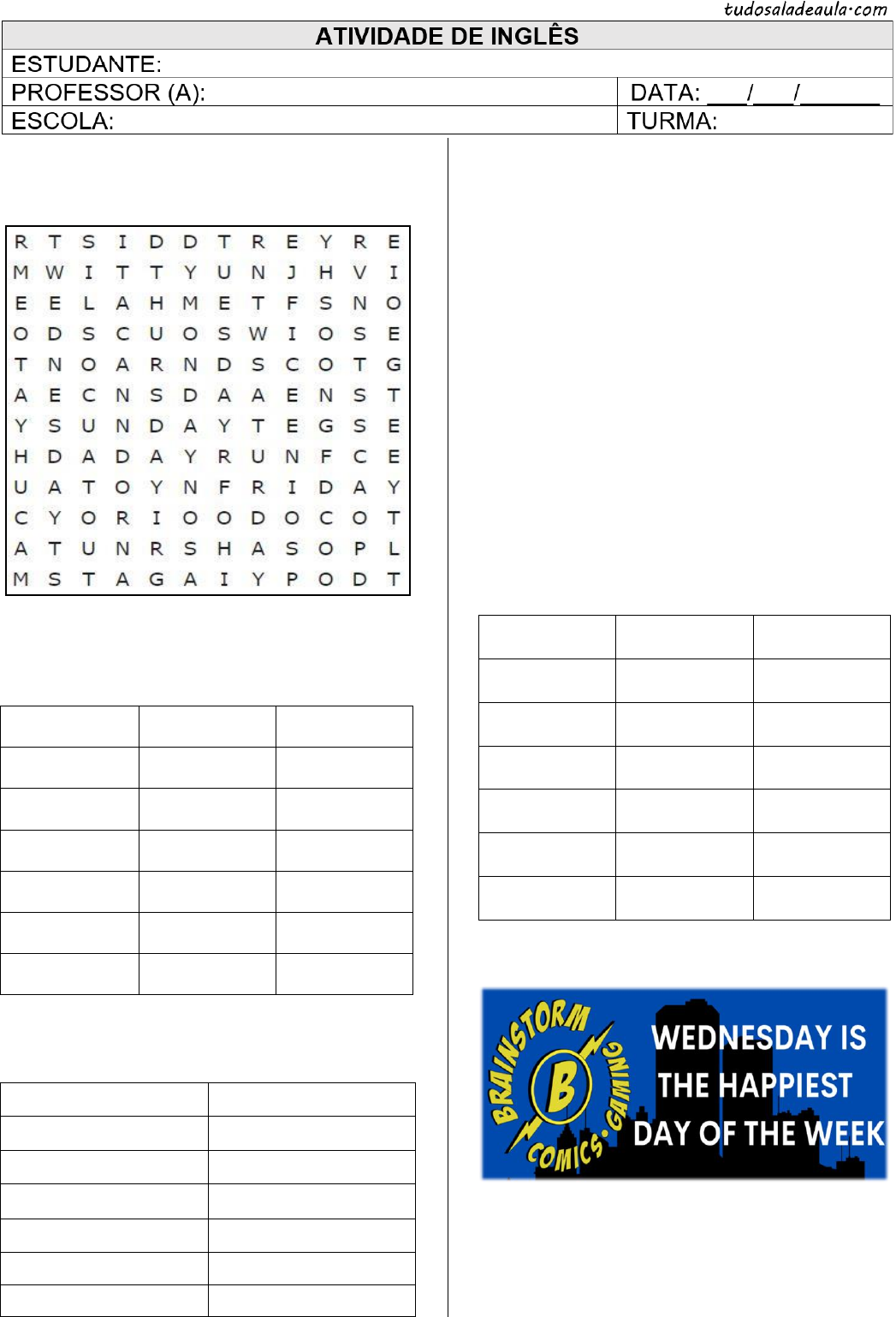 1. Encontre no caça-palavras os 7 dias da semana em inglês. 2. Preencha a tabela com os dias da semana em inglês para assegurar a correta sequência horizontal. FRIDAY TUESDAY SATURDAY THURSDAY MONDAY WEDNESDAY SUNDAY 3. A partir dos dias da semana fornecidos, escreva a tradução em inglês. SEXTA-FEIRA SÁBADO SEGUNDA-FEIRA QUARTA-FEIRA TERÇA-FEIRA QUINTA-FEIRA DOMINGO 4. Considerando que o domingo seja o 1° dia da semana, organize em ordem os nomes dos dias da semana em inglês. 1° _____________________________________ 2° _____________________________________ 3° _____________________________________ 4° _____________________________________ 5° _____________________________________ 6° _____________________________________ 7° _____________________________________ 5. Descubra o dia da semana em inglês e em seguida, escreva a tradução. YIDFAR YNSDUA YEADSWNH ADMONY URSDAHYT DAYESTU DAYSATUR. 6. Analise a imagem e responda: A frase presente na imagem reflete a concepção do dia da semana considerado o mais feliz. Em relação a esse dia, assinale a opção correta. a) Sexta-Feira b) Sábado c) Terça-feira d) Quarta-feira. AVALIAÇAO DE MUNICIPAL DE ENSINO F. EDJAKSON Nº CLETO 7. Na tirinha "Diet week" do Garfield, a semana de dieta é humoristicamente ilustrada através das expressões faciais do famoso gato. Ao longo de seis dias, Garfield exibe um rosto mal humorado, refletindo a típica insatisfação associada às restrições alimentares. No entanto, o ápice ocorre no "Cheat day", onde seu rosto se ilumina de felicidade. Considerando os “Days of the Week”, o “Cheat Day” da tirinha é referente a qual dia da semana? Escreva em inglês. _______________________________________ _______________________________________ 8. Observe a imagem e responda: O humor na mensagem reside na ironia presente na afirmação de que "Tuesday happens every week". A ironia é gerada pela redundância evidente, já que, por definição, todos os dias da semana ocorrem regularmente a cada semana. Analise as frases nas alternativas e marque a que contém a tradução correta da que se encontra na imagem. a) Curiosidade: O Domingo acontece toda semana b) Curiosidade: A Terça-feira acontece toda semana. c) Curiosidade: A Quinta-feira acontece toda semana. d) Curiosidade: A Segunda-feira acontece toda semana. 9. Leia a charadinha e responda em inglês. É um dia da semana, Mas não é um dia qualquer, É o dia do descanso, E é o dia da diversão. Que dia é esse? Escreva em inglês. _______________________________________ _______________________________________ _______________________________________ 10. Leia o enigma e forneça a resposta em inglês. É um dia da semana, Mas não é um dia qualquer, É o dia que marca o fim do fim de semana, E é o dia que muitas pessoas têm que acordar cedo. Que dia é esse? Escreva em inglês. _______________________________________ _______________________________________ _______________________________________