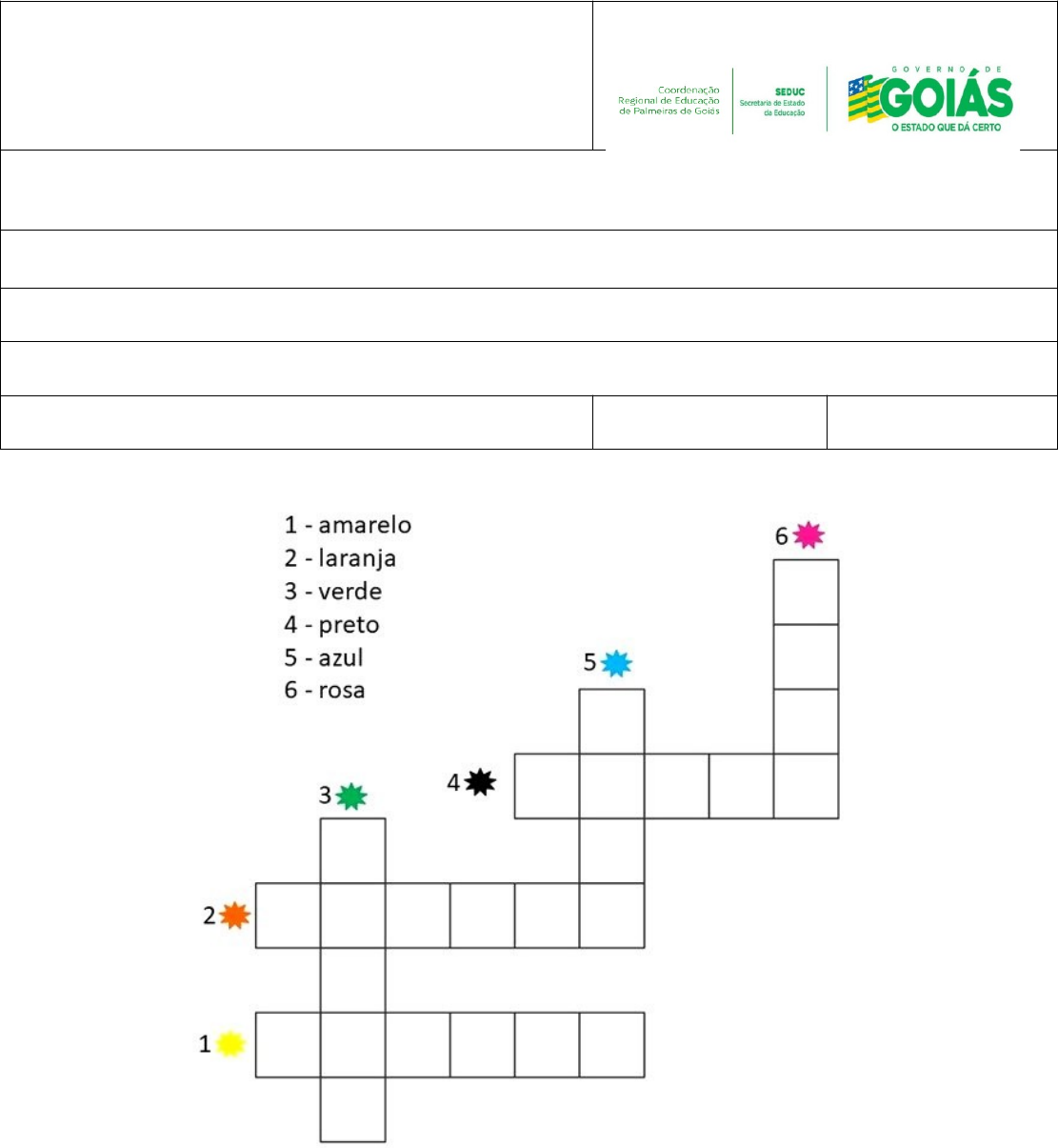 AVALIAÇÃO DE INGLÊS IllI BIMESTRE Unidade Escolar: Colégio Estadual Professor Edmir Póvoa Lemes Professor (a): Estudante: Série: 6 Turma: B Data:_____/_____/2023 Valor: Nota: 1- Complete a cruzadinha com as cores em inglês. 2- Ligue a fruta ao seu nome. 3- Pinte o palhaço conforme as cores indicadas. image1.png image2.jpeg image3.png image4.jpeg