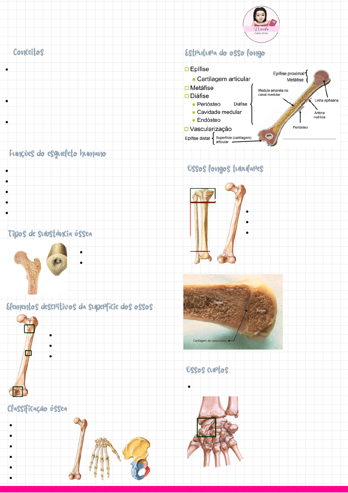 ConceitosConceitosConceitos Sistema esqueléticoSistema esquelético Cartilagem -› forma flexível e semirrigida de tecido conjuntivo (avascular) que forma partes do esqueleto onde é necessário mais flexibilidade. Osso -› órgão formado de tecido rígido (vascular), de forma e número variado e que possui matriz calcificada. Esqueleto -› conj. de ossos e cartilagens que estão interligados para formar o arcabouço do corpo animal Funções do esqueleto humanoFunções do esqueleto humanoFunções do esqueleto humano 1. SUPORTE 2. PROTEÇÃO 3. MOVIMENTO 4. HEMEOSTASIA MINERAL 5. PRODUÇÃO DE CÉLULAS SANGUÍNEAS Tipos de substância ósseaTipos de substância ósseaTipos de substância óssea Compacta Esponjosa Elementos descritivos da superfície dos ossosElementos descritivos da superfície dos ossosElementos descritivos da superfície dos ossos Depressões - fossas, impressões, sulcos ... Saliências - cabeças, cristas, eminências, ... Aberturas - forames, óstios, poros, ... Classificação ósseaClassificação ósseaClassificação óssea Longo Curto Plano Irregular Pneumático Sesamóide Estrutura do osso longoEstrutura do osso longoEstrutura do osso longo Ossos longos tubularesOssos longos tubularesOssos longos tubulares Epífises Diálise - canal medular Cartilagem epifisal - disco cartilaginoso Ossos curtosOssos curtosOssos curtos Equivalência das dimensões Anatomia do esqueleto axialAnatomia do esqueleto axialAnatomia do esqueleto axial Esqueleto craniano Ossículos da orelha Osso hióide Costelas Esterno Ossos da coluna Comprimento e largura equivalentes predominando sobre a espessura. Ossos planos laminar3sOssos planos laminar3sOssos planos laminar3s Ossos irregularesOssos irregularesOssos irregulares Morfologia complexa Sem referências com formas geométricas. Ossos pneumáticosOssos pneumáticosOssos pneumáticos Uma ou mais cavidades Revestimento mucosa Ar Seios - crânio Ossos sesamóidesOssos sesamóidesOssos sesamóides Intratendíneos Peri- articulares Divisão do esqueletoDivisão do esqueletoDivisão do esqueleto Esqueleto axial Esqueleto apendicular - Cinturas escapular ou torácica pélvica ou quadril Ossos craniofaciaisOssos craniofaciaisOssos craniofaciais Osso frontal Osso parietal Osso temporal Osso ociptal Osso esfenóide Osso etmóide PARIETAL Temporal ViscerocrânioViscerocrânioViscerocrânio OCIPTAL ETMÓIDE Osso maxilar Osso palatino Osso zigomático Osso nasal Osso lacrimal Osso vômer Concha nasal inferior Mandíbula MAXILAR PALATINO ZIGOMÁTICO NASAL LACRIMAL VÔMER CONCHAS NASAIS INFERIORES Osso hióideOsso hióideOsso hióide MANDÍBULA Sustenta a língua e músculos do pescoço e faringe Localização - entre a mandíbula e a laringe Forma de ferradura com duas projeções laterais Coluna vertebralColuna vertebralColuna vertebral Principal eixo de suporte do corpo humano 72-75cm Vértebras superpostas e intercaladas por discos intervertebrais Estende-se do crânio (occipital) até a pelve (quadril) Fixação da cabeça, tórax e cintura pélvica CurvaturasCurvaturasCurvaturas Lordose Cifose Anatomia do esqueleto apendicularAnatomia do esqueleto apendicularAnatomia do esqueleto apendicular Membro superior Membro inferior BraçoBraçoBraço articula-se com: Maior osso do membro superior ESCÁPULA RÁDIO ULNA (TRÓCLEA E FÓSSA DO OLÉCRANO AntebraçoAntebraçoAntebraço Ulna Olécrano Cabeça da ulna Processo estilóide da ulna MãoMãoMão Rádio Cabeça Processo estilóide Capo Metacarpo Falanges Membro inferiorMembro inferiorMembro inferior PéPéPé Tarso Metatarso Falanges Maria Fernanda de Souza Lima Oliveira