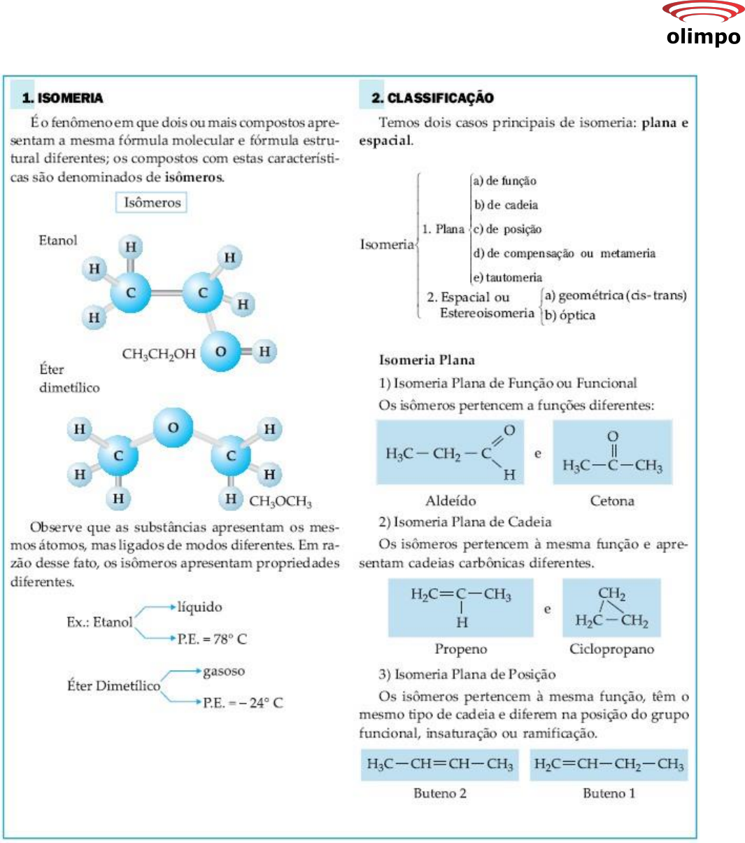 ISOMERIA PLANA EXERCÍCIOS DE APLICAÇÃO 1 (Mackenzie-SP) Relativamente ao álcool secundário, de fórmula molecular C3H7OH, é incorreto afirmar que: a) tem fórmula estrutural H3C - CH2 - CH2 - OH. b) é o propan-2-ol. c) é isômero de posição do propan-1-ol. d) é isômero de função do metóxi-etano. e) não possui isômero de cadeia. 2 (PUC-RS) A substituição de um hidrogênio por uma etila no carbono secundário do butano resulta em um isômero de cadeia do: a) 2-metil-butano. b) 2-metil-pentano. c) 3-metil-pentano. d) pentano. e) hexano. 3 (UFRJ-RJ) Existem cinco compostos aromáticos diferentes, aqui representados pelas letras A, B, C, D e E, com a fórmula molecular C7H8O. a) A, B e C são isômeros de posição. Identifique a função química desses compostos. b) Escreva a fórmula estrutural do composto D, sabendo que seu ponto de ebulição é maior que o de E. 4 (Vunesp-SP) A fórmula simplificada representa um hidrocarboneto saturado. a) Escreva a fórmula estrutural do hidrocarboneto e dê seu nome oficial. b) Escreva a fórmula estrutural e dê o nome de um hidrocarboneto de cadeia linear, isômero do hidrocarboneto dado. 5 (Vunesp-SP) Considerando-se a posição dos grupos -CH3 no anel aromático, o dimetilbenzeno possui: a) 10 isômeros. b) 6 isômeros. c) 5 isômeros. d) 3 isômeros. e) 2 isômeros. 6 (ITA-SP) Considere as afirmações: I. Propanal é um isômero da propanona. II. Etil-metil-éter é um isômero do propan-2-ol. III. Propan-1-ol é um isômero do propan-2-ol. IV. Propilamina é um isômero da trimetilamina. Estão corretas: a) Todas. b) Apenas I, II e III. c) Apenas I e II. d) Apenas II e IV. e) Apenas III e IV. 7 (Mackenzie-SP) O etanoato de etila, que tem odor e sabor de maçã, pode ser obtido pela reação entre ácido etanóico e etanol. A fórmula estrutural plana do isômero de função do etanoato de etila, que apresenta cadeia carbônica ramificada, é: 8 (Univest-SP) A isomerização é um processo no qual as moléculas sofrem um rearranjo estrutural. Ela é utilizada na indústria para melhorar a qualidade dos produtos. Sobre a isomeria, é correto afirmar: (1) O etoxietano é isômero de compensação do metoxi-n-propano. (2) Há apenas dois fenóis de fórmulas estruturais diferentes que possuem fórmula molecular C7H8O. (04) O metilciclopropano é isômero do ciclobutano. (08) Entre as substâncias 1-propanol e metoxietano ocorre isomeria de função. (16) Há apenas quatro éteres alifáticos diferentes com fórmula molecular C4H10O. (32) Entre etanal e etenol ocorre tautomeria. Soma ( ) 9 (Ufes-ES) Associe os pares de compostos dos dois grupos com o tipo de isomeria existente entre eles. A alternativa que apresenta uma associação correta é: a) I-3; II-2; III-4; IV-1 b) I-3; II-2; III-1; IV-4 c) I-2; II-3; III-1; IV-4 d) I-2; II-3; III-4; IV-1 e) I-1; II-2; III-3; IV-4 10 (UFMT-MT) A, B, C têm a mesma fórmula molecular C3H8O. A tem 1 hidrogênio em C secundário e é isômero de posição de B. Tanto A como B são isômeros de função de C. Escreva a fórmula estrutural e os nomes de A, B e C. 11 (UFV-MG) O número de isômeros constitucionais existentes com a fórmula molecular C2H7N é: a) 6 b) 2 c) 3 d) 4 e) 5 12 (Fuvest-SP) Deseja-se saber se três hidrocarbonetos saturados I, II e III são isômeros entre si. Para tal, amostras desses hidrocarbonetos foram analisadas, determinando-se as quantidades de carbono e de hidrogênio presentes em cada uma delas. Os resultados obtidos foram os seguintes: Com base nesses resultados, pode-se afirmar que: a) I não é isômero de II nem de III. b) I é isômero apenas de II. c) I é isômero apenas de III. d) II é isômero apenas de III. e) I é isômero de II e de III. Se desejar, utilize massas molares (g/mol): C = 12; H = 1. 13 (Vunesp-SP) Para dois hidrocarbonetos isômeros, de fórmula molecular C4H6, escreva: a) as fórmulas estruturais. b) os nomes oficiais. 14 (FEI-SP) Identifique a alternativa em que os compostos não são isômeros: a) but-1-eno e ciclobutano. b) propan-1-ol e propan-2-ol. c) propanal e propanona. d) but-1-eno e but-2-eno. e) propano e propeno. 15 (Vunesp-SP) Têm a mesma fórmula molecular C5H10: a) n-pentano e metilciclobutano. b) pent-1-eno e ciclopentano. c) pent-2-ino e ciclopenteno. d) 2-metilbutano e dimetilciclopropano. e ) 2,2-dimetilpropano e etilciclopropano. 16 (Unipa-MG) O número de éteres acíclicos diferentes, possíveis para a fórmula C4H10O, está corretamente representado pela opção: a) 1 b) 2 c) 3 d) 4 e) 5 17 (UFPI-PI) As fórmulas representam substâncias que diferem quanto às: a) massas moleculares. b) composições centesimais. c) cadeias carbônicas. d) fórmulas moleculares. e) propriedades físicas. 18 (UCS-RS) Isômeros são substâncias que possuem a mesma fórmula molecular e que diferem entre si pelo menos em uma propriedade devido à forma diversa de distribuição dos átomos nas moléculas. Os compostos que apresentam isômeros são: a) etano e metano. b) ciclopropano e etano. c) but-2-eno e ciclobutano. d) propano e ciclopropano. e) metano e propanona. 19 (Mackenzie-SP) As fragrâncias características dos perfumes podem ser obtidas a partir de fontes naturais, como óleos essenciais extraídos de plantas, flores e animais ou por processos sintéticos. Dos quatro componentes de óleos essenciais, cujas fórmulas estão acima, é correto afirmar que: a) as substâncias III e IV apresentam entre si, isomeria de função. b) as substâncias II e III são álcoois. c) as quatro substâncias possuem cadeias carbônicas saturadas. d) duas das substâncias são ácidos carboxílicos. e) cada uma das substâncias possui grupo funcional oxigenado diferente do apresentado nas outras substâncias. 20 (Mackenzie-SP) são isômeros planos de: a) cadeia. b) posição. c) função. d) metameria. e) núcleo. 21 (Cesgranrio-RJ) Duas substâncias de odores bem distintos curiosamente têm fórmula molecular idêntica (C6H12O2), o qu