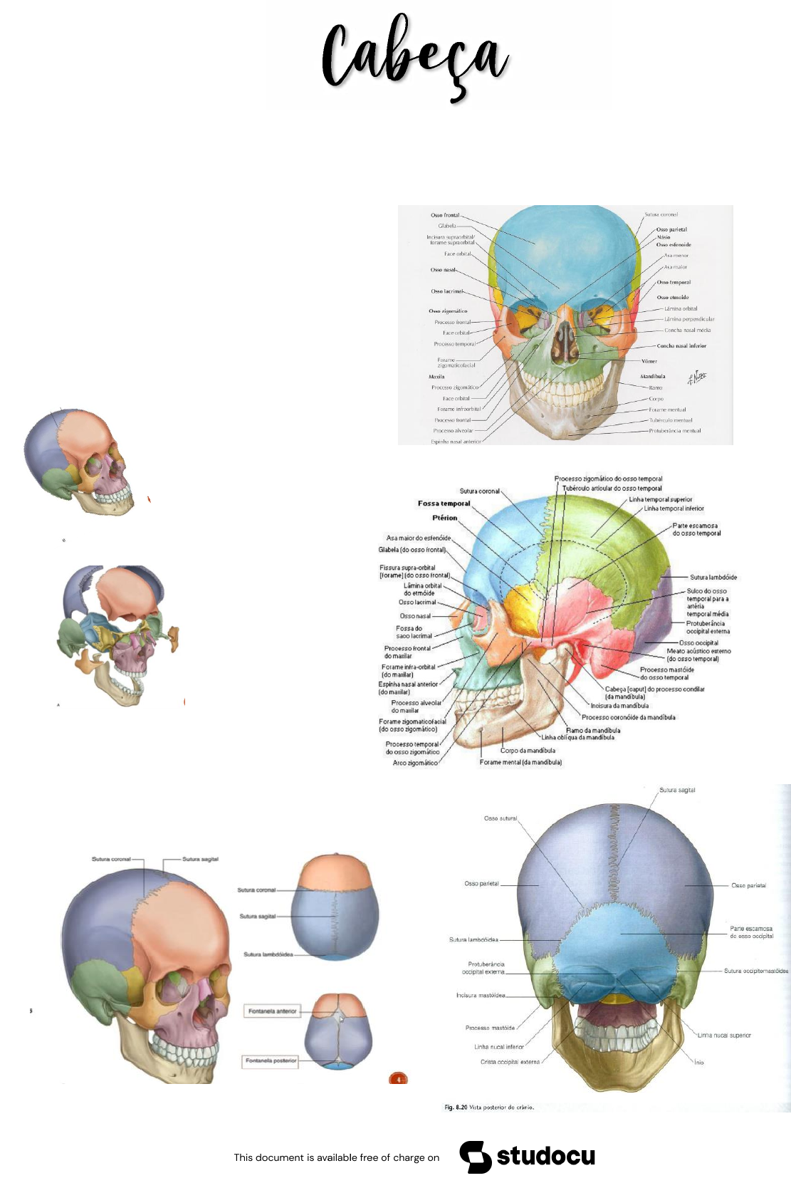 Cranio 22 ossos Divida em neurocranio que protege o encéfalo e viscero que forma faces Proteção Posição de vias respiratórias e digestórias Comunicação (produção de som) Alojamento de órgãos sensórias (meato acústico, orbitas, cavidade nasal) Ossos interligados por suturas Impares: Frontal occipital Vômer Etmoide Esfenoide mandíbula pares: Parientais Temporais Maxilares Zigomáticos Nasais Conchas nasais inferiores Palatinos Lacrimais Divisão Neurocranio Viscerocranio Hiatos membranáceos (não são formados por ossos, facilitando o canal do parto) Fontnelas Vista anterior do crânio Vista lateral do crânio Vista posterior Baixado por Bianca Santos (biancadeoliveirasantos@gmail.com) lOMoARcPSD|43548838 Vista superior Calvaria (osso do crânio) Ossos compactors (tabua) Ossos esponjoso (díploe) Pq ele tem o formato arredondado? Facilta dissipação da força que possa ser posta no crânio durante um traumatismo Vista inferior Dividido em partes: Anterior (dentes e platô duro) Media (Ate a margem anterior forame magno) Posterior (até as linhas nucais superiores Cavidade do crânio: teto Cavidade do crânio: Assoalho Dividido em partes: Fossa anterior: Osso frontal, etmoide e por parte do osso esfenoide Fossa media: Aloja o lobo temporal do encéfalo, ossos parentais, temporais e esfenoide (acidente fossa hipofisaria) Baixado por Bianca Santos (biancadeoliveirasantos@gmail.com) lOMoARcPSD|43548838 Fossa posterior: osso ociptal, Fratura de cranio Sutura metopica comlea Musculos faciais Grupos orbitais Grupos nasais Oral Mosculos: Orbicular da boca Grupo superior zigomático maior e menor musculo levantor do lábio superior e outro levantador da asa do nariz Grupo inferior: Musculo abaixador do ang da boca, abaixador do lábio inferior, musculo mentual Baixado por Bianca Santos (biancadeoliveirasantos@gmail.com) lOMoARcPSD|43548838
