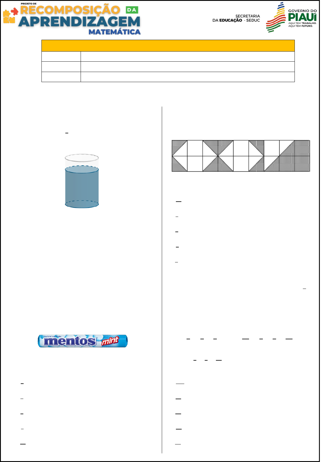 1º MINITESTE - MATEMÁTICA – 3ª SÉRIE DO ENSINO MÉDIO ESCOLA: REGENTE: ESTUDANTE: QUESTÕES PROPOSTAS QUESTÃO 01 Em um recipiente de formato cilindro foi colocado água até 3 4 de sua capacidade, conforme figura a seguir: Sabendo que o recipiente tem capacidade total de 900 𝑚𝑙, então o total de água que falta para atingir a capacidade total do recipiente é de: A) 100 𝑚𝑙 B) 225 𝑚𝑙 C) 300 𝑚𝑙 D) 450 𝑚𝑙 E) 675 𝑚𝑙 QUESTÃO 02 Jean comprou uma Bala de Mentos com 14 unidades e resolveu partilhar com seus amigos Pedro e Paulo. Sabendo que Jean ficou com 8 unidades, então qual foi a fração do Mentos que os amigos Pedro e Paulo ficaram? A) 1 4 B) 3 4 C) 3 7 D) 4 7 E) 3 11 QUESTÃO 03 Dezoito quadrados iguais são construídos e sombreados como mostra a figura. Qual fração da área total é sombreada? A) 7 18 B) 4 9 C) 1 3 D) 5 9 E) 1 2 Questão 04 Uma fração unitária é uma fração da forma 1 𝑛 , onde 𝑛 é um número natural. Uma fração escrita como soma de frações unitárias é denominada fração egípcia. Por exemplo: 𝟐 𝟑 = 𝟏 𝟐 + 𝟏 𝟔 e 𝟓 𝟏𝟏 = 𝟏 𝟑 + 𝟏 𝟗 + 𝟏 𝟗𝟗 A soma 𝟏 𝟑 + 𝟏 𝟖 + 𝟏 𝟔𝟎 é a representação egípcia de qual fração? A) 71 120 B) 3 71 C) 17 60 D) 19 40 E) 17 30 QUESTÃO 05 Dois copos idênticos estão com uma certa quantidade de água, conforme figura a seguir: Copo 1 Copo 2 No copo 1 tem água em 𝟏 𝟒 de sua capacidade. No copo 2 tem água em 𝟒 𝟓 de sua capacidade. Se colocarmos a água do copo 1 no copo 2, então é correto afirmar que A) a água no copo 2 não transbordará, pois corresponderá a 𝟓 𝟗 de sua capacidade. B) a água no copo 2 não transbordará, pois corresponderá a 𝟓 𝟓 de sua capacidade. C) a água no copo 2 não transbordará, pois corresponderá a 𝟒 𝟐𝟎 de sua capacidade. D) a água no copo 2 transbordará, pois corresponderá a 𝟐𝟏 𝟐𝟎 de sua capacidade. E) a água no copo 2 transbordará, pois corresponderá a 𝟏𝟔 𝟓 de sua capacidade. QUESTÃO 06 Pitágoras estabeleceu a seguinte relação entre as sete notas musicais e números racionais: DÓ RÉ MI FÁ SOL LÁ SI DÓ 1 8 9 64 81 3 4 2 3 16 27 128 243 1 2 Para encontrarmos o número 𝟏𝟔 𝟐𝟕 (relativo à nota LÁ), multiplicamos 𝟐 𝟑 (o correspondente da nota SOL) por 𝟖 𝟗 . Assim, para obtermos 𝟑 𝟒 (relativo à nota FÁ), devemos multiplicar 𝟔𝟒 𝟖𝟏 (da nota MI) por: A) 8 9 B) 9 8 C) 243 256 D) 256 243 E) 192 324 QUESTÃO 07 Numa sala do 3º ano, todos gostam de pelo menos uma das duas matérias: Matemática ou Português. Sabe-se que 𝟑 𝟒 dos alunos gostam de Matemática e 𝟓 𝟕 dos alunos gostam de Português. A sala tem 56 alunos. Quantos alunos gostam dessas duas matérias ao mesmo tempo? A) 4 B) 8 C) 13 D) 24 E) 26 QUESTÃO 08 20 colegas de trabalho resolveram fazer uma aposta e premiar aqueles que mais acertassem os resultados dos jogos de um campeonato de futebol. Sabendo que cada pessoa contribuiu com 30 reais e que os prêmios seriam distribuídos da seguinte forma: 1º primeiro colocado: 1/2 do valor arrecadado; 2º primeiro colocado: 1/3 do valor arrecadado; 3º primeiro colocado: recebe a quantia restante. Quanto, respectivamente, cada participante premiado recebeu? A) R$ 350; R$ 150; R$ 100 B) R$ 300; R$ 200; R$ 100 C) R$ 400; R$ 150; R$ 50 D) R$ 250; R$ 200; R$ 150 E) R$ 400; R$ 50; R$ 150 QUESTÃO 09 (ENEM - adaptada) Nas construções prediais são utilizados tubos de diferentes medidas para a instalação da rede de água. Essas medidas são conhecidas pelo seu diâmetro, muitas vezes medido em polegada. Alguns desses tubos, com medidas em polegada, são os tubos de 𝟏 𝟐 , 𝟑 𝟖 e 𝟓 𝟒 . Colocando os valores dessas medidas em ordem crescente, encontramos A) 3 8 , 1 2 , 5 4 B) 3 8 , 5 4 , 1 2 C) 1 2 , 3 8 , 5 4 D) 1 2 , 5 4 , 3 8 E) 5 4 , 1 2 , 3 8 QUESTÃO 10 (ENEM-adaptada) Os gráficos representam a produção de peças em uma indústria e as horas trabalhadas dos funcionários no período de cinco dias. Em cada dia, o gerente de produção aplica uma metodologia diferente de trabalho. Seu objetivo é avaliar a metodologia mais eficiente para utilizá-la como modelo nos próximos períodos. Sabe-se que, neste caso, quanto maior for a fração entre o número de peças produzidas e o número de horas trabalhadas, maior será a eficiência da metodologia. Em qual dia foi aplicada a metodologia mais eficiente? A) 1 B) 2 C) 3 D) 4 E) 5