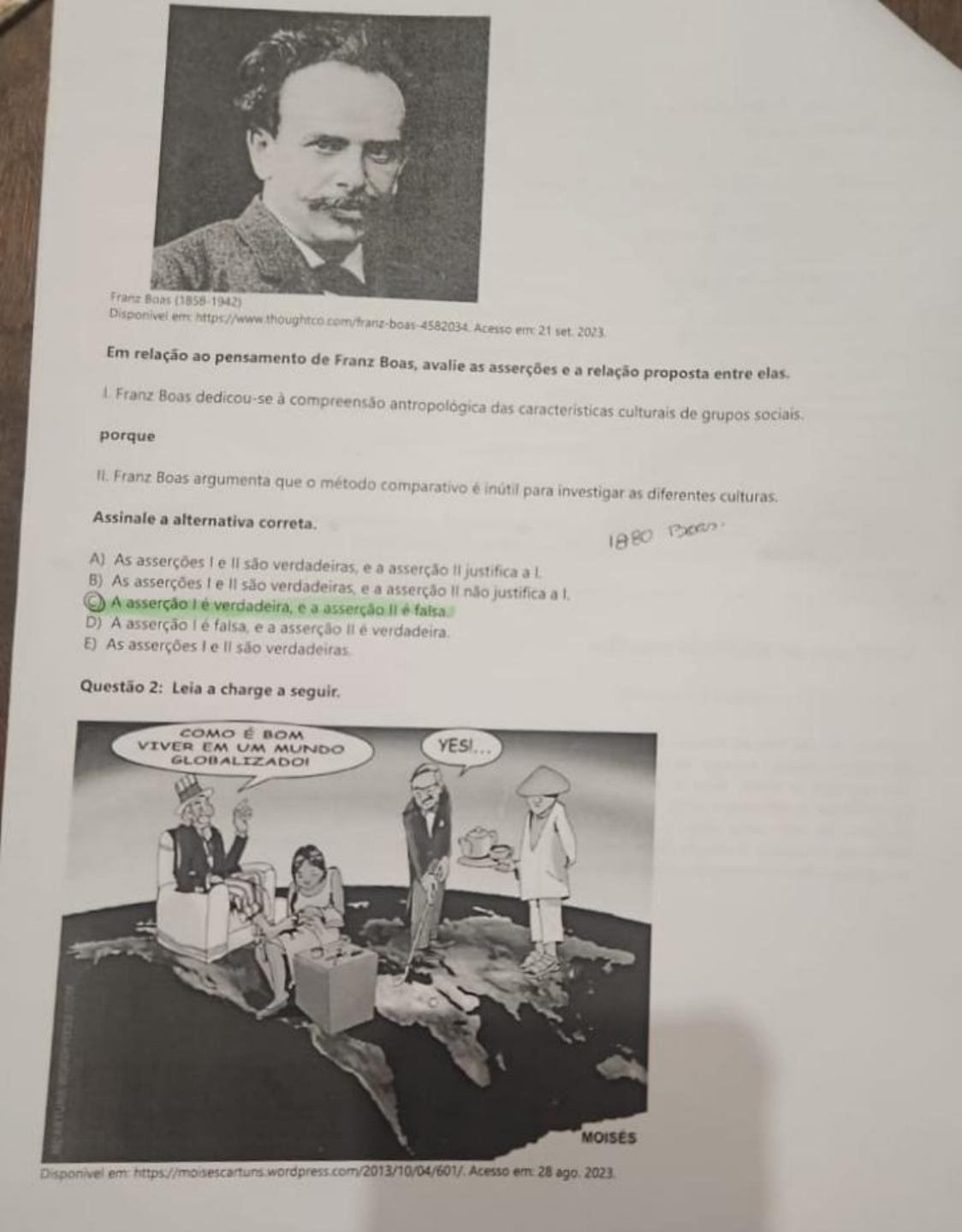 Franz Boas i185 Dispon Uww thoughtco comytrang-boas 4582034.Acesso e21 set 2023 Em relação aopensamento de Franz Boas, avalie asasserções ea relação proposta entre elas. Franz Boasdedicou-se à compreenso antropológica dascaracteristicas culturais degrupossociais porque IL Franz Boasarqumentaqueométodo comparativo é inútil para investigar asdiferentesculturas Assinalea alternativa correta. A) Asasserções Ie ll sãoverdadeiras, e a asserção tl justifica a B) As asserções ell são verdadeiras,ea asserção ll naojustificaal A asserçãotéverdadeira,ea asserção ll éfalsa D) A asserção I éfalsa, e aasserção llé verdadeira. E)Asasserções I ell säo verdadeiras Questäo 2: Leia a charge a seguir. VIvER e BOMNDO GLODALLLADOL YES... MOISES Disponivel em httos/imoisescarturs wordpress.con/2013/10/04/601/. Acesso em 28ago.2023 Com base na leitura e nosseus conhecimentos, avalie as asserç6es e a reaçãoproposta entre elas. Charge fem por objetivo valorizar aspectos Cuturais auese tornaram globais, como o esporte eoca porque L A charge evidencia que a globalização não promove beneficios equivalentes para todos os paises e que as iualdadessonantidasdesigualdades s Assinale a alternativa correta. rcão ll justifica a L Al Asassercöes t eil são proposições verdadeias,eWoustifica a. B)Asasserções l e tt sao proposições verdouee, osicko falsa. QA asserção lé uma proposição verdadeira, e alle A asserção l éuma proposiçãofaisa, ealléuma proposição verdadeira E) As asserçoes I ell são proposições falsas Questäo 3: Leia o trecho a sequir, extraido do livro O auefaro brasil Brasil2.de Roberto DaMatta,ea charge. dilema brasileiro residia nuna tragica "Num Ivro que escrevi Carnavais malandros e herós lancei a tese de que o indiviciduo e situações em que cada um esqueleto nacional feito de leis universais cujo sujeito era c osciace e sedespachava como podia, utilizando para isso o seu sistema de relações pessoais Haveria assim, quai se a todos e relações que evidentemente so olocacão,um verdadeiro combate entre ies qoe e até mesrno equilibrado entre duds podem funcionarpara quem as tem. O resultado é um sistema social unidades socias básicas: o individuo (o sujeito das leis universais que modernizam a sociedade) e a pess0a (0sujeito re os dois, o coração dos brasileiros balança E no das relaçbes sociais, que conduz aopolo tradicional dosse"ahecom quem está falando?" seriam modes o meio dosdois, a malandragem, o "jeitinho" eofamosoee ieiro, ou seia: fazendo uma mediaçãotamoem enfrentar essas contradições e paradoxos de modo ipica as pessoas nela implicadas, de tal sorte que nadase pessoal entre a lei, a situaçãoem que ela deveria apca ela &insensivele nãoégente como nos tooo modifique,apenas ficando a lei un poucodesmorali mundo fica, como se diz, numa boa, e a vida re ao seu normal. DAMATTA RO QUefaz o brosit Brasi Rio de Janeiro: Rocco, 1966 p 64 EU QUERO UM BRASIL SEM CORRUPCAO.. DIRIGINDO COM CELULAR... qnna tauo ROLA UMA Dualetvca AJUDA PRO GUARAIA? Disponlvel err: https/wwwfacebookcormvjornaldiariodepernambuca/posts/1812905248732B69/Nocale=pt BR. Acesso em 22set 2023. Com base na leitura e nos seusconhecimentos, avalie asafirmativas. L.A charge ilustra uma situaçao contemplada pelo texto: a tentativa de o brasileiro livrar-se da aplicação da lei. L.As formasde corrupção edo"jetinho brasileiro devem-seà impunidade, sem qualquer relação com a cultura nem com a formaçãosocial do pais IL.De acordo com o texto, no Brasil, as relações sociais permitem tratamentos diferenciados perante as leis, que deveriam ter a mesma aplicação para qualquer um. LA proibiçãodoincestoindica que.em determinado momentoda nossa história, definiu sea noção oeparentesco LOpensamento mitico, queexerce as funções explicativa, organizativa e compensatóriadeforma iracparteda cultura de um povo L A abordagem de Lévi-Strauss apresenta base eurockntrica porgue hierarquiza as sociedades de acoroo co evolução cientifica e cultural, desvalorizandoopensamento mitico. E correto oque se afirma apenas em: TAL B) IL. Rlell. Questäo 9: Leia o texto a segui. Sao velhas e persistentes as teorias que atribuem capacades especificas inatas a raças ou a outros grupas humanos Muita gente ainda acredita que.os noraies c negros que os alemães temaiantes aue os norte-americancs Sao emnreendetores einteresseitos aueospotuueses sho muito trabalhadores e pouco inteligentes que os japoneses são trahalhadores traicoeiros e eesie os ciganos são nômades por instinto, e. finalmente, que os brasileiros herdaram a preguiçados negros,a imprevidència dos indios e a luxúria dos portugueses. LARAIA R Cutturg um conceito antropolbgico 14 ed, Riode Janeiro: Jorge Zahar. P.18. Com base na leitura e nos seus conhecimentos, avalie as afirmativas. A visão de que fatores biológicos definem comportamentos e características de grupos é adotada pela teoria do determinismo biológico LOinatismode caracteristicas de determinadas raças é um dos principios de politicas e abordagens eug�nicas 1ll, A ideia de que existem raças superiores inspirou, no Brasil, medidas que visavam ao embranquecimento" da população É corretooque seafirma em: Q Lapenas. B) lelt. apenas C lle lL apenas. D) le ll,apenas E) He tt Questäo 10: Leia o trecho a seguir,extraido do romanceNiketche: uma história de poligamnig,da escritora moçambicanaPaulina Chiziane,vencedora do Prêmio Camões. "Mas onde anda meu Tony que não vejo desde sexta-feira? Onde anda esse homem que me deixa os filhos e a casa e nãodá um sinal de vida? Um marido em casa é segurança,e proteção. Na presença de um marido, os ladões se afastan,Oshomens respeitam.As vizinhas não entram de qualquer maneira para pedir sal, açúcar, muito menos para cortar na casaca da outra vizinha. Na presença de um marido, um lar é mais lar; tem conforto eprestigio. Olho para todas elas. Mulheres cansadas, usadas, Mulheres be