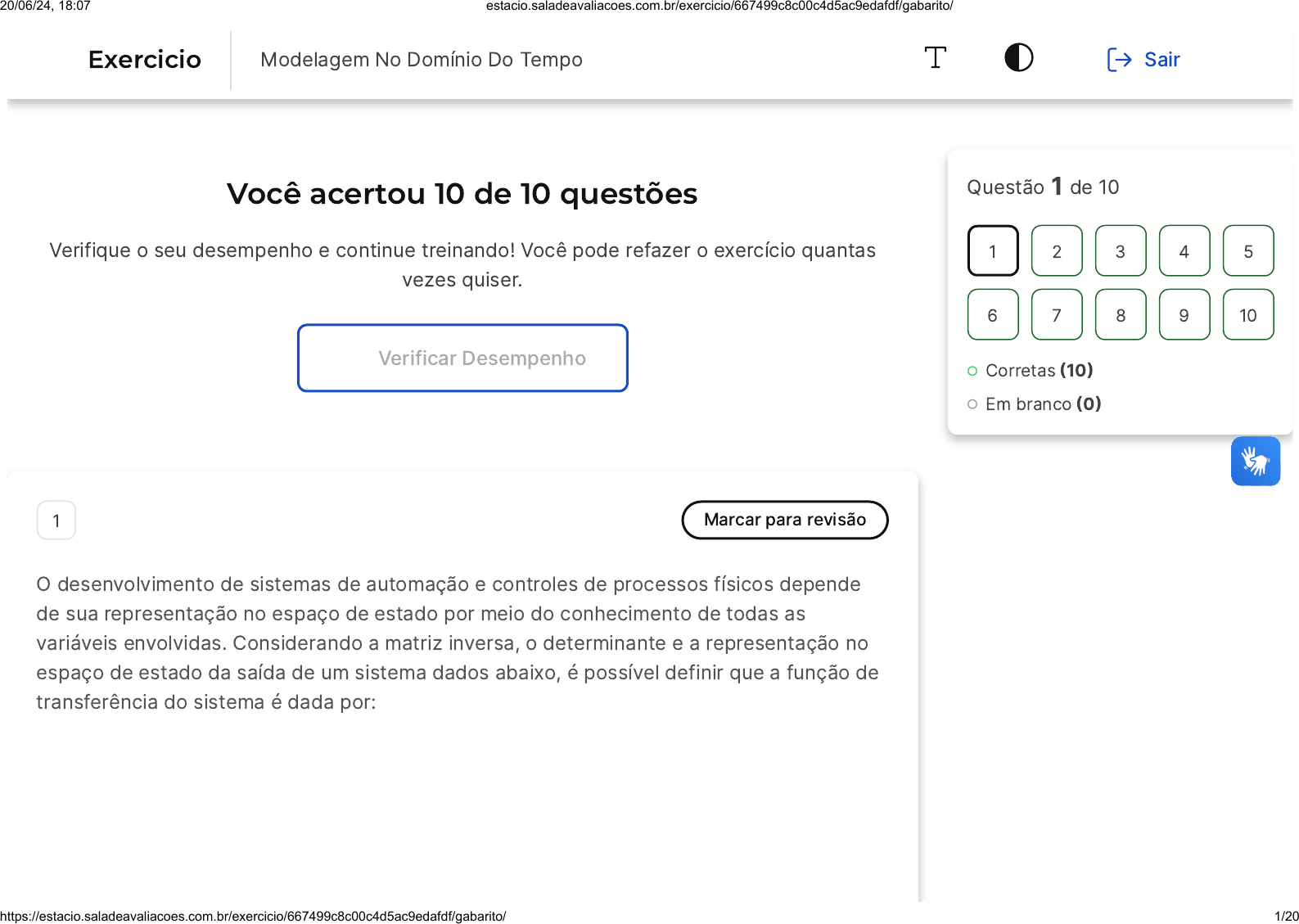 Você acertou 10 de 10 questões Verifique o seu desempenho e continue treinando! Você pode refazer o exercício quantas vezes quiser. Verificar Desempenho 1 Marcar para revisão O desenvolvimento de sistemas de automação e controles de processos físicos depende de sua representação no espaço de estado por meio do conhecimento de todas as variáveis envolvidas. Considerando a matriz inversa, o determinante e a representação no espaço de estado da saída de um sistema dados abaixo, é possível definir que a função de transferência do sistema é dada por: Questão 1 de 10 Corretas �10� Em branco �0� 1 2 3 4 5 6 7 8 9 10 Exercicio Modelagem No Domínio Do Tempo Sair 20/06/24, 18:07 estacio.saladeavaliacoes.com.br/exercicio/667499c8c00c4d5ac9edafdf/gabarito/ https://estacio.saladeavaliacoes.com.br/exercicio/667499c8c00c4d5ac9edafdf/gabarito/ 1/20 A B C D E s s2+2s+2 1 s2+2s+2 1 2s+2 1 s2+2 1 s2+2s Resposta correta Parabéns, você selecionou a alternativa correta. Confira o gabarito comentado! Gabarito Comentado 20/06/24, 18:07 estacio.saladeavaliacoes.com.br/exercicio/667499c8c00c4d5ac9edafdf/gabarito/ https://estacio.saladeavaliacoes.com.br/exercicio/667499c8c00c4d5ac9edafdf/gabarito/ 2/20 Gabarito: Justificativa: Por definição, tem-se que: Observando os parâmetros dados, pode-se definir que: Como é igual a: Então: Como: Logo: 1 s2+2s+2 C(sI −A)−1 20/06/24, 18:07 estacio.saladeavaliacoes.com.br/exercicio/667499c8c00c4d5ac9edafdf/gabarito/ https://estacio.saladeavaliacoes.com.br/exercicio/667499c8c00c4d5ac9edafdf/gabarito/ 3/20 A B C D E 2 Marcar para revisão O desenvolvimento de sistemas de automação e controles de processos físicos depende de sua representação no espaço de estado por meio do conhecimento de todas as variáveis envolvidas. O subconjunto de variáveis de um sistema físico que permite conhecer o comportamento de um sistema e é definido a partir de todas as variáveis do sistema é definido como: Condição inicial Variável de entrada Variável de saída Variável de espaço Variável de estado 20/06/24, 18:07 estacio.saladeavaliacoes.com.br/exercicio/667499c8c00c4d5ac9edafdf/gabarito/ https://estacio.saladeavaliacoes.com.br/exercicio/667499c8c00c4d5ac9edafdf/gabarito/ 4/20 Resposta correta Parabéns, você selecionou a alternativa correta. Confira o gabarito comentado! Gabarito Comentado A alternativa correta é a "Variável de estado". Isso porque, no contexto de sistemas de automação e controles de processos físicos, a variável de estado é um subconjunto de variáveis que define as variáveis do sistema físico, permitindo assim conhecer o comportamento do sistema. As outras opções apresentadas possuem significados diferentes: "Condição inicial" define as condições iniciais de um sistema quando do início de seu funcionamento; "Variável de entrada" define as variáveis de entrada de um sistema; "Variável de saída" define as variáveis de saída de um sistema; e "Variável de espaço" não é aplicável neste contexto. 3 Marcar para revisão O desenvolvimento de sistemas de automação e controles de processos físicos depende de sua representação no espaço de estado por meio do conhecimento de todas as variáveis envolvidas. Considerando a matriz inversa, o determinante e a representação no espaço de estado da saída de um sistema dados abaixo, é possível afirmar que a relação é igual a:C(sI −A)−1 20/06/24, 18:07 estacio.saladeavaliacoes.com.br/exercicio/667499c8c00c4d5ac9edafdf/gabarito/ https://estacio.saladeavaliacoes.com.br/exercicio/667499c8c00c4d5ac9edafdf/gabarito/ 5/20 A B C D E [ ]s+2 Δ 1 Δ [ ]−2 Δ 1 Δ [ ]s Δ s Δ [ ]s+2 Δ s Δ [ ]s Δ 1 Δ 20/06/24, 18:07 estacio.saladeavaliacoes.com.br/exercicio/667499c8c00c4d5ac9edafdf/gabarito/ https://estacio.saladeavaliacoes.com.br/exercicio/667499c8c00c4d5ac9edafdf/gabarito/ 6/20 Resposta correta Parabéns, você selecionou a alternativa correta. Confira o gabarito comentado! Gabarito Comentado Gabarito: Justificativa: Observando os parâmetros dados, pode-se definir que: [ ]s+2 Δ 1 Δ 4 Marcar para revisão O desenvolvimento de sistemas de automação e controles de processos físicos depende de sua representação no espaço de estado por meio do conhecimento de todas as variáveis envolvidas. Para que a conversão de espaço de estado em função de 20/06/24, 18:07 estacio.saladeavaliacoes.com.br/exercicio/667499c8c00c4d5ac9edafdf/gabarito/ https://estacio.saladeavaliacoes.com.br/exercicio/667499c8c00c4d5ac9edafdf/gabarito/ 7/20 A B C D E transferência seja possível, é fundamental a determinação do termo . Para auxiliar no desenvolvimento desse cálculo, é essencial o uso do(a): (sI −A)−1 Matriz identidade Determinante Variável de estado Variável de fase Derivada da variável de estado Resposta correta Parabéns, você selecionou a alternativa correta. Confira o gabarito comentado! Gabarito Comentado A matriz identidade é a resposta correta. Ela é uma ferramenta matemática que permite a operacionalização algébrica de matrizes, sendo essencial para a determinação do termo no desenvolvimento de sistemas de automação e controles de processos físicos. As outras opções, apesar de também serem conceitos importantes na matemática e na física, não são diretamente responsáveis por auxiliar (sI −A)−1 20/06/24, 18:07 estacio.saladeavaliacoes.com.br/exercicio/667499c8c00c4d5ac9edafdf/gabarito/ https://estacio.saladeavaliacoes.com.br/exercicio/667499c8c00c4d5ac9edafdf/gabarito/ 8/20 A B no cálculo desse termo específico. O determinante, por exemplo, é um parâmetro necessário para a definição da possibilidade de inversão de uma matriz. A variável de estado e a variável de fase são conjuntos de variáveis que definem um sistema, e a derivada da variável de fase é a derivação da variável de fase. 5 Marcar para revisão Representar um sistema no espaço de estado apresenta uma grande importância no desenvolvi