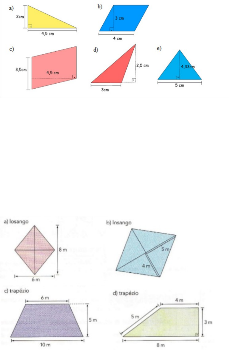 1) Calcule a área dos polígonos: 2)Determine a área das figuras abaixo: a. Triângulo cuja base mede 8cm e altura mede 5,2 cm b. Paralelogramo cuja a base mede 10 cm e a altura é a metade da medida da base c. Triângulo de base 18 cm e altura igual a 2/3 da medida da base. d. Trapézio de base menor igual a 2cm, base maior igual a 3cm e a altura igual a 10cm e. Trapézio cuja a base maior mede 24 cm, base menor é igual a 16 cm e a medida da altura é igual à metade da medida da base menor. 3)Calcule a área dos polígonos: image1.png image2.png