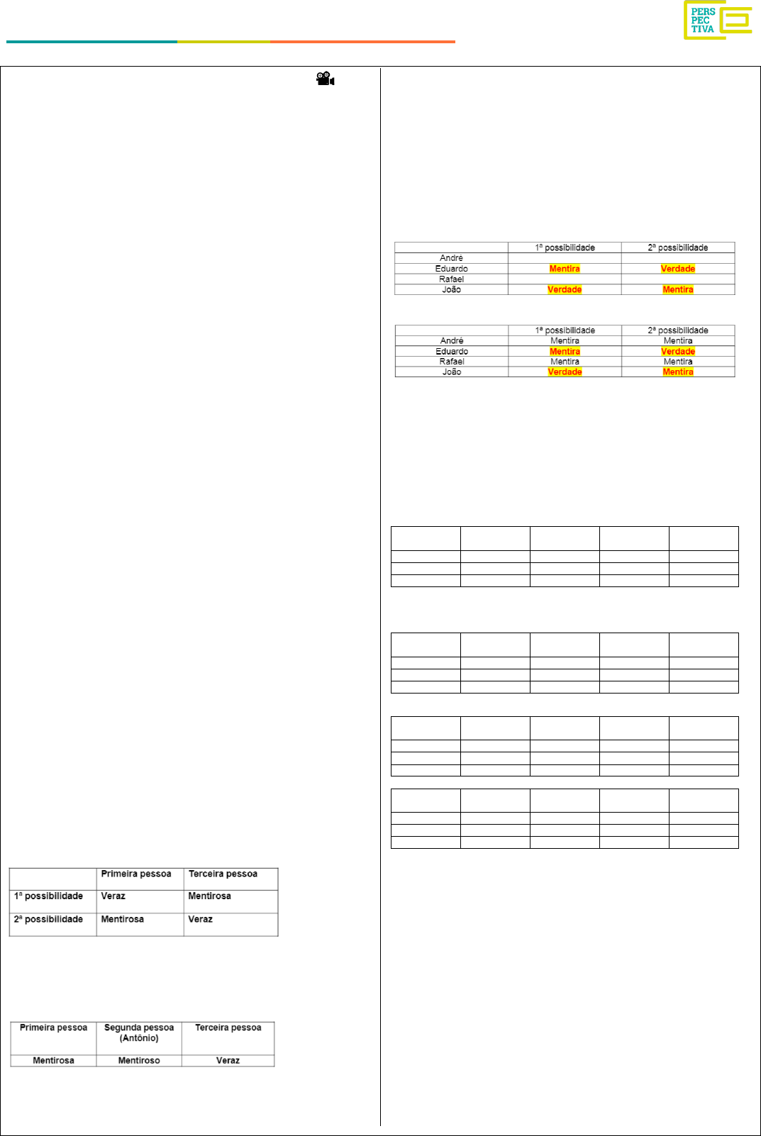 RACIOCÍNIO LOGICO MÓDULO 06 SOLDADO COMBATENTE 1 Todas os exercícios da apostila que tiverem essa câmera , estão gravados em vídeo para você. Nossos professores resolveram as questões, comentando cada detalhe para te ajudar na hora de estudar. Muitas questões trazem dicas preciosas. Não deixe de assistir aos vídeos dentro da plataforma on-line do Perspectiva e bons estudos! Verdades e mentiras Nas provas de concursos, temos questões em que as bancas exigem dos candidatos uma análise referente às declarações realizadas em uma determinada situação, procurando, na maioria das vezes, saber quem é o mentiroso e até mesmo o culpado de um determinado delito. Nas questões com declarações em que existem pessoas que mentem e falam a verdade, podemos perceber a existência de uma contradição entre declarações, pois não há como adivinhar quem mente ou quem fala a verdade. Devemos aplicar o que foi ensinado no início referente às três leis do pensamento, em que uma proposição “declaração” não pode ser verdadeira (V) e falsa (F) ao mesmo tempo, daí teremos uma possível valoração para estas declarações. Deve-se começar a análise pelas afirmativas que carreguem mais informações. Em cada problema, você deverá interpretar e fazer uma análise lógica das situações, identificando possíveis contradições para, no fim, apresentar uma resposta coerente. Vamos começar com a situação preferida da FGV. Depois colocarei uma exposição geral da matéria para que tenhamos condições de resolver qualquer questão. Ex 1: Guilherme diz: “Thiago é culpado”. Vitor diz: “Guilherme está mentindo”. Ora, se Guilherme estiver dizendo a verdade, Vitor estará mentindo ao chamar Guilherme de mentiroso. Se Guilherme estiver mentindo, Vitor estará dizendo a verdade ao chamar Guilherme de mentiroso. Conclusão: Se em alguma questão uma pessoa A chamar a pessoa B de mentirosa, ou dizer que ela não tem razão, ou que está enganada, teremos uma pessoa veraz e uma pessoa mentirosa. É impossível termos dois verazes ou dois mentirosos. Esta é sem dúvida a maior dica para resolver questões sobre verdades e mentiras. Ex 2: Perguntou-se a três pessoas qual delas se chamava Antônio. A primeira pessoa respondeu: “Eu sou Antônio”. A seguir, a segunda pessoa respondeu: “Eu não sou Antônio”. Finalmente, a terceira respondeu: “A primeira pessoa a responder não disse a verdade”. Sabendo-se que apenas uma delas se chama Antônio e que duas delas mentiram, é correto concluir que Antônio: a) foi o primeiro a responder e que somente ele disse a verdade. b) foi o primeiro a responder e que a segunda pessoa foi a única a dizer a verdade. c) foi o primeiro a responder e que a terceira pessoa foi a única a dizer a verdade. d) foi o segundo a responder e que somente ele disse a verdade. e) foi o segundo a responder e que a terceira pessoa foi a única a dizer a verdade. Resolução: Temos o seguinte texto: Primeiro: “Eu sou Antônio”. Segundo: “Eu não sou Antônio”. Terceiro: “A primeira pessoa a responder não disse a verdade”. A terceira pessoa chamou a primeira de mentirosa. Ora, vimos que quando esse fato ocorre é impossível que ambos sejam mentirosos ou ambos sejam verazes. Dessa forma, ou o primeiro é mentiroso, ou o terceiro é mentiroso, mas não ambos. O texto nos informou que das três pessoas apenas duas mentiram. Sabemos que entre o primeiro e o terceiro há apenas um mentiroso. Concluímos então que o outro mentiroso, com certeza, é o segundo. Segundo: “Eu não sou Antônio”. Sabemos que o segundo é mentiroso, portanto ele se chama Antônio. Consequentemente, o primeiro também é mentiroso, pois ele não se chama Antônio (Antônio é o segundo) e o terceiro diz a verdade. Alternativa correta : E Ex 3: ) Um crime é cometido por uma pessoa e há quatro suspeitos: André, Eduardo, Rafael e João. Interrogados, eles fazem as seguintes declarações: André: “Eduardo é o culpado”. Eduardo: “João é o culpado”. Rafael: “Eu não sou culpado”. João: “Eduardo mente quando diz que eu sou culpado”. Sabendo que apenas um dos quatros disse a verdade, o culpado: a) é certamente André. b) é certamente Eduardo. c) é certamente Rafael. d) é certamente João. e) não pode ser determinado com essas informações Resolução: Vejamos a frase de João... João: “Eduardo mente quando diz que eu sou culpado”. Como João afirma que Eduardo mente, podemos concluir que um dos dois diz a verdade enquanto o outro mente. Como o texto afirma que apenas um dos quatro disse a verdade, concluímos que André e Rafael são mentirosos. Rafael é mentiroso!! Vejamos o que ele diz... Rafael: “Eu não sou culpado”. Como ele é mentiroso e ele afirma que não é o culpado, concluímos que ele é o culpado. Alternativa C Vocês já devem ter percebido que a melhor forma para resolver essas questões é montando uma tabela, vocês também podem colocar as informações (premissas) na parte superior e na lateral os nomes das pessoas envolvidas, daí você precisa chutar um culpado e ver se as premissas vão bater com o culpado que você escolheu, caso não dê certo é necessário escolher outro culpado e repetir o processo. Observe como ficaria o exemplo anterior. 1° passo: coloquei a fala de cada um já interpretada na parte superior. Culpado Edu é culpado João é o culpado Rafa não é culpado João não é culpado 2° passo: vou escolher um culpado e vou distribuir os valores lógicos, só pode aparecer um V de acordo com o enunciado “Sabendo que apenas um dos quatros disse a verdade” Culpado Edu é culpado João é o culpado Rafa não é culpado João não é culpado Edu V F V Repare que já apareceu dois “V”, não precisa nem continuar, pode escolher outo culpado e repetir o processo. Culpado Edu é culpado João é o culpado Rafa não é culpado João não é culpado Edu V F V André F F V V Novamente temos