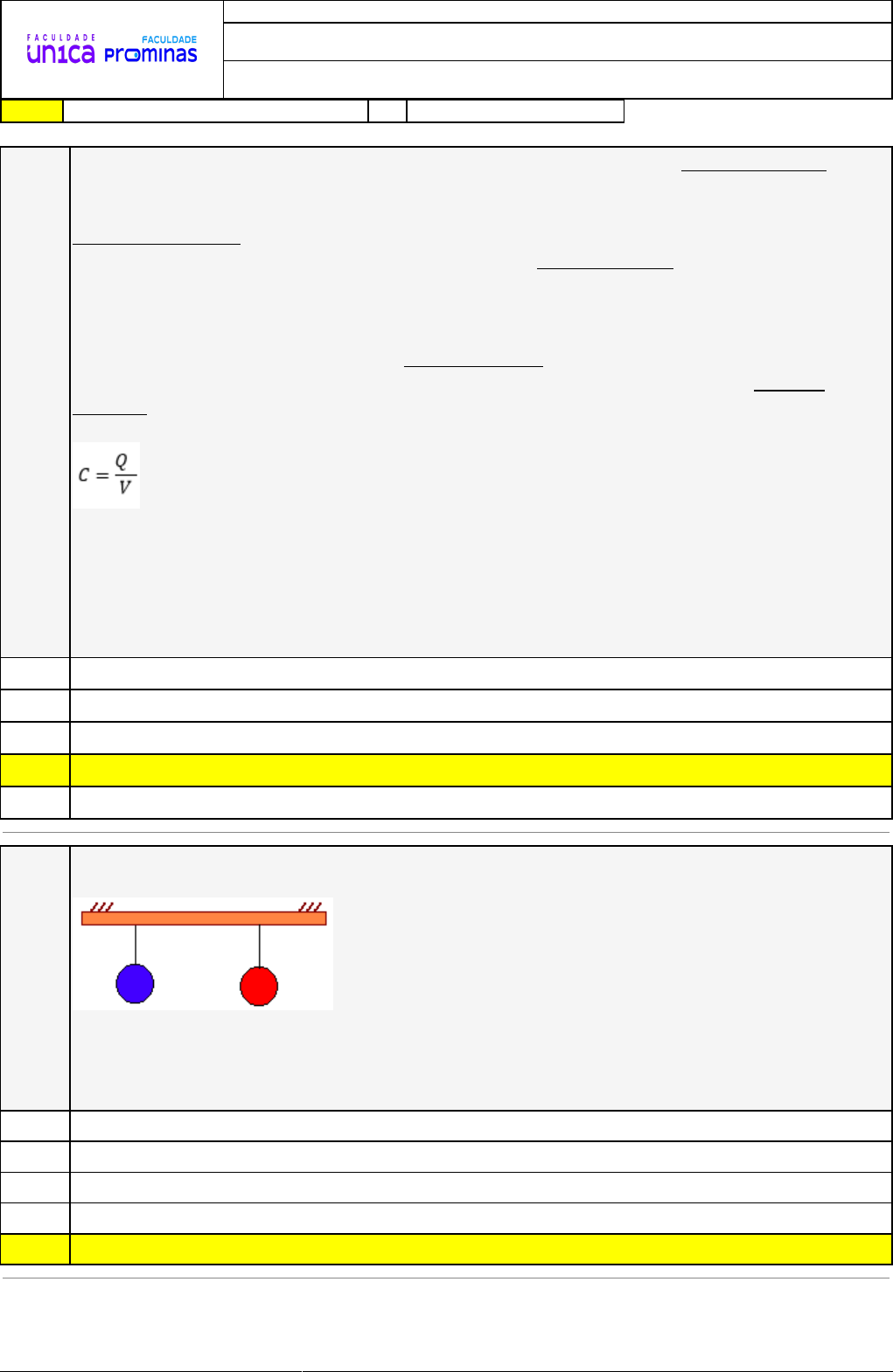 19/06/2024 15:43:21 1/4 REVISÃO DE SIMULADO Nome: ROBERTO DA SILVA JUNIOR Disciplina: Física III Respostas corretas são marcadas em amarelo X Respostas marcardas por você. Questão 001 Capacitores são dispositivos utilizados para o armazenamento de cargas elétricas. Existem capacitores de diversos formatos e capacitâncias. Não obstante, todos compartilham algo em comum: são formados por dois terminais separados por algum material dielétrico. Os capacitores são utilizados em diversas aplicações tecnológicas. Quando ligados a uma diferença de potencial, um campo elétrico forma-se entre suas placas, fazendo com que os capacitores acumulem cargas em seus terminais, uma vez que o dielétrico em seu interior dificulta a passagem das cargas elétricas através das placas. A propriedade que mede a eficiência de um capacitor em armazenar cargas é a capacitância. A capacitância é uma grandeza física medida em unidades de Coulomb por Volt, mais conhecida como Farad (F), em homenagem ao físico inglês Michael Faraday (1791-1867). Dizemos que 1 Farad é equivalente a 1 Coulomb por Volt. A fórmula utilizada para calcular a capacitância é esta, confira: C — Capacitância (F) Q — carga elétrica (C) V— tensão elétrica (V) Um capacitor consegue armazenar cargas de até 1nC para uma diferença de potencial entre suas placas de 1mV. Indique, entre as alternativas abaixo, o módulo da capacitância desse dispositivo: A) 4. 10-5 F. B) 5.10-6 F. C) 1.10-3 F. X D) 1.10-6 F. E) 3.10-3 F. Questão 002 (FUVEST). Duas pequenas esferas metálicas idênticas, inicialmente neutras, encontram- se suspensas por fios inextensíveis e isolantes. Um jato de ar perpendicular ao plano da figura é lançado durante certo intervalo de tempo sobre as esferas. Observa-se então que ambas as esferas estão fortemente eletrizadas. Quando o sistema alcança novamente o equilíbrio estático, podemos afirmar que as tensões nos fios A) aumentaram e as esferas se atraem. B) diminuíram e as esferas se repelem. C) não sofreram alterações. D) diminuíram e as esferas se atraem. X E) aumentaram e as esferas se repelem. 19/06/2024 15:43:21 2/4 Questão 003 Considere as afirmações: I. Percorrendo-se uma linha de força no seu sentido, o potencial elétrico, ao longo de seus pontos, aumenta. II. As linhas de força são paralelas às superfícies equipotenciais. III. Num campo elétrico uniforme, as superfícies equipotenciais são esféricas e concêntricas. A) I. B) I e II. C) todas. X D) nenhuma. E) II. Questão 004 Considere as seguintes afirmativas sobre o campo de uma carga puntiforme: I) As superfícies equipotenciais são esféricas. II) As linhas de força são perpendiculares às superfícies equipotenciais. III) A intensidade do vetor campo elétrico varia inversamente com a distância do ponto à carga. São corretas: A) todas. X B) I e II. C) nenhuma. D) II e III. E) I e III. Questão 005 Leia as afirmações a seguir a respeito da energia potencial elétrica. I – A energia potencial elétrica é diretamente proporcional ao produto das cargas elétricas. II – A energia potencial elétrica é inversamente proporcional ao quadrado da distância entre as cargas. III – A determinação da energia independe do caminho seguido pela carga. É verdadeiro o que se afirma em: A) II. B) II e III. C) I, II e III. D) I. X E) I e III. 19/06/2024 15:43:21 3/4 Questão 006 Toda carga elétrica produz um campo elétrico que se permeia pelo espaço, sendo capaz de produzir forças de atração ou repulsão sobre outras cargas elétricas. A interação entre cargas, portanto, dá origem a uma energia potencial, que pode ser transformada em energia cinética, no caso em que uma dessas cargas seja móvel, por exemplo. A expressão matemática para a energia potencial elétrica (EP) é dada pela expressão a seguir e ilustrada na imagem abaixo. Leia as afirmações a seguir a respeito da energia potencial elétrica. A energia potencial elétrica é diretamente proporcional ao produto das cargas elétricas. A energia potencial elétrica é inversamente proporcional ao quadrado da distância entre as cargas. A determinação da energia independe do caminho seguido pela carga. É verdadeiro o que se afirma em: A) II. B) I e III. C) I. X D) II e III. E) I, II e III. Questão 007 A respeito da capacitância e da energia potencial elétrica armazenada em um capacitor, julgue os itens a seguir: I. A capacitância é diretamente proporcional à permissividade elétrica do meio onde está o capacitor. II. Quanto maior a distância entre as placas de um capacitor, maior será sua capacitância. III. A energia potencial elétrica armazenada em um capacitor não depende da capacitância, mas apenas da diferença de potencial estabelecida entre as placas de um capacitor. IV. Os desfibriladores são exemplos de aplicação do estudo de capacitores. V. A área das placas paralelas que compõem o capacitor é diretamente proporcional à capacitância. Está correto o que se afirma em: A) I, II, III, IV e V. B) I, II, III e V. C) I, II, IV e V. D) III, IV e V. X E) I, IV e V. 19/06/2024 15:43:21 4/4 Questão 008 Chama-se Campo Elétrico o campo estabelecido em todos os pontos do espaço sob a influência de uma carga geradora de intensidade Q, de forma que qualquer carga de prova de intensidade q fica sujeita a uma força de interação (atração ou repulsão) exercida por Q. Já uma carga de prova, é definida como um corpo puntiforme de carga elétrica, utilizado para detectar a existência de um campo elétrico, também possibilitando o cálculo de sua intensidade. Quando uma carga elétrica é abandonada em repouso em uma região com campo elétrico, desprezando os efeitos da gravidade e de quaisquer forças dissipativas, podemos dizer que: A) sua energia cinética permanece constante, já que a força resultante sobre a carga é nula. B) sua energia potencial decresce enquanto sua energia cinética aumenta, por ca