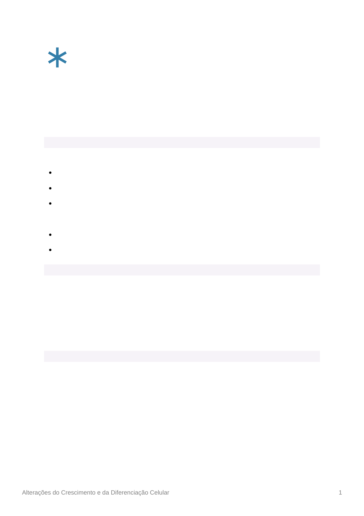 Alterações do Crescimento e da Diferenciação Celular 1 Alterações do Crescimento e da Diferenciação Celular Causas Estímulos: Por lesão Por morte celular Deformação dos tecidos Controle: Mecanismo controlado por fatores químicos e pelo ambiente Aumento de fatores estimulantes ou deficiência no mecanismo de controle Alterações Intra-uterinas Agenesia: ausência de iniciação do desenvolvimento (anencefalia) Aplasia: ausência de formação, apenas rudimentos do órgão e tecido (aplasia de medula óssea) Hipoplasia: Deficiência de formação, órgão menor e com função reduzida (hipoplasia testicular e ovariana) Atrofia “Redução do tamanho, volume e função celular decorrente da perda de substância das células levando a diminuição do órgão” Há um aumento da síntese de enzimas no lisossomo, que degradam proteínas celulares As alterações celular na atrofia são todas idênticas em todas as causas, há uma diminuição no tamanho das células e das organelas, uma redução da necessidade metabólica da célula apenas para o suficiente para sobreviver, por exemplo, o Alterações do Crescimento e da Diferenciação Celular 2 músculo atrófico apresenta menos mitocôndrias, miofilamentos e retículo endoplasmático granular A atrofia pode se dar por meio de: Diminuição do trabalho (músculo esquelético); Perda de inervação (lesão de feixe medular); Diminuição do suprimento sanguíneo (isquemia) Diminuição de sinais tróficos (pós-menopausa) Envelhecimento (apoptose) Deficiência de nutrientes (anemia) Por compressão (derrames cavitários) Hipertrofia “Aumento do tamanho e volume celular resultando no aumento de tamanho do órgão como um todo, podendo ser proveniente da demanda funcional ou hormonal” Não surgimento de novas células, apenas células maiores. Na hipertrofia, não ocorre divisão celular e há um bloqueio da fase G2 Por ser fisiológica (massa muscular, gravidez), quando há uma respsota do aumento da demanda metabólica ou patológica (hipertrofia ventricular, hipertireoidismo), quando há uma sobrecarga hemodinâmica crônica Na hipertrofia muscular do exercício, há aumento da síntese de proteínas e filamentos, atingindo o equilíbrio entre a demanda e a capacidade funcional da célula. O aumento de miofilamentos promove uma maior carga de trabalho São sintomas do hipertireoidismo: aumento da glândula, aumento da produção de T3 e T4, batimento cardíaco acelerado ou irregular, perda de peso, nervosismo ou irritabilidade, olhos saltados, excesso de suor, mudanças nos padrões menstruais, aumento da sensibilidade ao calor, aumento do apetite, fadiga, astenia, dificuldade para dormir, pele grossa e cabelos finos e frágeis. No macrófago, há hipertrofia no processo de fagocitose, devido ao aumento da atividade enzimático dentro dos lisossomas Hiperplasia “Aumento do número de células e do tamanho dos órgãos. Aumento do ritmo da divisão celular com manutenção do padrão morfológico celular” Alterações do Crescimento e da Diferenciação Celular 3 Há um bloqueio da fase M e a célula não irá se diferenciar. O controle do estímulo diferencia a hiperplasia do câncer. Pode ser fisiológica (aumento do útero na gravidez) ou patológica (cisto mamário, próstata) Como exemplos de hiperplasia fisiológica temos: Hiperplasia hormonal: aumento na capacidade funcional do tecido quando necessário (proliferação do epitélio glandular da mama feminina na puberdade e durante a gravidez) Hiperplasia compensatória: aumento da massa tecidual após dano ou ressecção (regeneração do fígado) A hiperplasia patológica é causada por aumento de estímulos hormonais e de fatores de crescimento, envolve sinais de transcrição, tradução e ativação de sinais de transcrição de proteínas ligadas ao ciclo celular. Exemplos: hiperplasia do endométrio, próstata ou viral No HPV, há lesões múltiplas (pápulas circunscritas), localizadas ou difusas e de tamanho variável. Pode também aparecer como lesão única Metaplasia “Substituição de um tecido adulto (epitelial ou mesenquimal) por outro tecido adulto, originando um novo epitélio” Alterações do Crescimento e da Diferenciação Celular 4 São causadas por agressões prolongas, em resposta ao calor e substâncias químicas, resposta a inflamação crônica. Podem predispor ao câncer A metaplasia colunar para escamosa acontece em fumantes, com a substituição do epitélio colunar da traqueia e brônquios por epitélio pavimento estratificado Displasia “Organização anormal ou diferenciação desordenada de células ou tecidos presentes em um órgão” Nesse caso, há um crescimento desordenado, que resulta em perda da uniformidade das células individuais, assim como a perda de sua orientação arquitetural. Os núcleos ficam hipercromáticos, grandes com grande razão núcleo/citoplasma Há maior presença de figuras mitóticas fora da camada basal de epitélios Pode ser precursora da transformação maligna, mas nem sempre progride para o câncer Como causas temos: Ação mecânica: início precoce da atividade sexual Ação hormonal: displasia de ductos mamários, tumores estrôgeno-dependentes Ação por agentes biológicos: papilomavírus humanos A displasia pode ser considera leve, moderada ou severa Alterações do Crescimento e da Diferenciação Celular 5