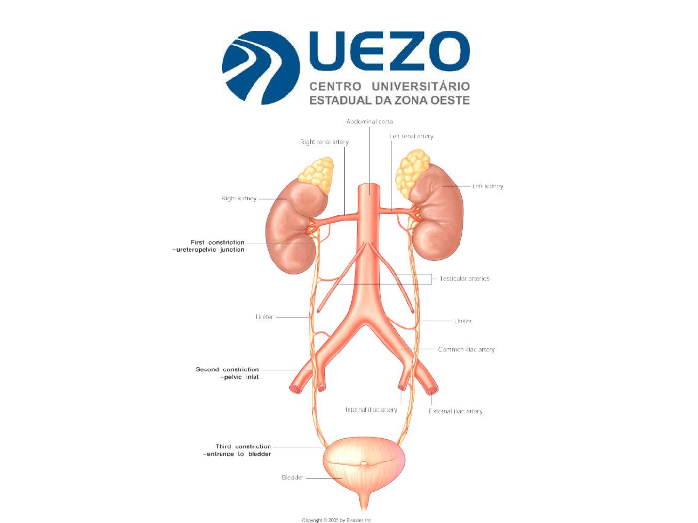 Sistema Urinário • Divisão topográfica • Organização • Órgãos do sistema urinário Rossana Soletti rossanasoletti@gmail.com ÓRGÃOS do SISTEMA URINÁRIO 2 RINS 2 URETERES 1 BEXIGA URINÁRIA 1 URETRA Produção de URINA Transporte até a BEXIGA Armazenamento temporário Transporte até o MEIO EXTERNO RINS Produção de urina e manutenção da homeostase Órgãos excretores seletivos RINS Localização anatômica Plano transpilórico (VL1) Cavidade abdominal Parede posterior Um em cada lado da coluna vertebral RINS Localização anatômica Parcialmente protegidos pelas costelas flutuantes Entre VT11-VT12 e VL3 RINS Localização anatômica Entre os músculos do dorso e a cavidade peritoneal Peritônio Órgãos RETROPERITONEAIS RINS Localização anatômica Estômago Fígado Baço Rim esquerdo Rim direito Aorta abdominal Veia cava inferior RINS Localização anatômica vista ANTERIOR Duas faces: - Anterior - Posterior Duas margens: - Medial - Lateral Duas extremidades (pólos): - Superior - Inferior RINS Seus envoltórios Gordura pararrenal Cápsula adiposa = Gordura perirrenal Fáscia renal Cápsula fibrosa RINS Estrutura interna Córtex renal Pirâmide renal (medula) Coluna renal Papila renal Secção frontal HILO RENAL Pelve renal Veia renal Artéria renal Ureter Ureter Artéria Veia Linfáticos Nervos Cálice maior Cálice menor Seio renal Córtex + medula = parênquima RINS Estrutura interna Veia renal esquerda Veia renal direita Artéria renal esquerda Artéria renal direita Veia cava inferior Aorta abdominal RINS Irrigação RINS Unidade funcional: o néfron Secção longitudinal de um CORPÚSCULO RENAL sangue túbulo renal NEFRON= glomérulo + túbulo RINS Irrigação Papila renal Seio renal Cálice renal menor Pelve renal Ureter HILO RENAL RINS Urina: da produção até o ureter Túbulo coletor Papila renal Cálice renal maior URETERES Transporta até a bexiga urinária ureter ureter Artéria e veia ilíaca comum URETERES Transporta até a bexiga urinária Diâmetro < 6mm Comprimento: 25-40 cm Região abdominal Região pélvica Região intramural URETERES Estreitamento pielo-uretral Estreitamento da flexura pélvica Estreitamento intra-mural URETERES e BEXIGA URINÁRIA v. ANT-LAT Até 500 ml urina ápice Ligamento Pubovesical medial ureteres uretra Trígono URETERES e BEXIGA URINÁRIA v. ANT-LAT v. ANT Trígono da bexiga Óstios ureterais Óstio interno da uretra URETRA BEXIGA URINÁRIA Organização ventro-dorsal das vísceras pélvicas medianas Hemisecções medianas FEM MASC BEXIGA URINÁRIA URETRA feminina x masculina Óstio interno da uretra Óstio externo da uretra URETRA MASCULINA Subdivisões: -prostática -membranosa -esponjosa/peniana Óstio externo da uretra Óstio externo da uretra URETRA Ostio externo da uretra